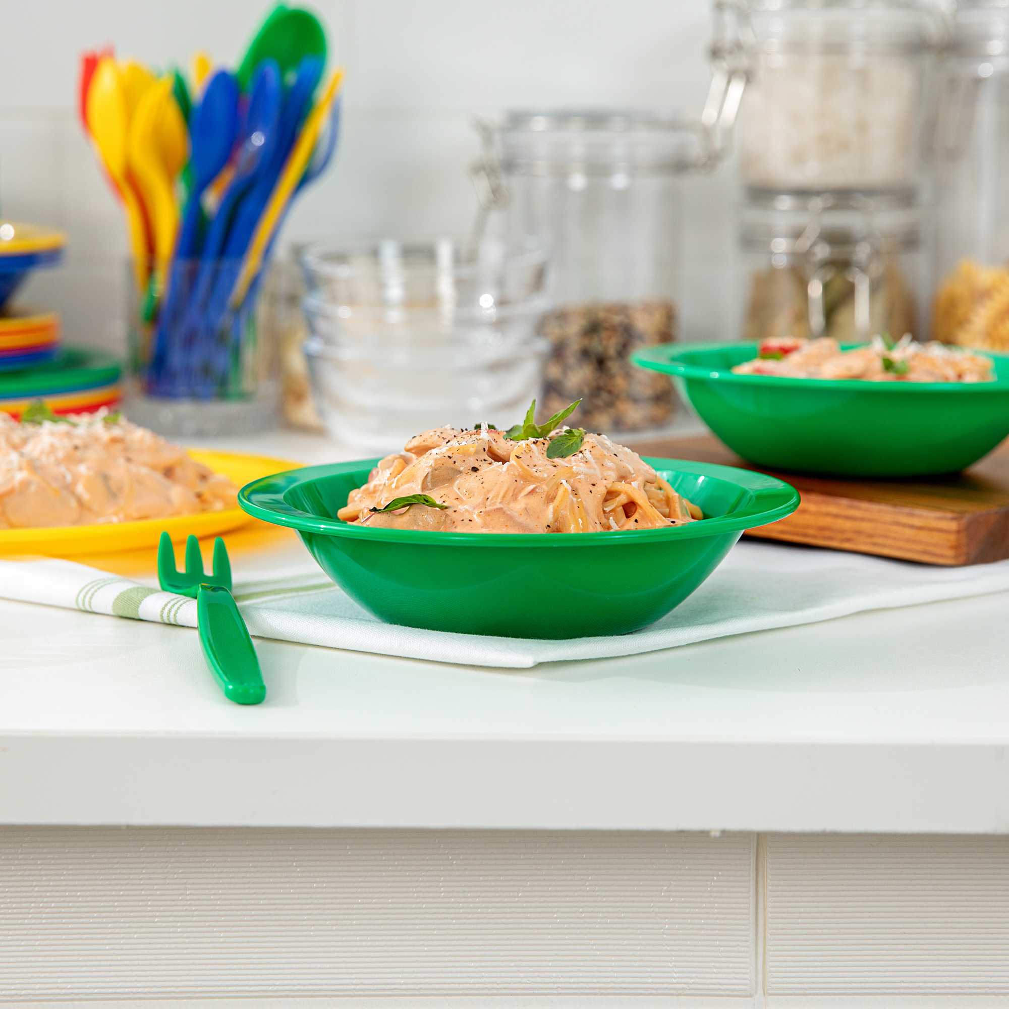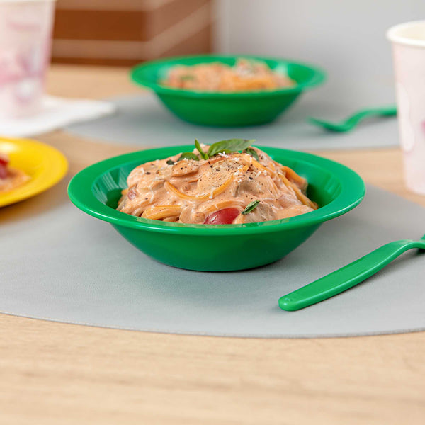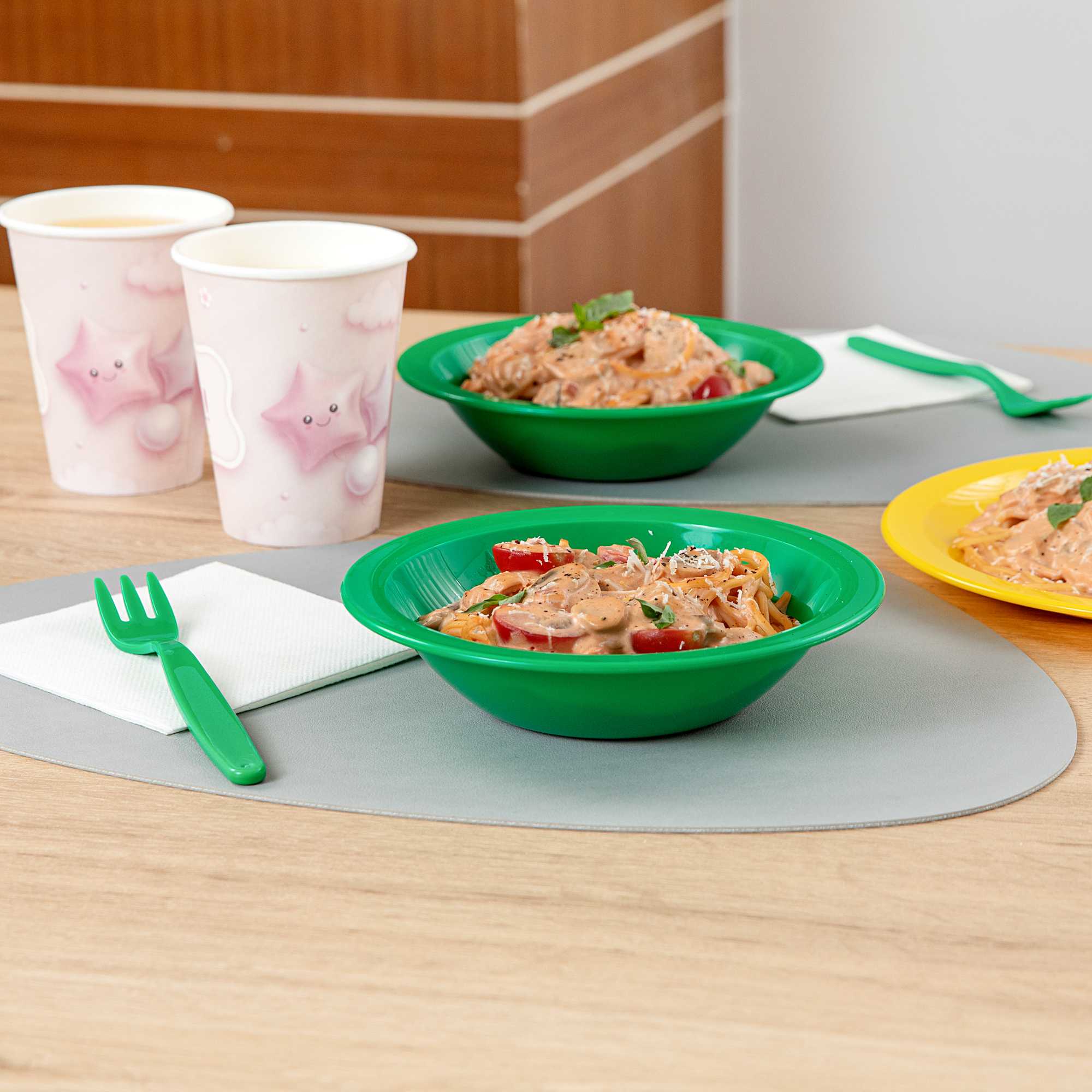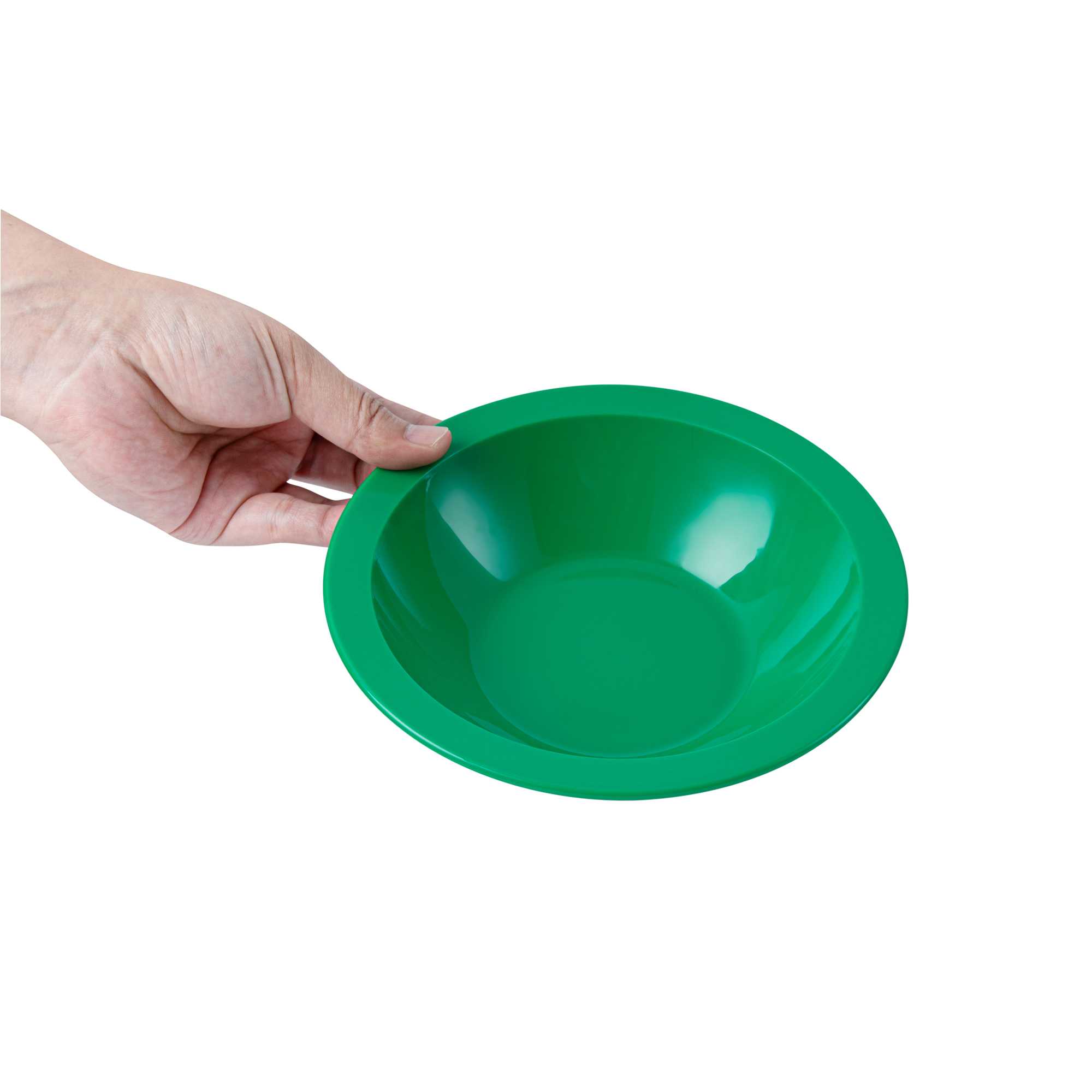 Enhance your dining experience with virtually unbreakable tableware. The RW Kids Shatterproof Round Plastic Bowl provides a safe and playful option for children's meals, featuring a durable plastic construction that ensures longevity in bustling foodservice settings. With its vibrant green color, this kids plastic bowl adds a touch of fun, perfect for schools and family-friendly restaurants. A 14-ounce capacity offers an ideal portion size, whether serving soups or cereals, while its lightweight design encourages self-feeding among young diners. The stackable construction maximizes storage efficiency, making it a practical choice for space-conscious kitchens. For added convenience, this unbreakable bowl is microwave-safe, simplifying reheating tasks in busy environments. Invest in reliable, child-friendly tableware that promises reduced replacement costs and operational efficiency. Sold in a 10 count box.