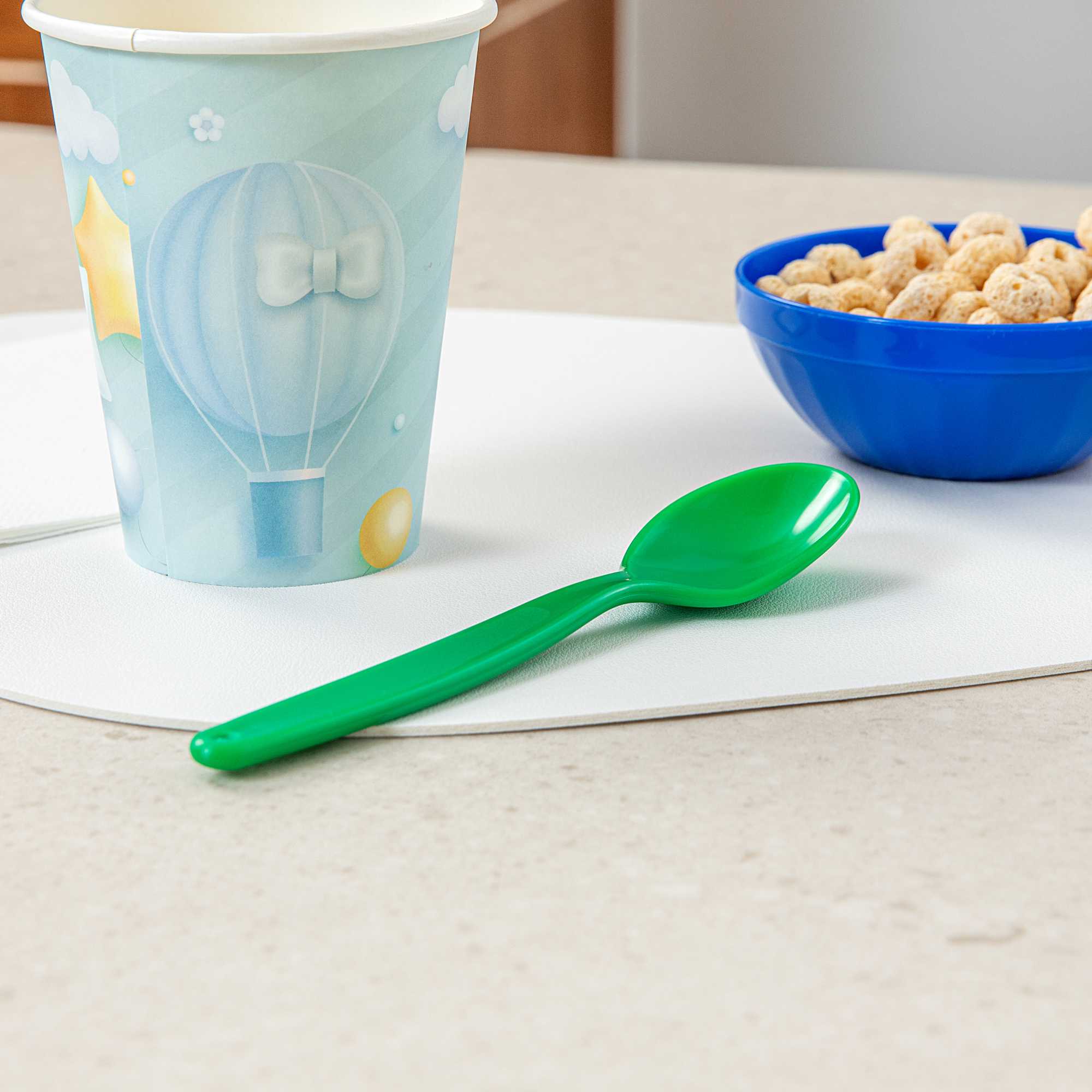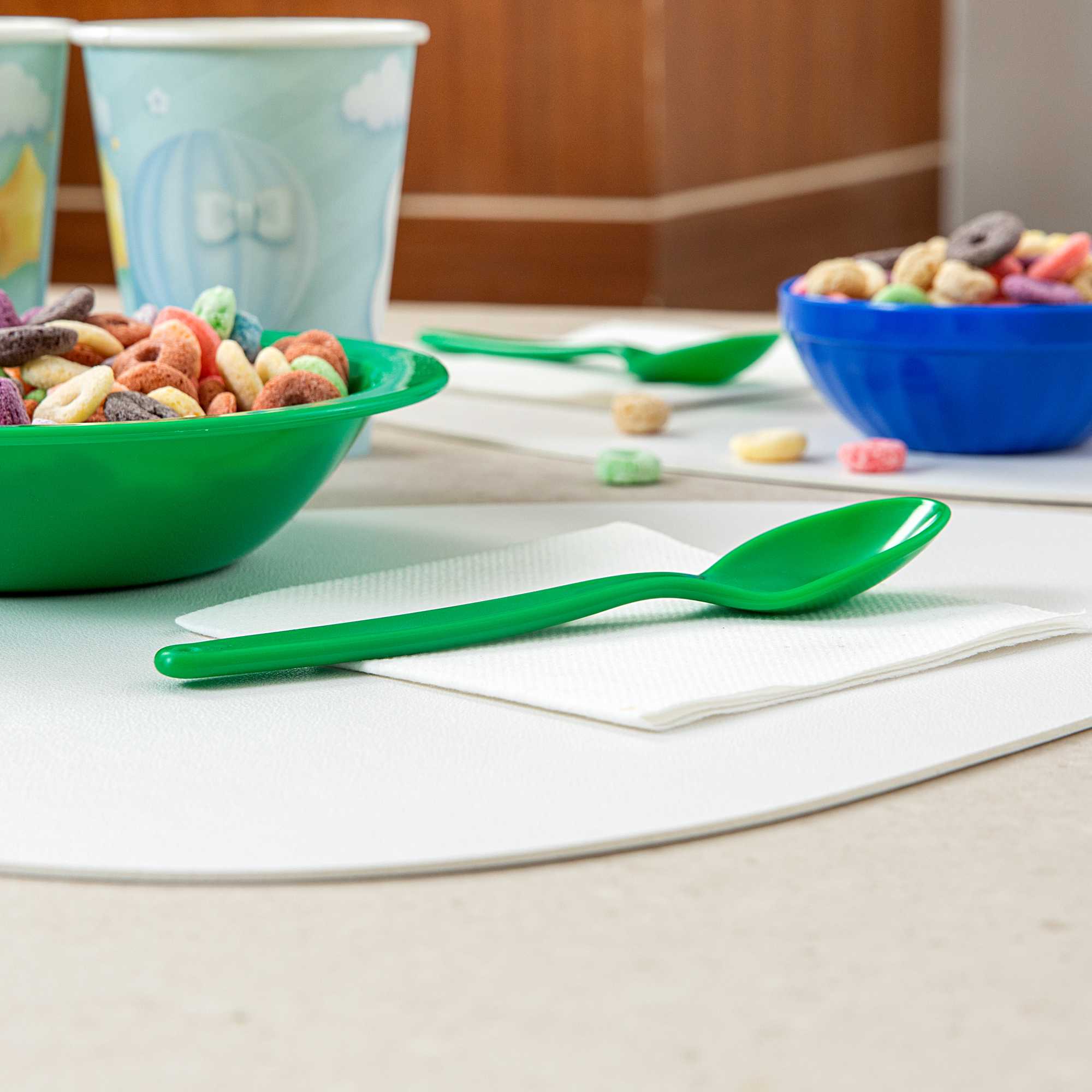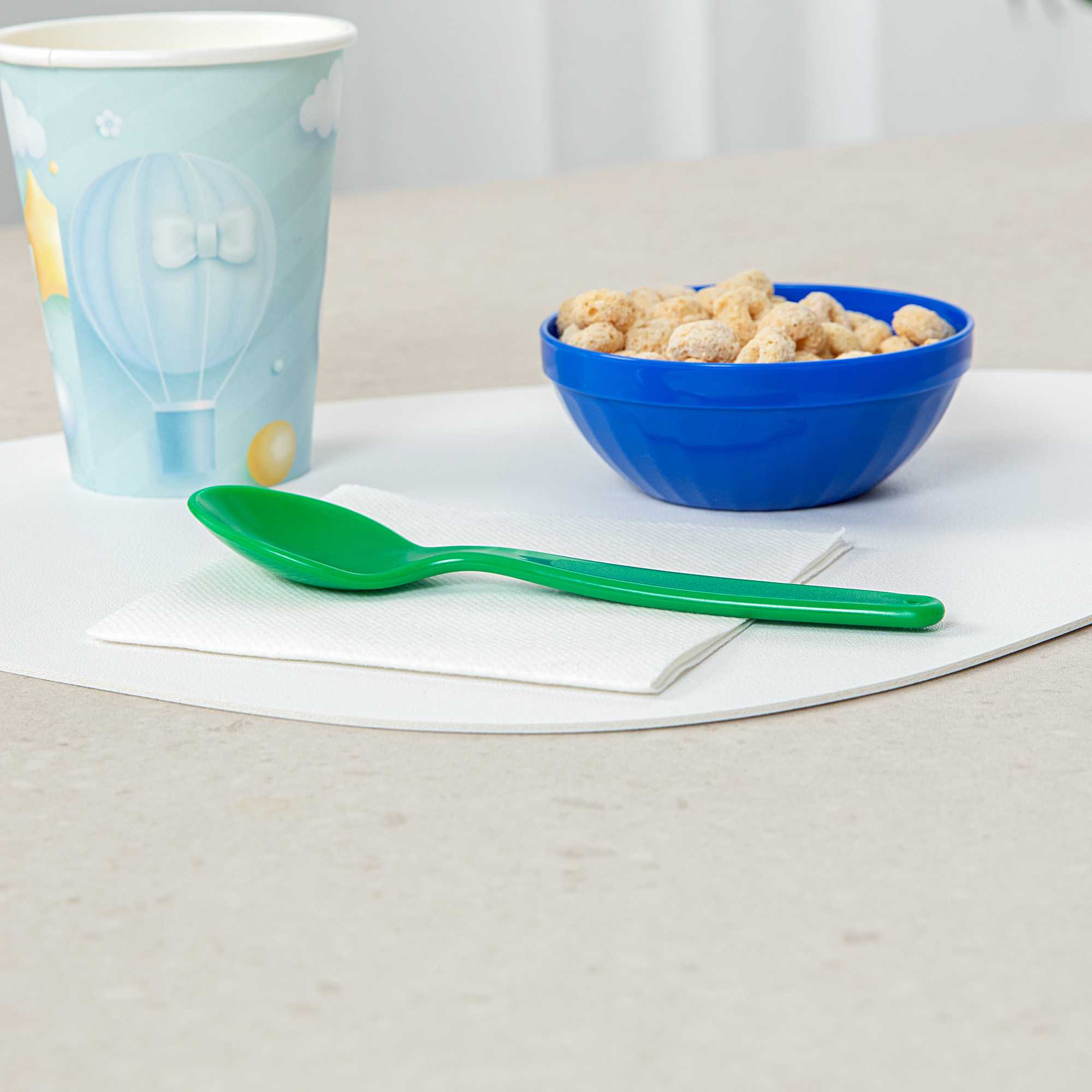 Brighten meal times with vibrant green plastic spoons. The RW Kids Green Plastic Spoon adds a playful touch to children’s meals while being lighter than metal utensils, making it ideal for teaching young diners how to handle cutlery. Its soft, durable plastic construction prevents damage to developing teeth, ensuring safe use in busy foodservice environments. Designed with an ergonomic handle, this kids plastic spoon provides a comfortable grip, reducing strain on young hands. For efficient and eco-friendly clean-up, these spoons are recyclable, supporting sustainable practices in schools and daycare centers. At 6 3/4 inches in length, these dishwasher-safe spoons simplify cleaning processes, making them perfect for high-volume settings where hygiene is a priority. Enhance your meal service with this convenient spoon option, especially suited for children’s parties or family-friendly events. Sold in a 10 count box.