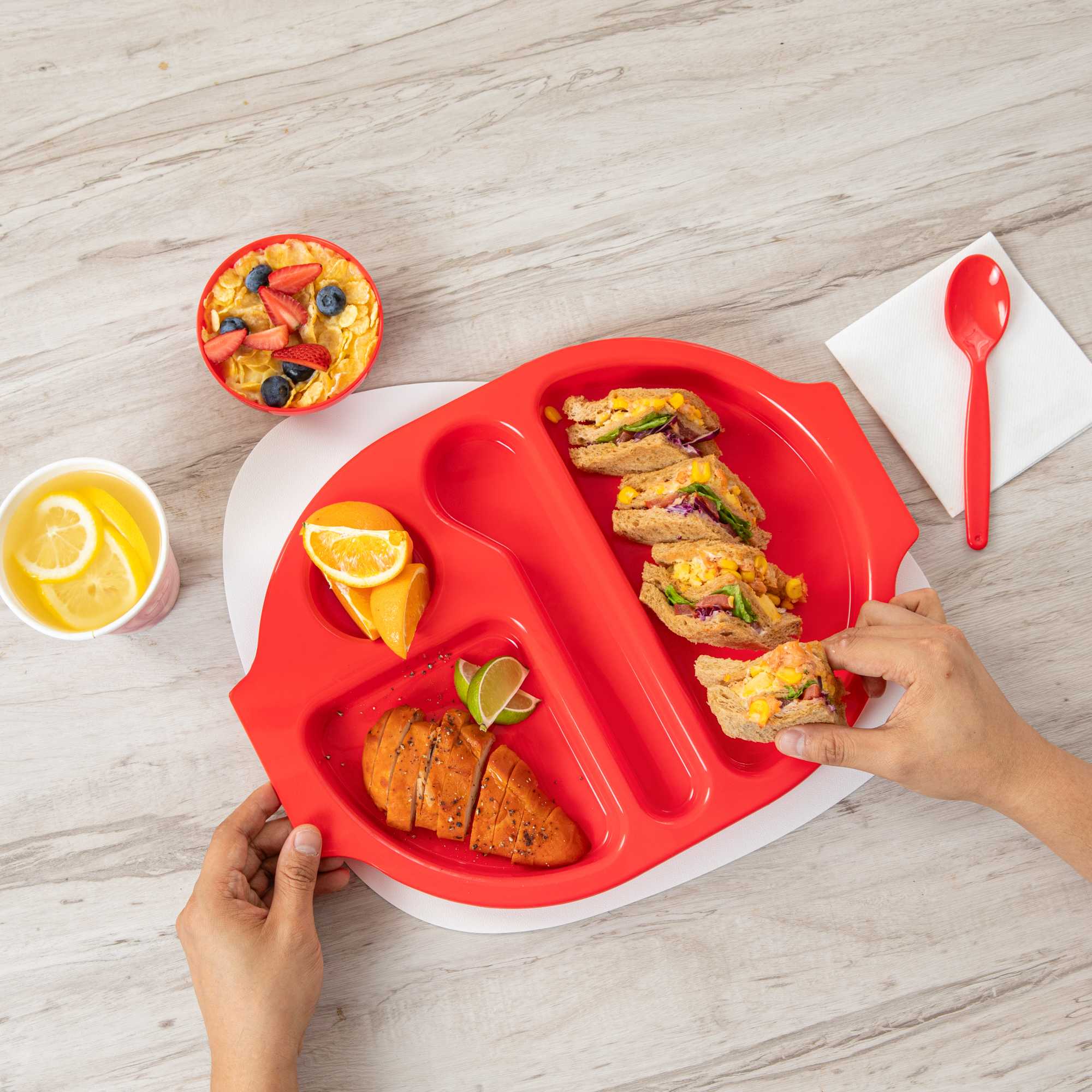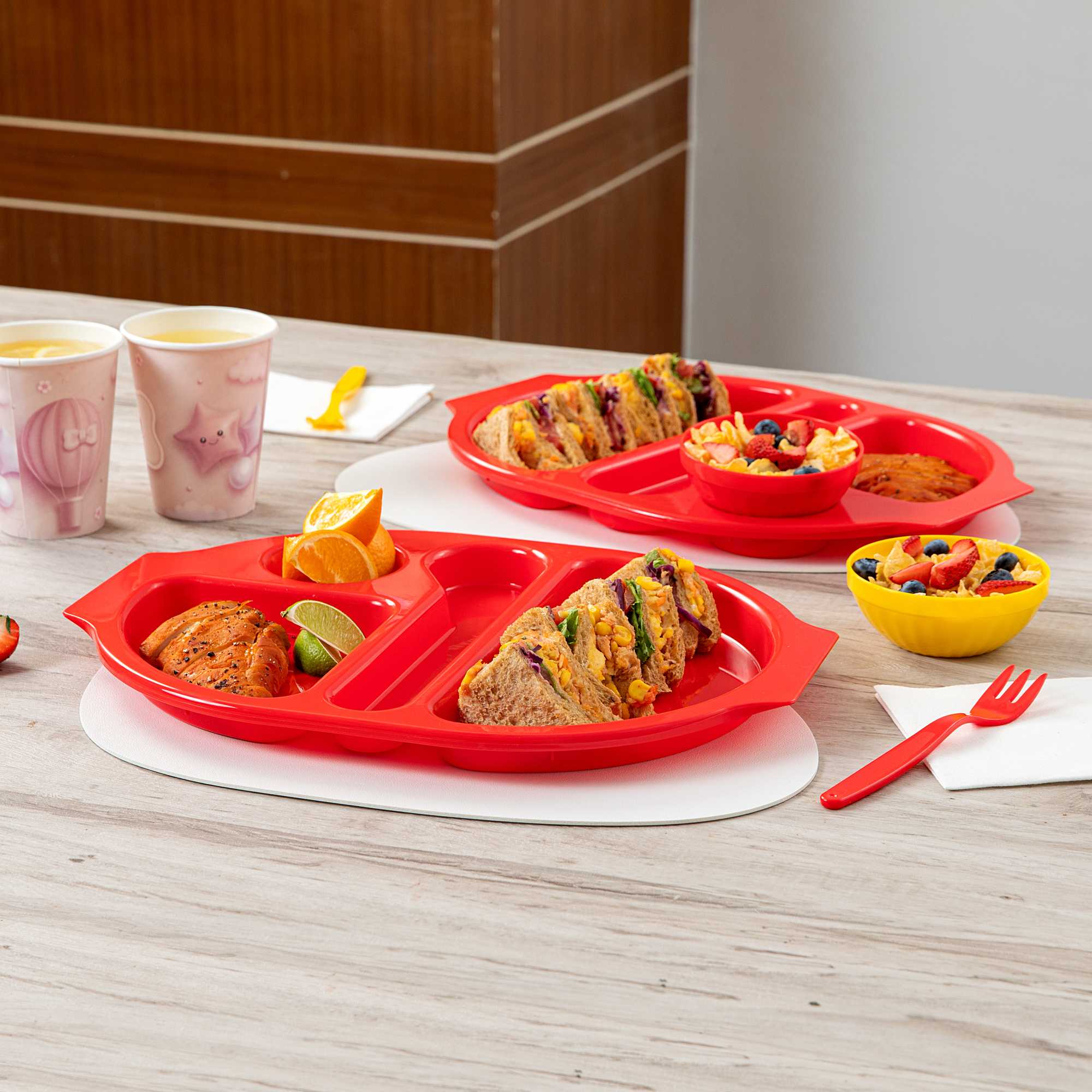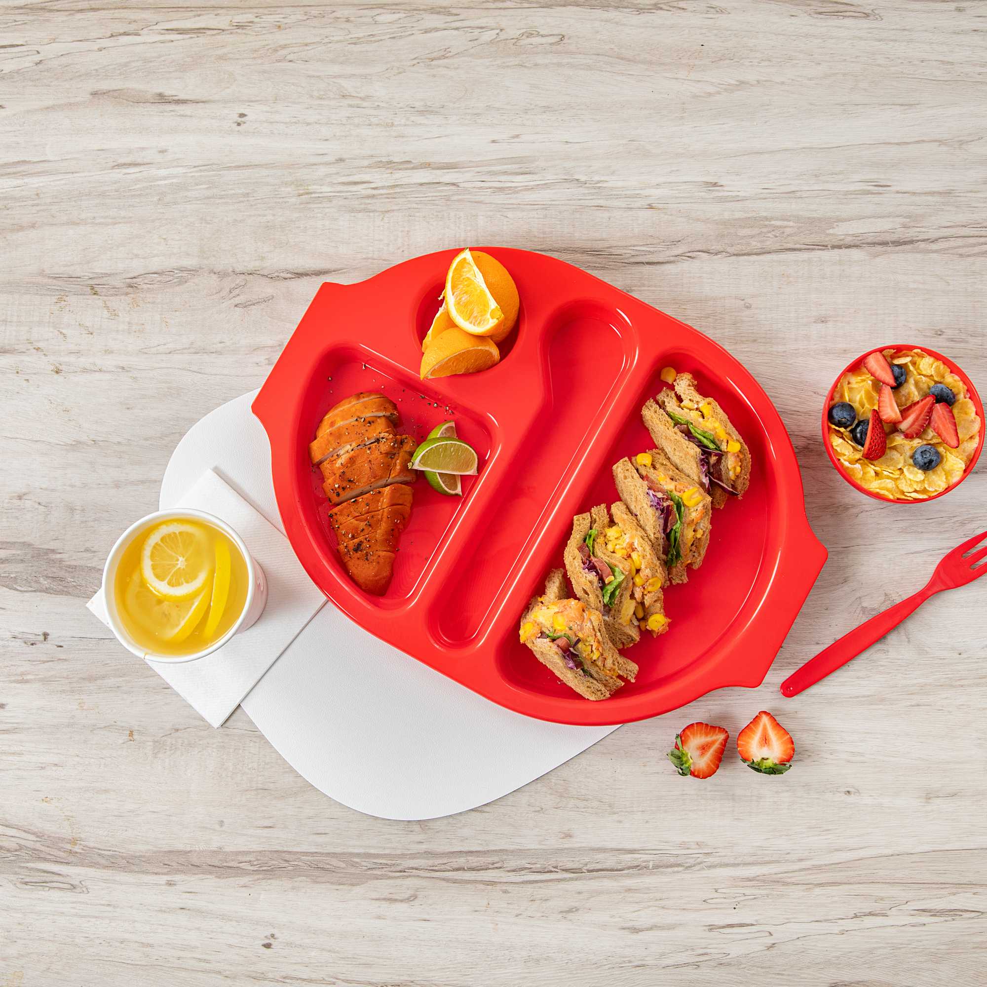 Boost meal presentation with organized sectioning for every dish. The RW Kids Shatter-Resistant Plastic Compartment Tray offers a practical and vibrant solution for school cafeterias and children's dining environments. With its shatter-resistant design, this plastic compartment tray withstands rigorous daily use, ensuring long-term stability in high-traffic areas. Its 4 sections enable easy portion control, allowing schools and hospitals to serve the correct amount of food efficiently. Crafted from durable plastic, this tray is lightweight and features easy-to-hold handles, preventing spills and enhancing operational safety. Measuring 14.75 inches by 11 inches, it is designed to streamline foodservice operations, making it an essential sectioned food tray for any child-friendly venue. Its dishwasher-safe attribute simplifies cleanup, reducing labor costs and maintaining hygiene standards. Sold in a 10 count box.