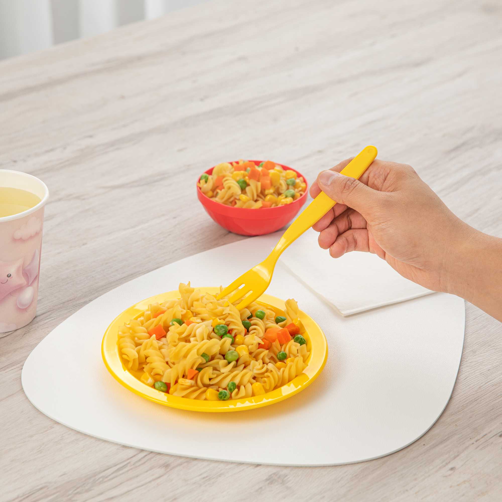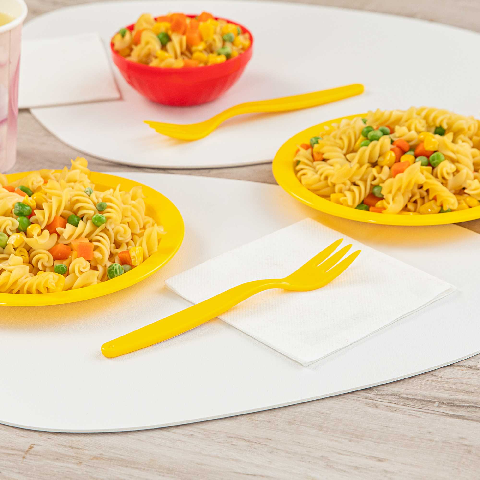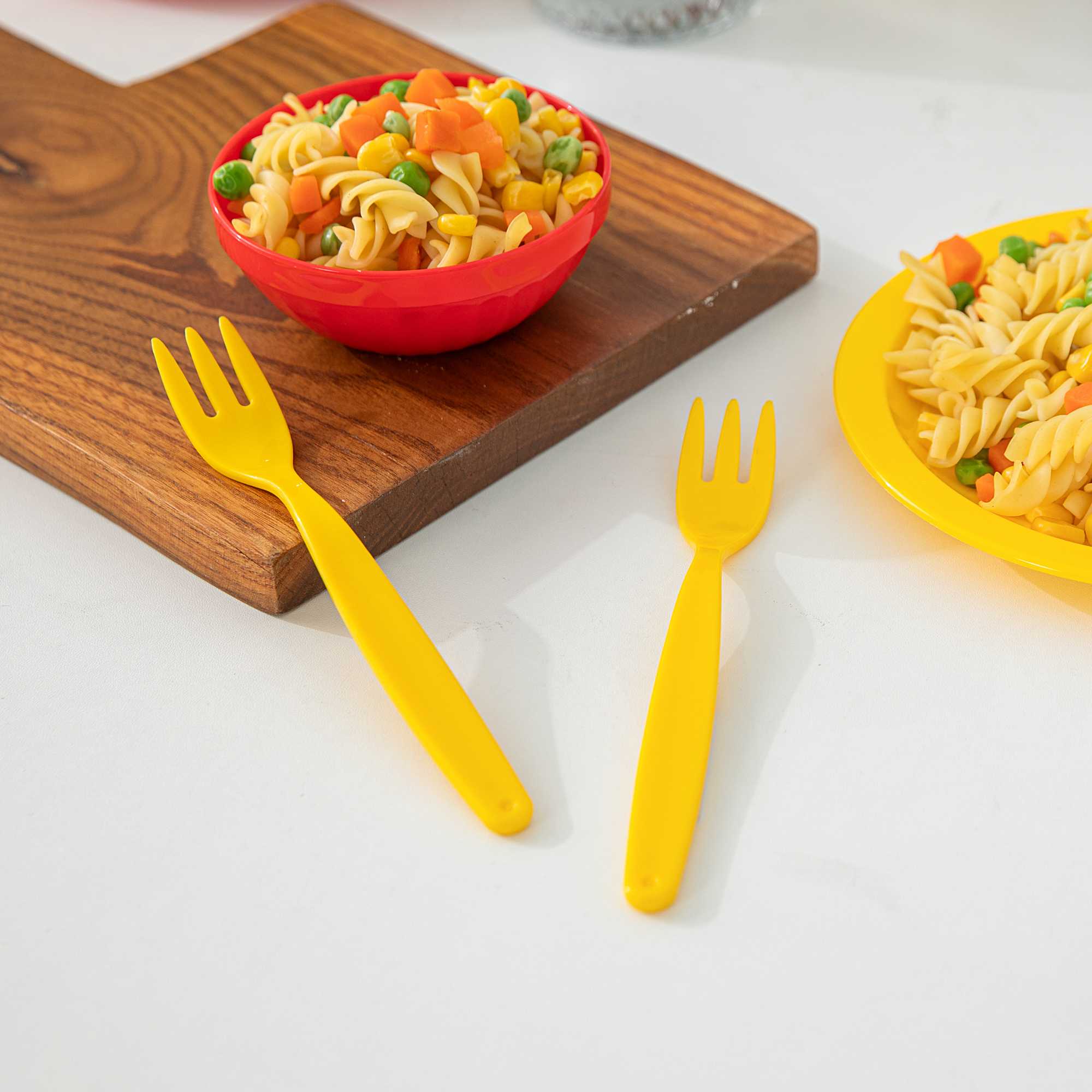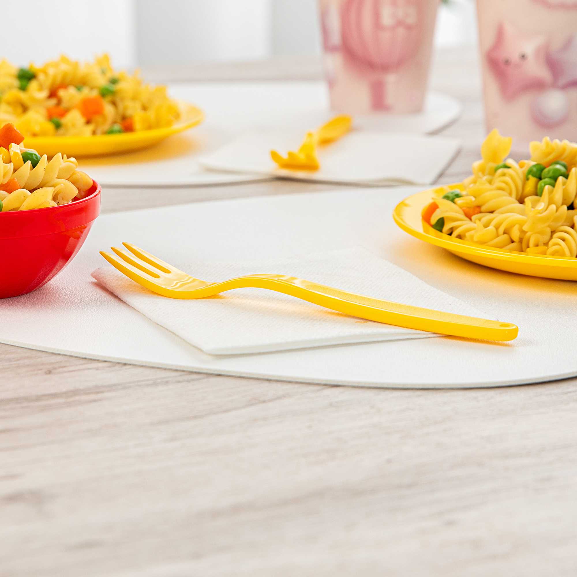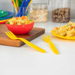 Ensure safe and efficient mealtimes with virtually unbreakable cutlery. RW Kids Yellow Plastic Forks combine a resilient plastic fork construction with a vibrant yellow color, making them ideal for children's flatware in bustling environments. Designed with a 6 3/4 inches length, these forks provide an ergonomic handle that enhances comfort during extended use, perfectly sized for little hands. These forks are also dishwasher safe, ensuring easy sanitation and suitability for sensitive environments. Elevate the dining experience with these engaging and durable utensils, perfect for any child-friendly foodservice setting. Sold in a 10 count box.