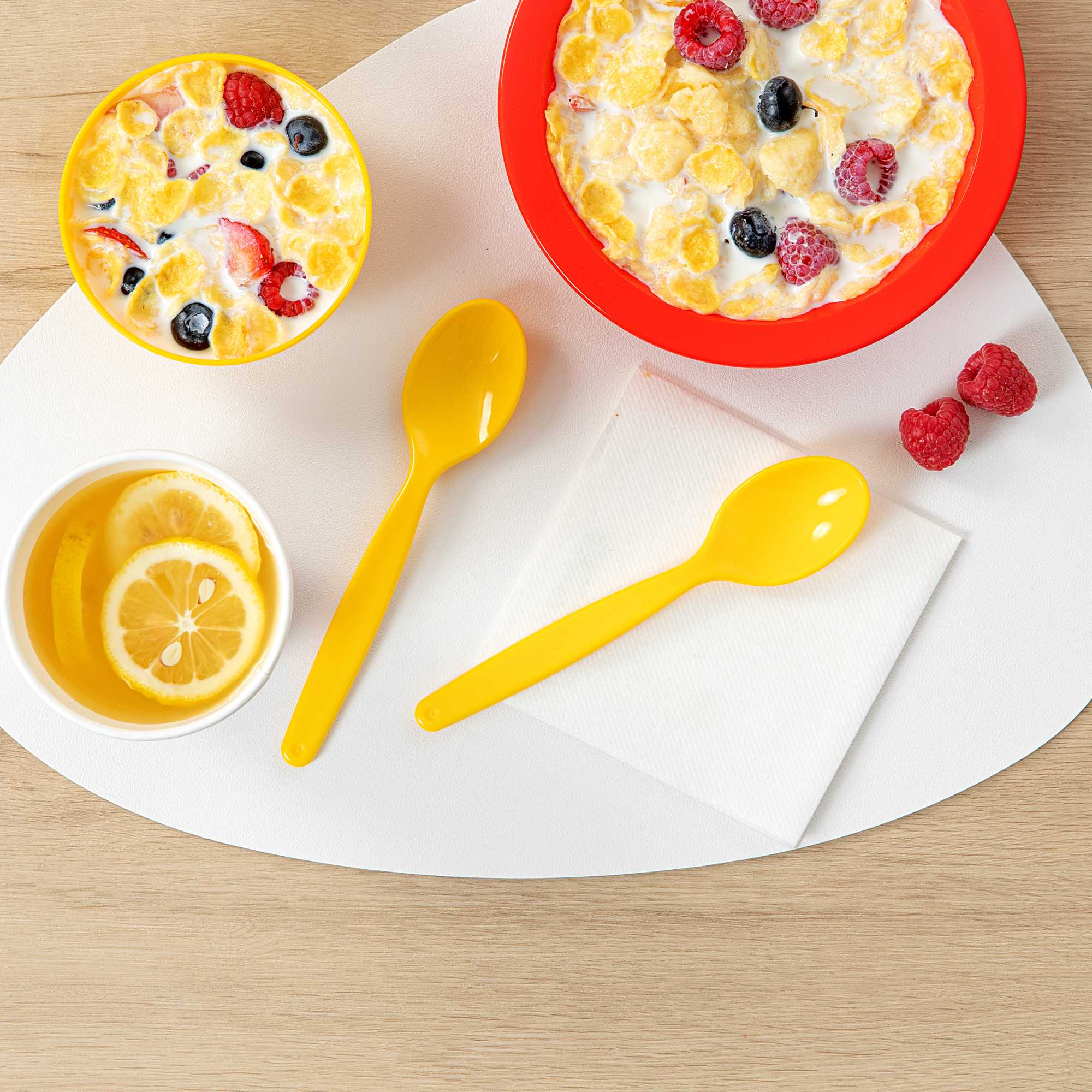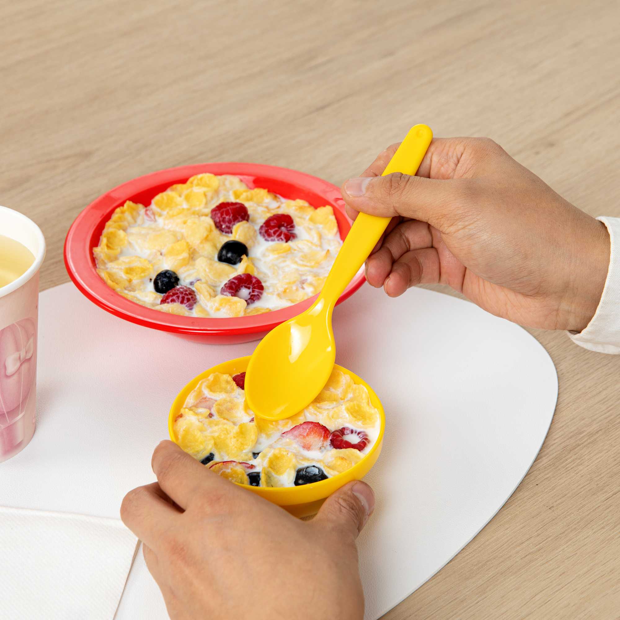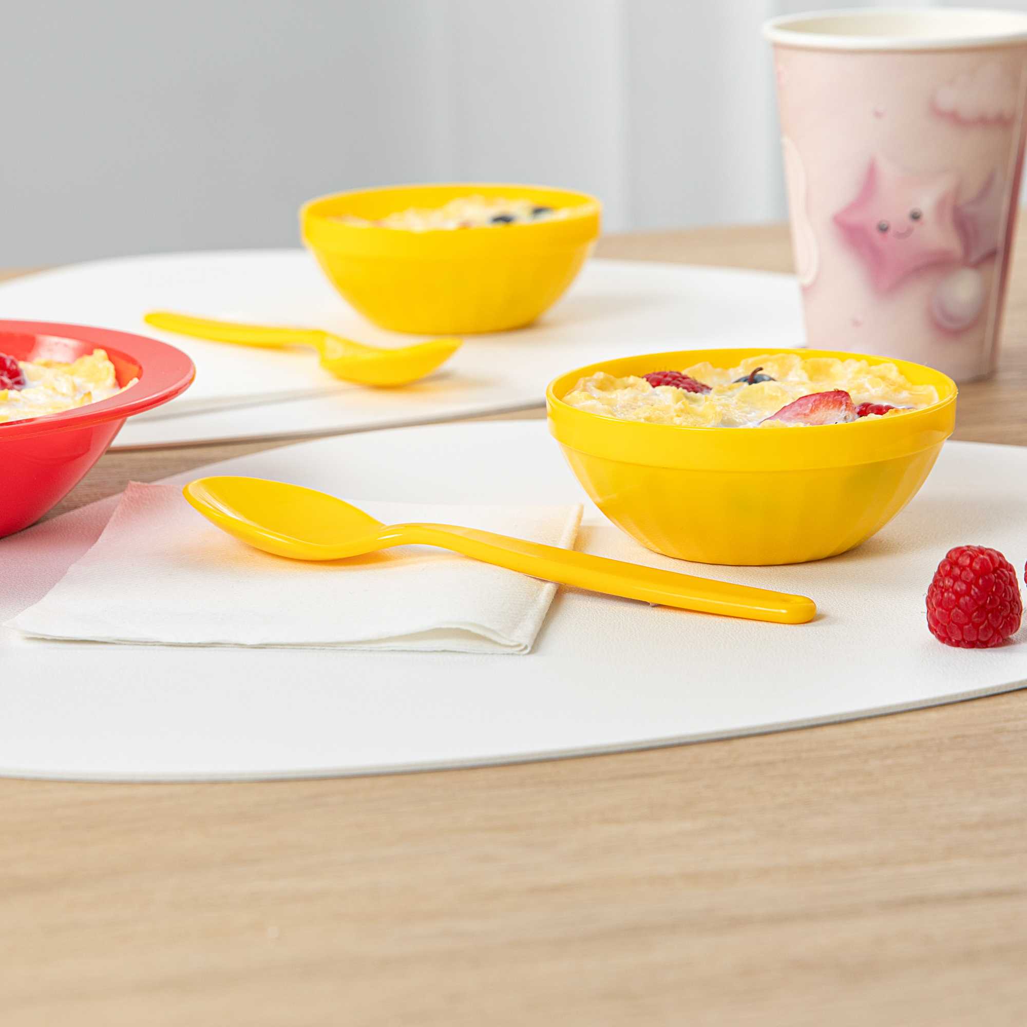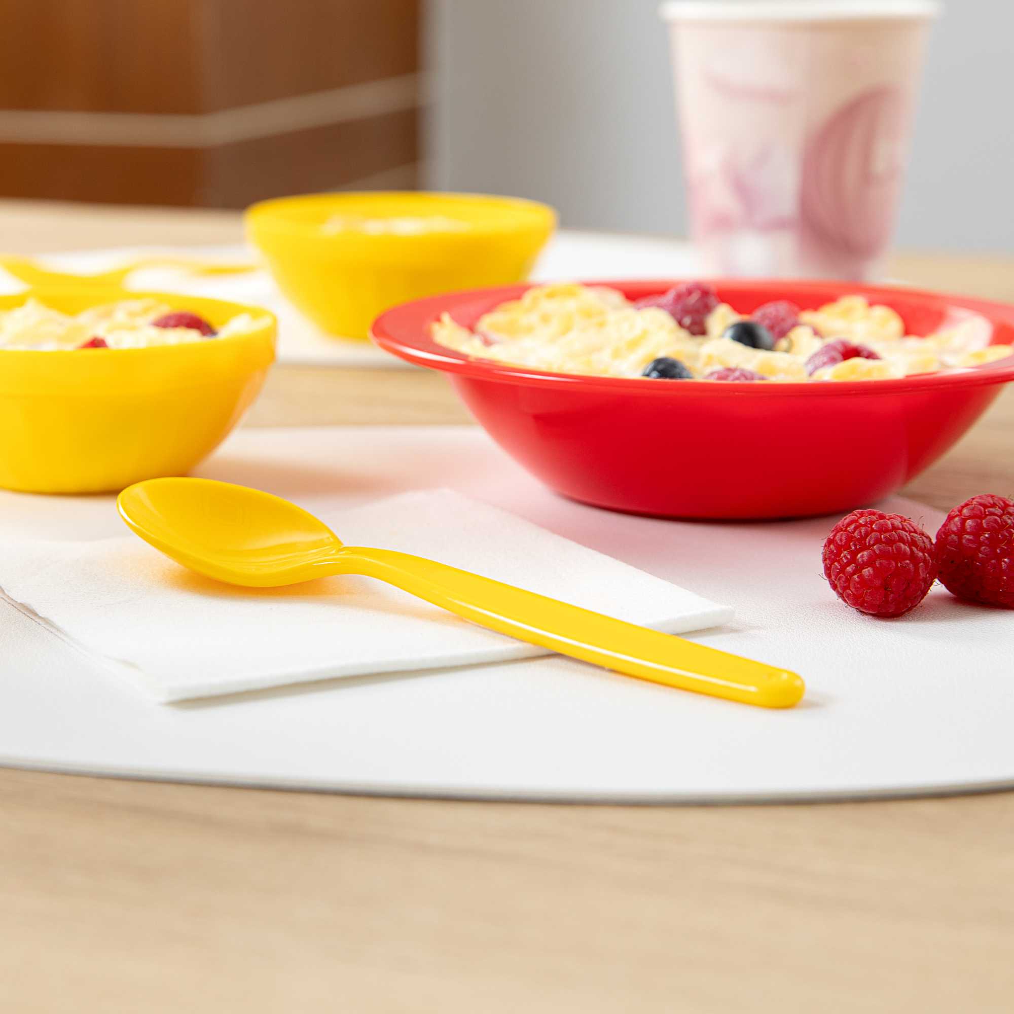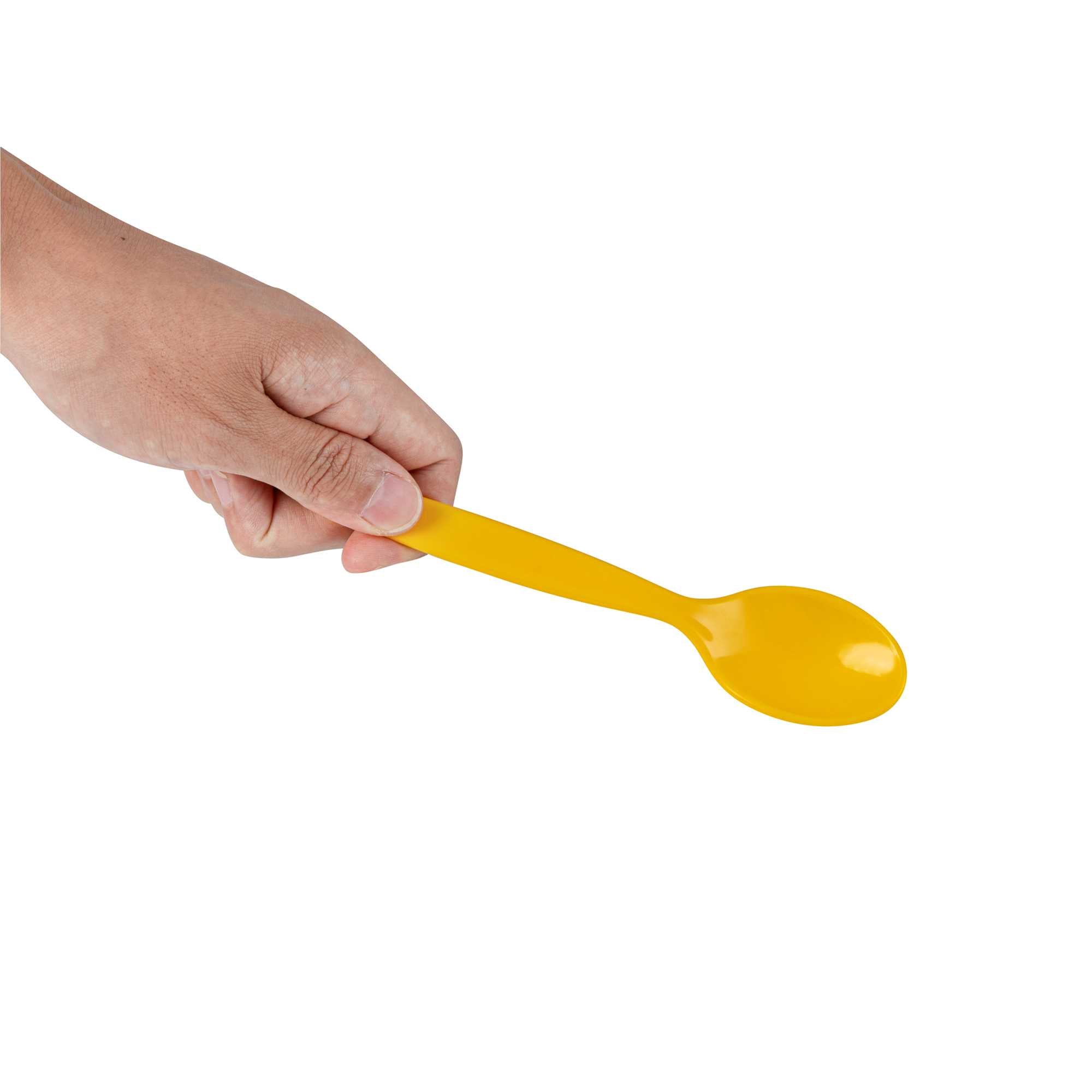 Simplify cleanup with vibrant flatware. The RW Kids Lightweight Plastic Spoon brings a playful touch to children's meals with its vibrant yellow color, while its durable plastic construction ensures it withstands frequent use in bustling foodservice environments. Measuring 6 3/4 inches in length, this ergonomic handle spoon provides a comfortable grip for small hands, promoting ease of use, and its lightweight design makes handling effortless for young children, a perfect addition to any kids spoon collection. The softer surface of this plastic spoon is designed to protect developing teeth, offering peace of mind to parents and caregivers. Dishwasher safe, it is ideal for school foodservice operations, allowing for quick and efficient cleaning. Add an element of fun to your dining experience while supporting eco-friendly practices with this recyclable utensil. Sold in a 10 count box.