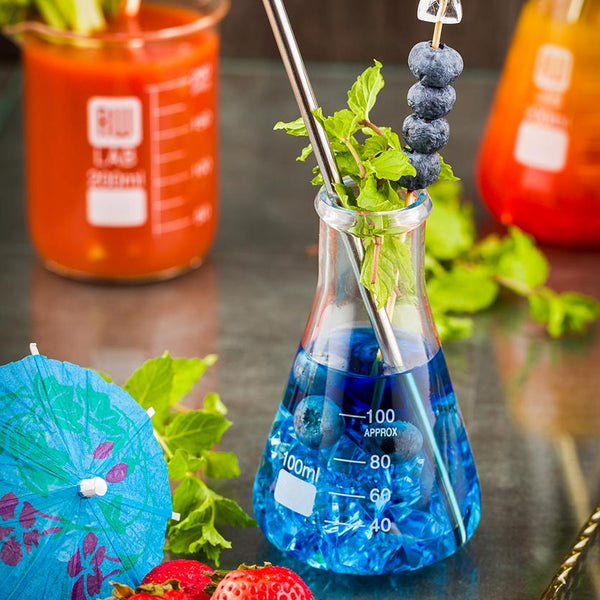 Create an immersive modern gastronomic experience with these RW Lab 100ml Conical Flasks. Perfect for serving avant-garde cocktails and deconstructed desserts, these 4.1-inch tall flasks make an unforgettable addition to your bar or restaurant. Use them to educate your guests on cocktail chemistry, or use them to accommodate requests for extra juices, syrups, and tonics alongside your cocktails. Pair these unique cocktail glasses with our selection of plastic pipettes to complete the chemistry barware-inspired look! Made from premium borosilicate glass, they're scratch-resistant, heat-resistant, and dishwasher safe. Expand your chemistry cocktail set with these durable 100ml conical flasks, available in a 10 count box.