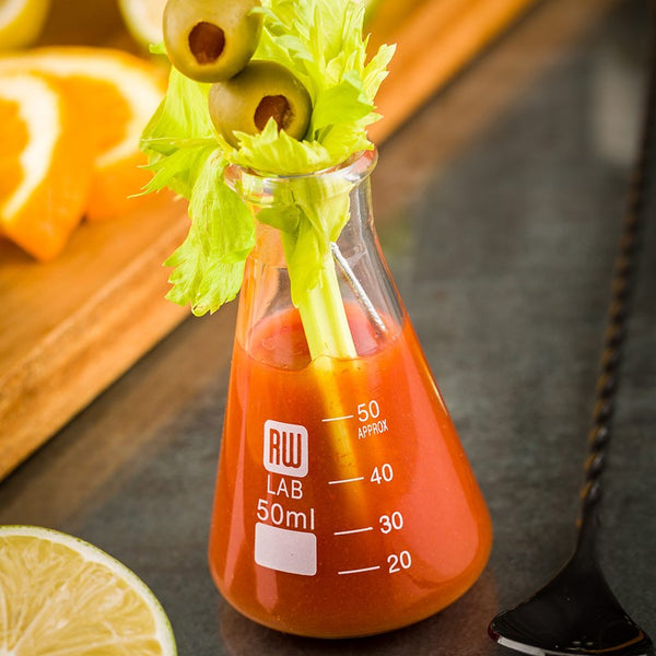 Inspire your inner mad scientist with these RW Lab 50ml Conical Flasks. From lab to table, these heat-resistant and scratch-resistant 3.5-inch tall flasks are perfect for getting your customers intrigued in cocktail chemistry and gastronomy. Use them to serve deconstructed cocktails and desserts -- or use them to provide customers with extra sauces, dressings, and infusions on the side. Made from durable, dishwasher-safe borosilicate glass, these glass flasks are quick and easy to clean and reuse. Browse our selection of plastic pipettes to complete your modern gastronomy-inspired look! Add a touch of memorable scientific flair to your restaurant or bar glassware with these 2-ounce unique flasks, available in a 10 count box.