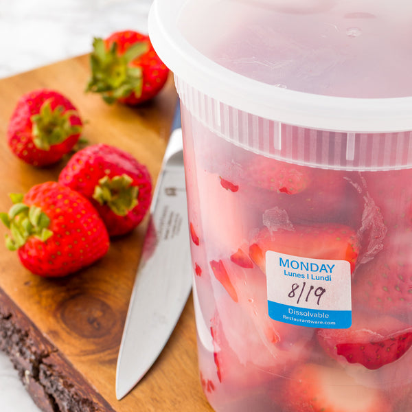 Mark your food storage containers RW Smart Blue Paper Weekly Monday Food Rotation Labels. These biodegradable food labels won't leave any marks on your containers, as they completely dissolve in 20 seconds when placed under running hot or cold water. Reading "MONDAY," "LUNDI," and "LUNES" in blue font, these trilingual food rotation labels allow your English, French, and Spanish-speaking employees to easily understand these stickers. Featuring a semi-gloss finish, these blue and white dissolvable labels are easy to read and effortlessly give your containers a charming touch. These Monday labels are excellent for First In, First Out (FIFO) organization of ingredients at your restaurant, bar, or other foodservice establishment to reduce waste. Organize your food rotation labels with our RW Smart Clear Acrylic Label Dispenser, which includes 7 slots (SKU: RWP0546), or our RW Smart Clear Acrylic Label Dispenser, which includes 9 slots and a lid (SKU: RWP0545). Measuring 1 inch long by 1 inch wide, these dashing food labels are ideal for all kinds of pantries. Sold in a 500 count box. This item will only degrade outside of the traditional solid waste stream. Label dispensers are available and sold separately.