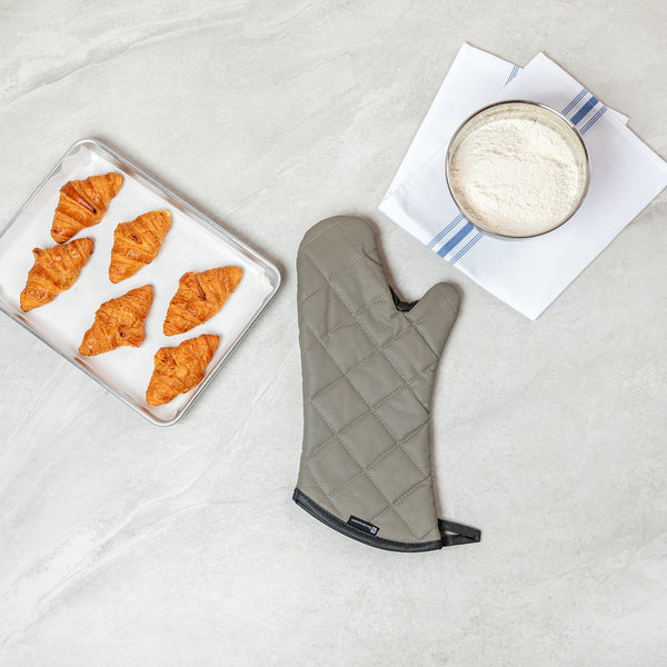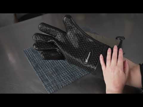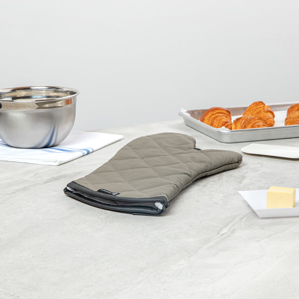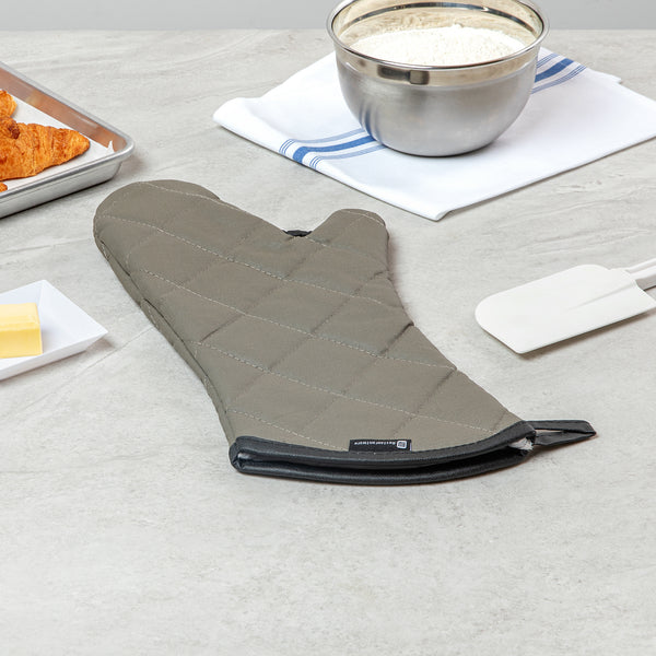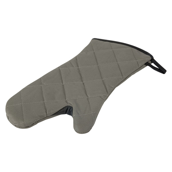 Shield your hands from hot, greasy splatters and open flames with our RW Threads Gray Cotton Oven Mitt. This heat-resistant baking mitt can endure high temperatures up to 500 degrees Fahrenheit. Featuring a built-in thumb guard, this durable oven mitt provides thick insulation, allowing you to safely grip hot pots and pans for a longer period of time than average oven mitts. With a flame-retardant coating, this heat-resistant oven glove extinguishes flames and prevents accidental burns and injuries. This long-lasting cooking mitt is equipped with a hanging loop for easy storage and is conveniently machine-washable. Measuring 17 inches long by 8 inches wide, this oven glove is a must-have for any commercial kitchen. Sold in a 1 count box.