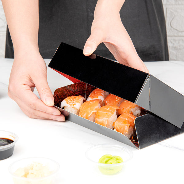 Elegantly display sushi with our Sakura Vision Black Paper Large Window Sushi Boxes. These sushi black boxes have premium paper construction for durability and ensure secure transport and handling of during delivery. Each maki box has a large rectangular window display to allow guests to see the fresh sushi inside, enticing their appetites. These sushi packaging boxes have an red ichthys design at the bottom interior to adds a splash of color to accent sushi rolls and nigiri. The black exterior of these paper sushi containers provides a sleek, sophisticated appearance. These nigiri boxes have a flat opening front to provide easy access for placing sushi inside and removing it to serve. To save time in setting up, these sushi boxes can be easily assembled. These rectangular window boxes measure 8 inches in length by 4.75 inches in width by 1.75 inches in height. Sold in a pack of 200.