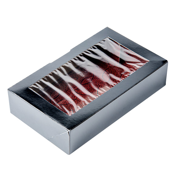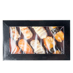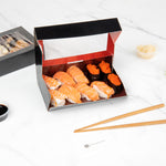 Elegantly display sushi with our Sakura Vision Black Paper Large Window Sushi Boxes. These sushi black boxes have premium paper construction for durability and ensure secure transport and handling of during delivery. Each maki box has a large rectangular window display to allow guests to see the fresh sushi inside, enticing their appetites. These sushi packaging boxes have an red ichthys design at the bottom interior to adds a splash of color to accent sushi rolls and nigiri. The black exterior of these paper sushi containers provides a sleek, sophisticated appearance. These nigiri boxes have a flat opening front to provide easy access for placing sushi inside and removing it to serve. To save time in setting up, these sushi boxes can be easily assembled. These rectangular window boxes measure 8 inches in length by 4.75 inches in width by 1.75 inches in height. Sold in a pack of 50.