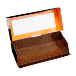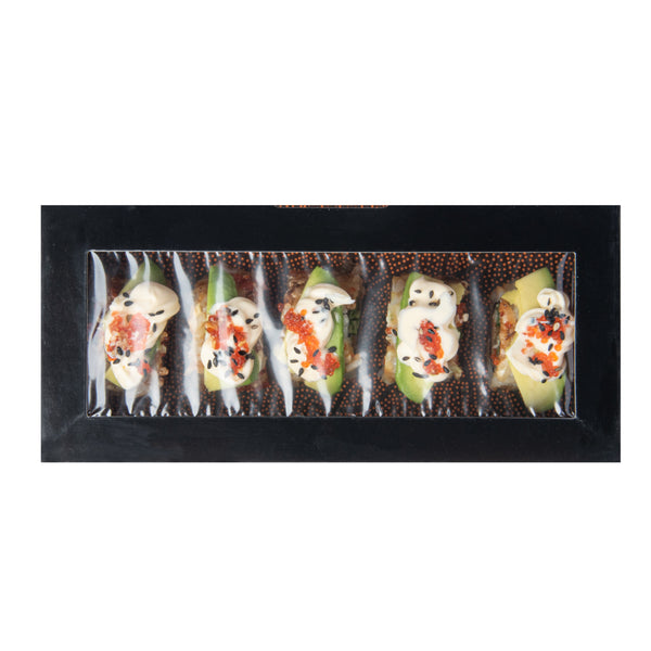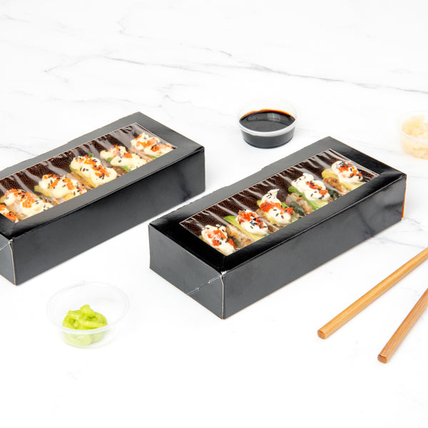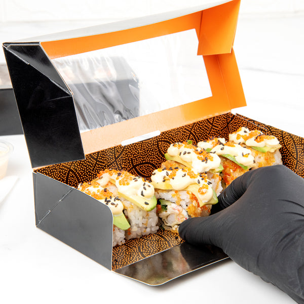 Display delicious sushi with our Sakura Vision Black Paper Medium Window Sushi. The durable paper construction of these maki boxes ensures secure transport and handling of sushi items. These sushi boxes have large rectangular window display allows customers to see the fresh sushi inside, enticing their appetites. With orange ichthys design at the bottom interior, these sushi packaging boxes adds a pop of color to accent sushi rolls and nigiri. These rectangular window boxes have a black exterior to provide a sleek, high-end appearance. The flat opening front of these paper sushi containers gives easy access for placing sushi inside and removing it to serve. These nigiri boxes can be easily assembled to save time in setting up. Measuring 8 inches in length by 3.5 inches in width by 1.8 inches in height, these black sushi boxes have ample space for sushi while still fitting neatly on countertops and tables. Sold in a pack of 200.