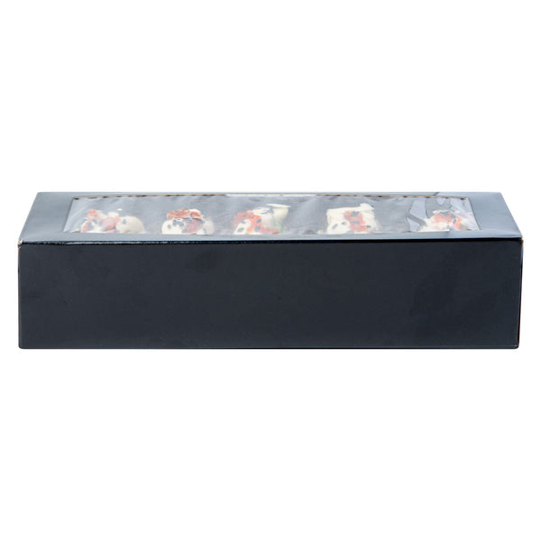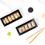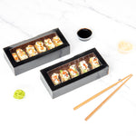 Display delicious sushi with our Sakura Vision Black Paper Medium Window Sushi The durable paper construction of these maki boxes ensures secure transport and handling of sushi items. These sushi boxes have large rectangular window display allows customers to see the fresh sushi inside, enticing their appetites. With orange ichthys design at the bottom interior, these sushi packaging boxes adds a pop of color to accent sushi rolls and nigiri. These rectangular window boxes have a black exterior to provide a sleek, high-end appearance. The flat opening front of these paper sushi containers gives easy access for placing sushi inside and removing it to serve. These nigiri boxes can be easily assembled to save time in setting up. Measuring 8 inches in length by 3.5 inches in width by 1.75 inches in height, these black sushi boxes have ample space for sushi while still fitting neatly on countertops and tables. Sold in a pack of 50.