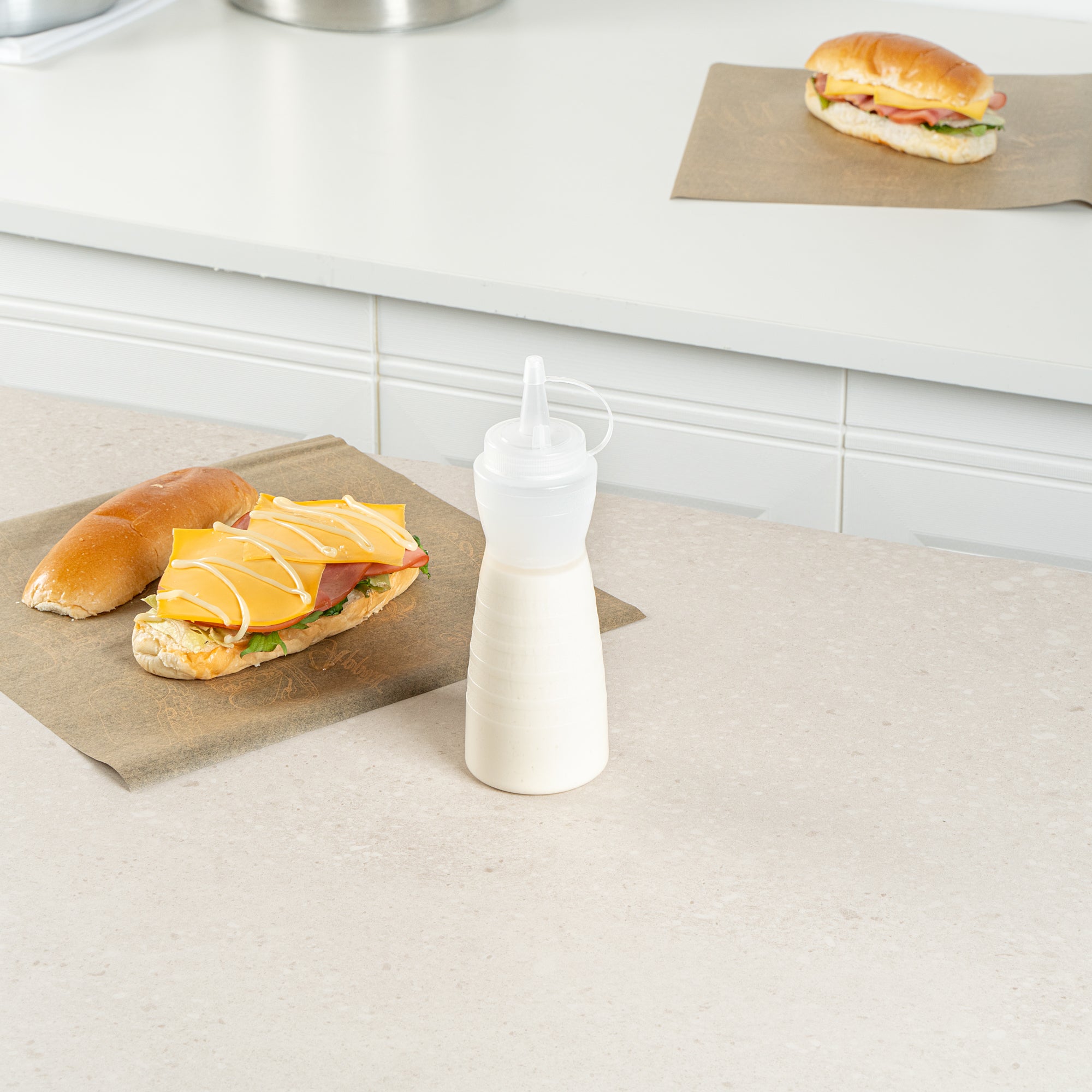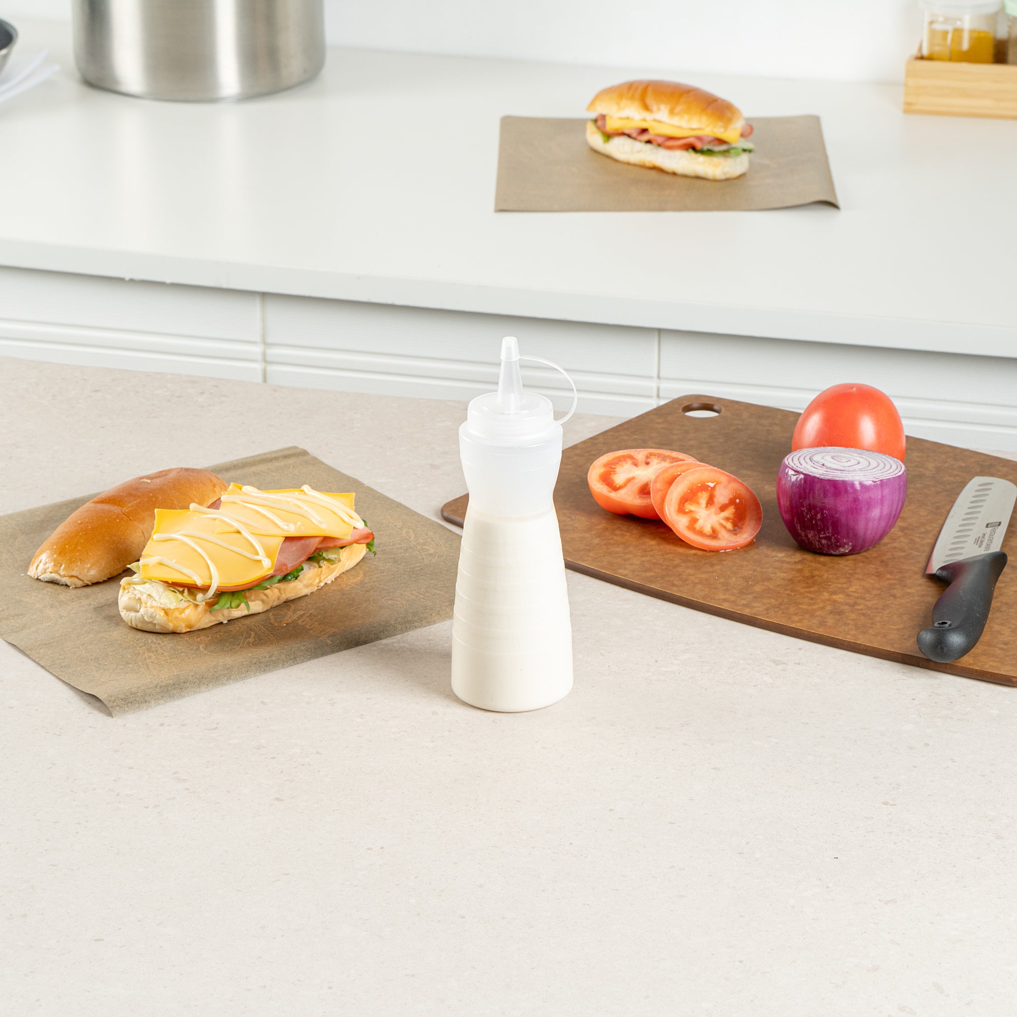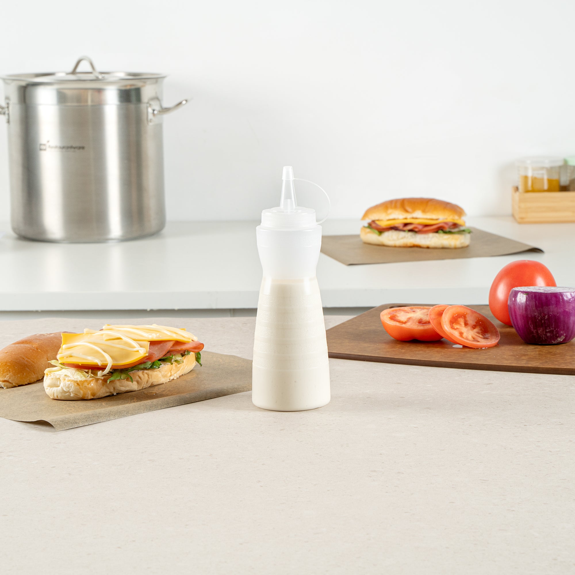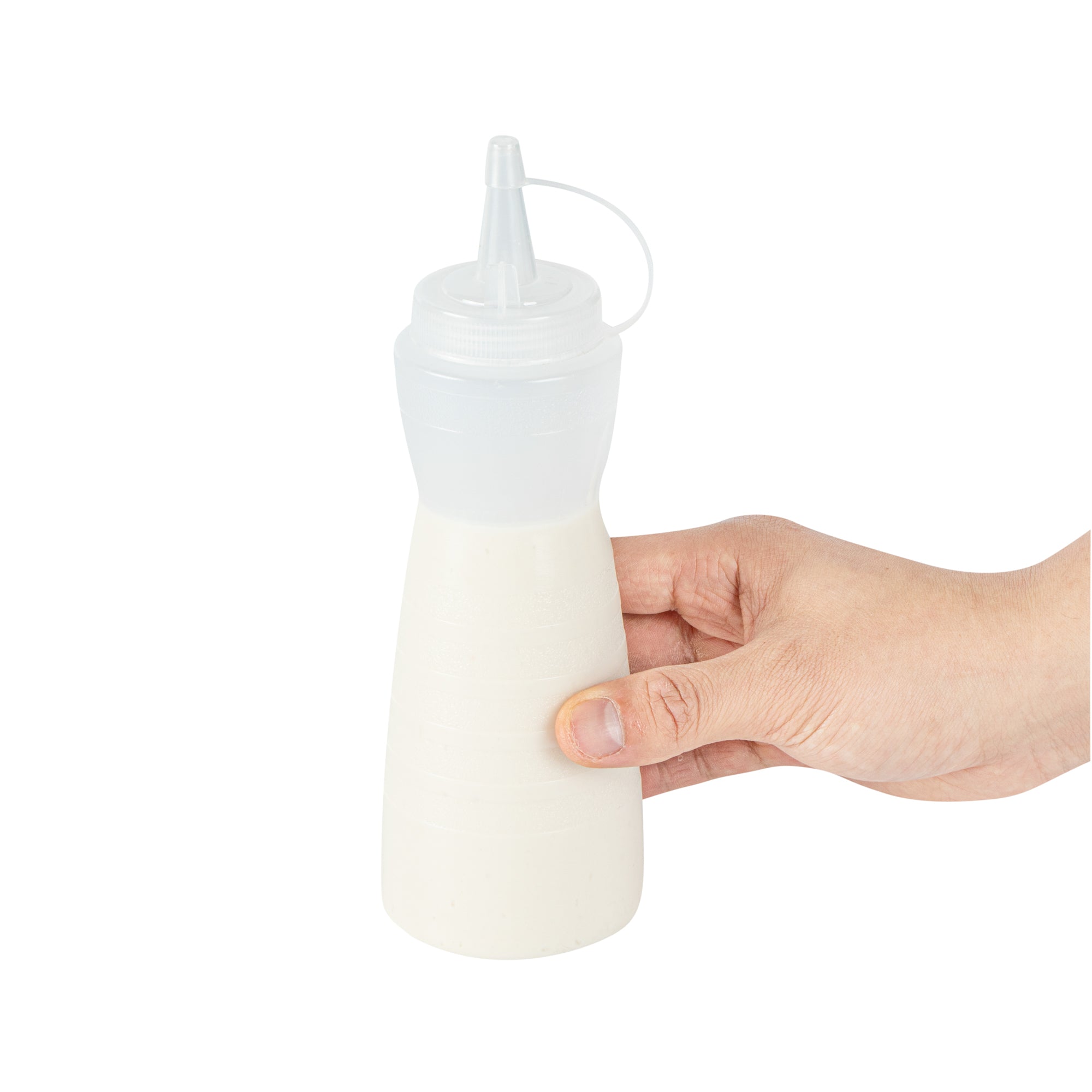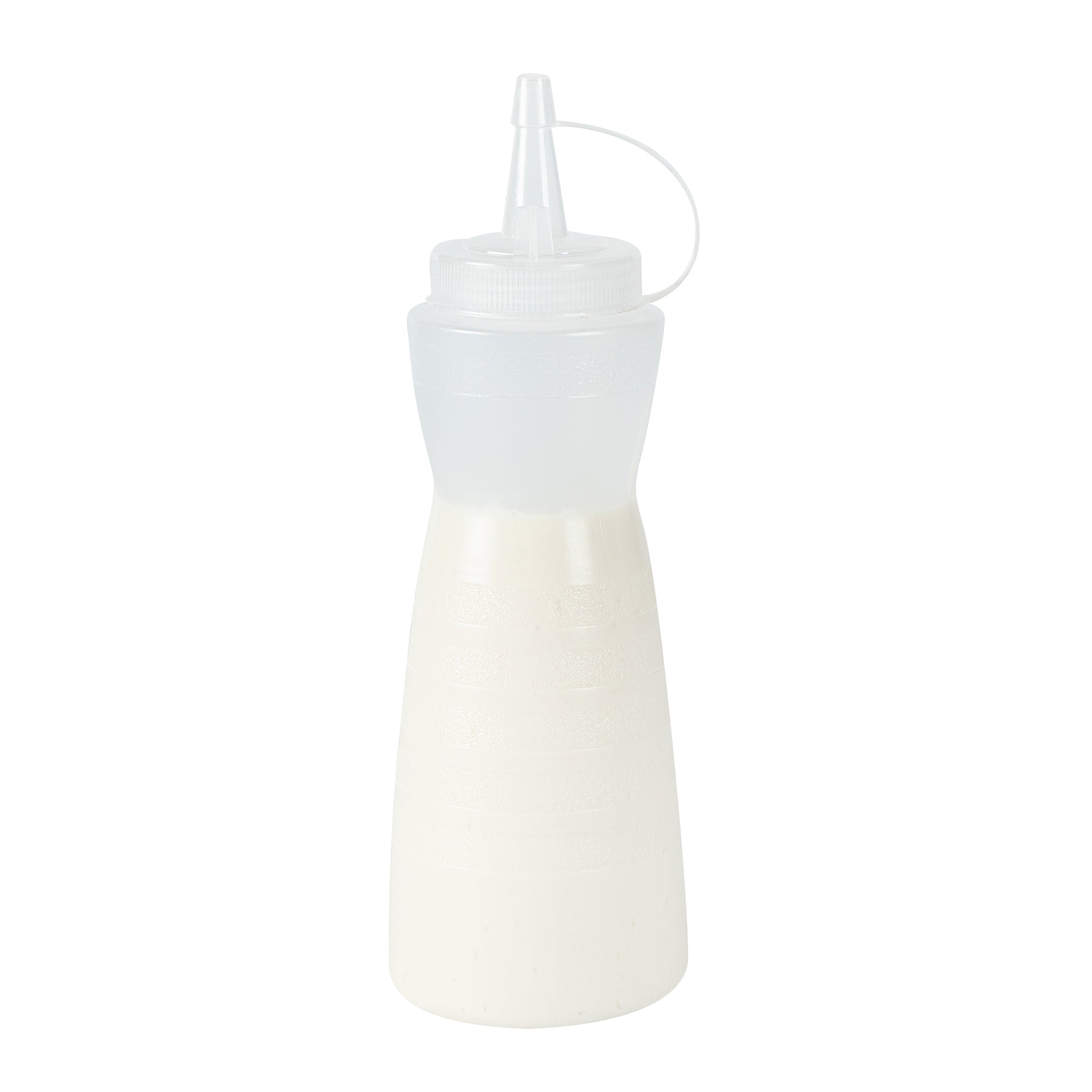 Elevate your condiment storage solutions with our Sauce Tek 12-ounce Clear Plastic Squeeze Bottle. Designed for food safety, this squeeze dispenser is perfect for storing and serving a variety of sauces and dressings. The included cap on this squeeze bottle ensures that leaks are prevented and contents remain fresh. Featuring a wide mouth, this refillable squeeze bottle makes refilling and cleaning a breeze. The clear finish of this wide mouth squeeze bottle beautifully showcases the vibrant colors of your condiments, adding an attractive touch to any dining setting. With a generous capacity of 12 ounces, this sauce bottle measures 2.36 inches in diameter by 7.87 inches in height, offering ample space for your favorite sauces. Sold in a 1 count box.