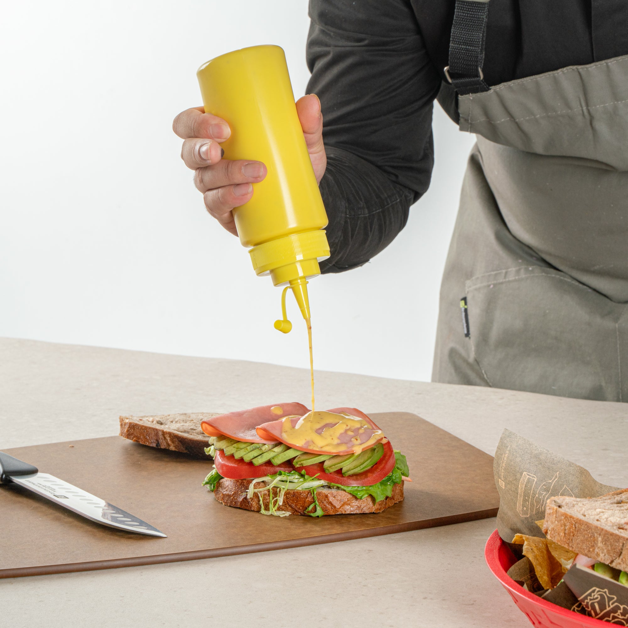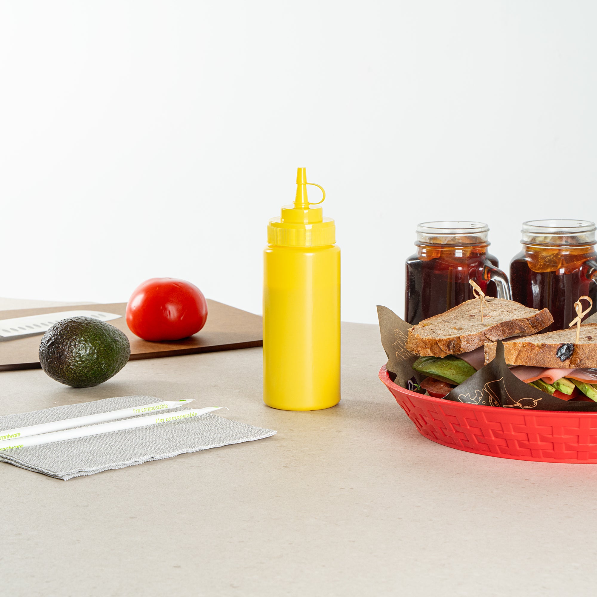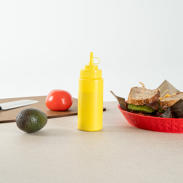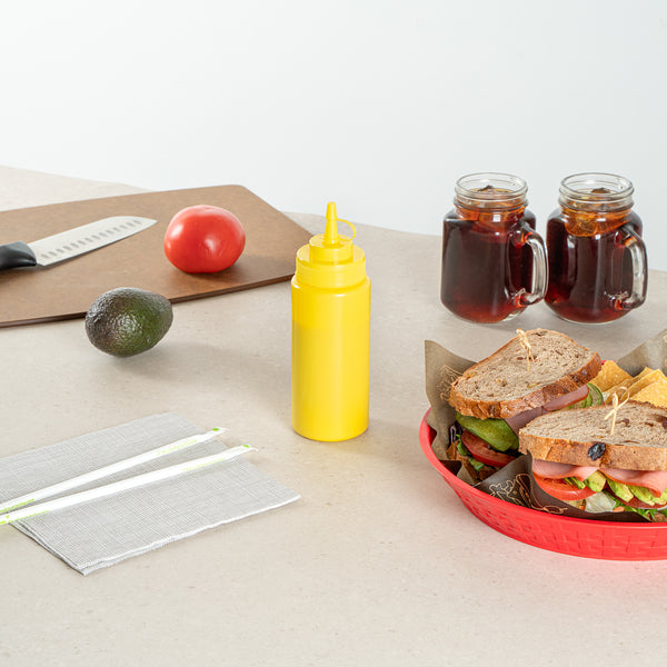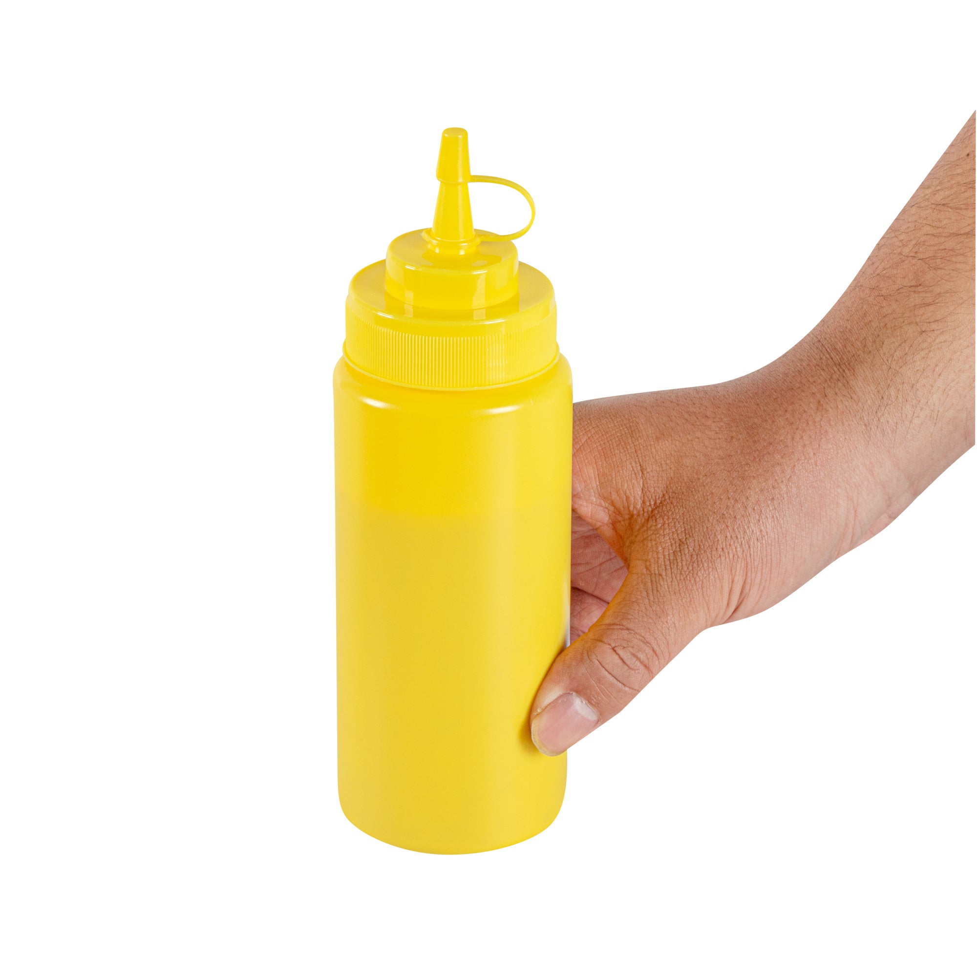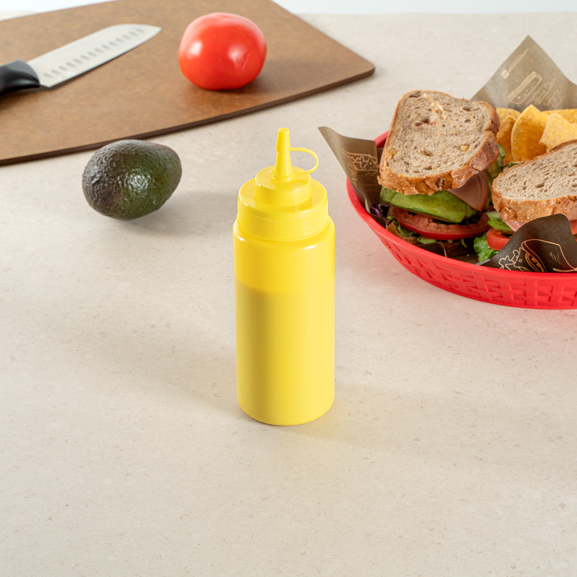 Streamline your condiment service with our Sauce Tek 16-ounce Yellow Plastic Squeeze Bottle. This squeeze dispenser, made from food-safe plastic, is perfect for storing all your favorite condiments securely. To prevent spills and maintain freshness, the included cap of this condiment dispenser offers a leakproof seal. Refilling and cleaning are a breeze thanks to the wide mouth squeeze bottle design. With its vibrant yellow finish, this refillable squeeze bottle is easily distinguishable as a mustard bottle among other condiment containers. This versatile sauce bottle measures 2.56 inches in diameter by 7.87 inches in height, offering a generous 16-ounce capacity for all your sauce storage needs. Sold in a 1 count box.