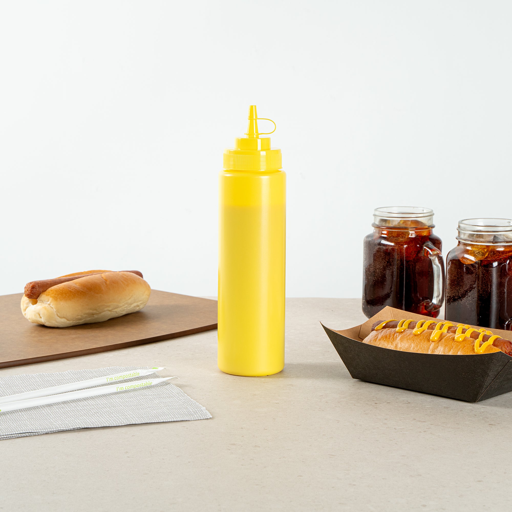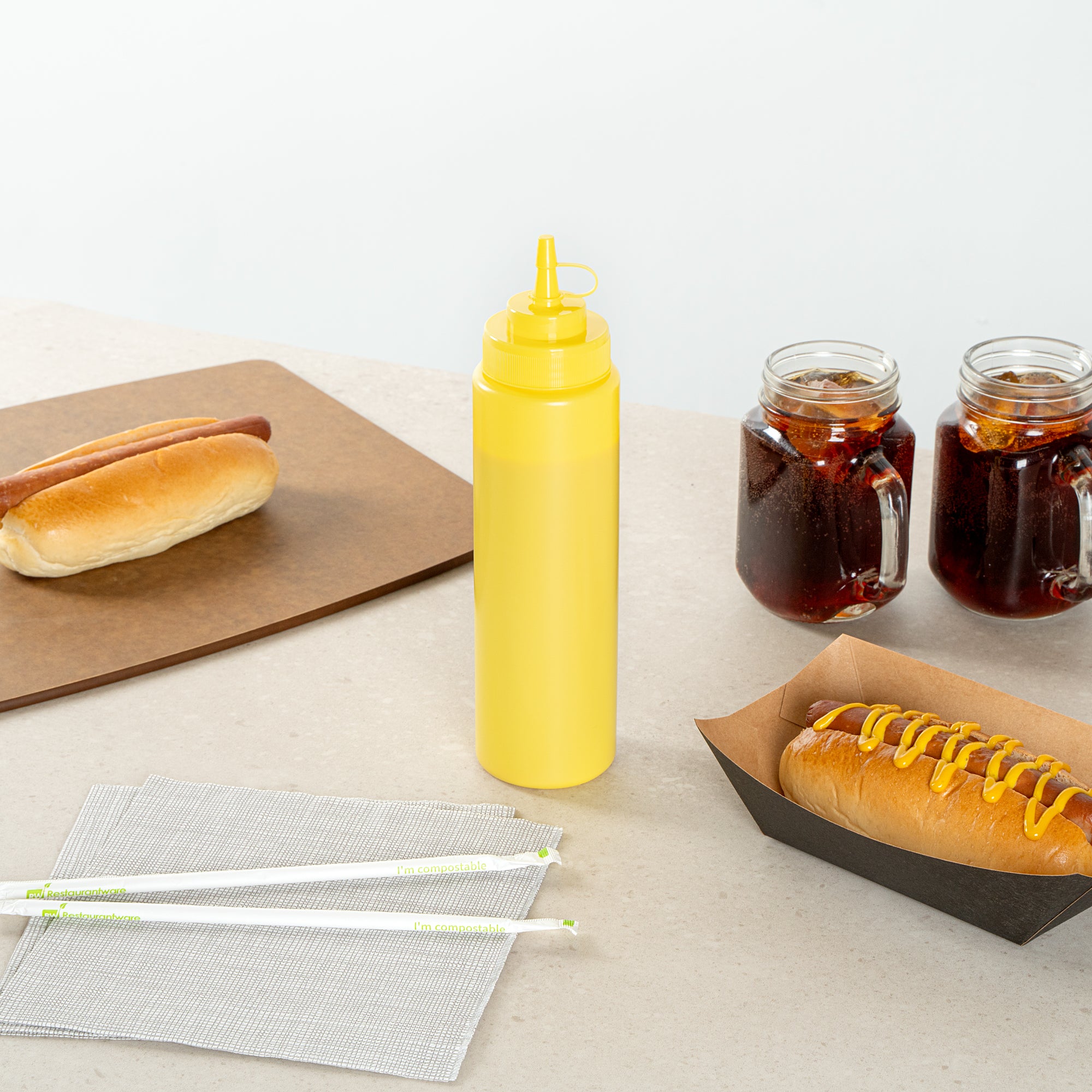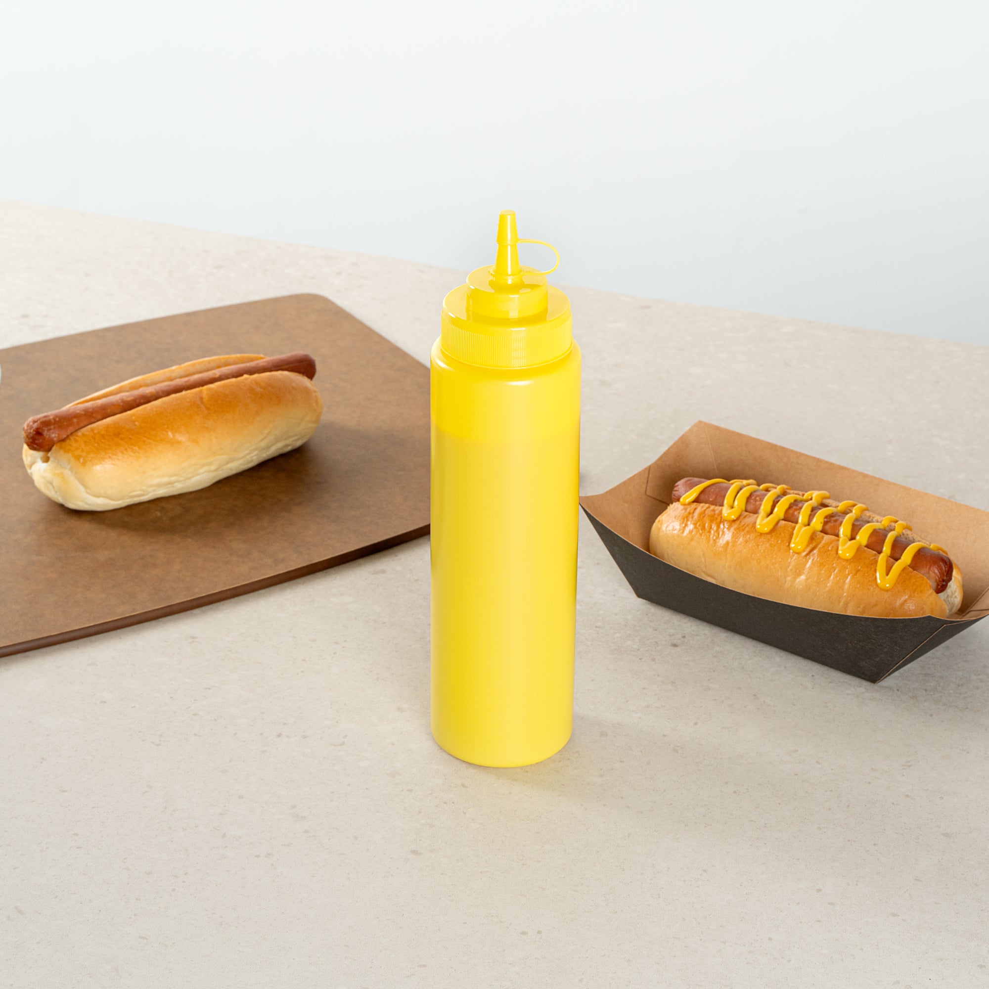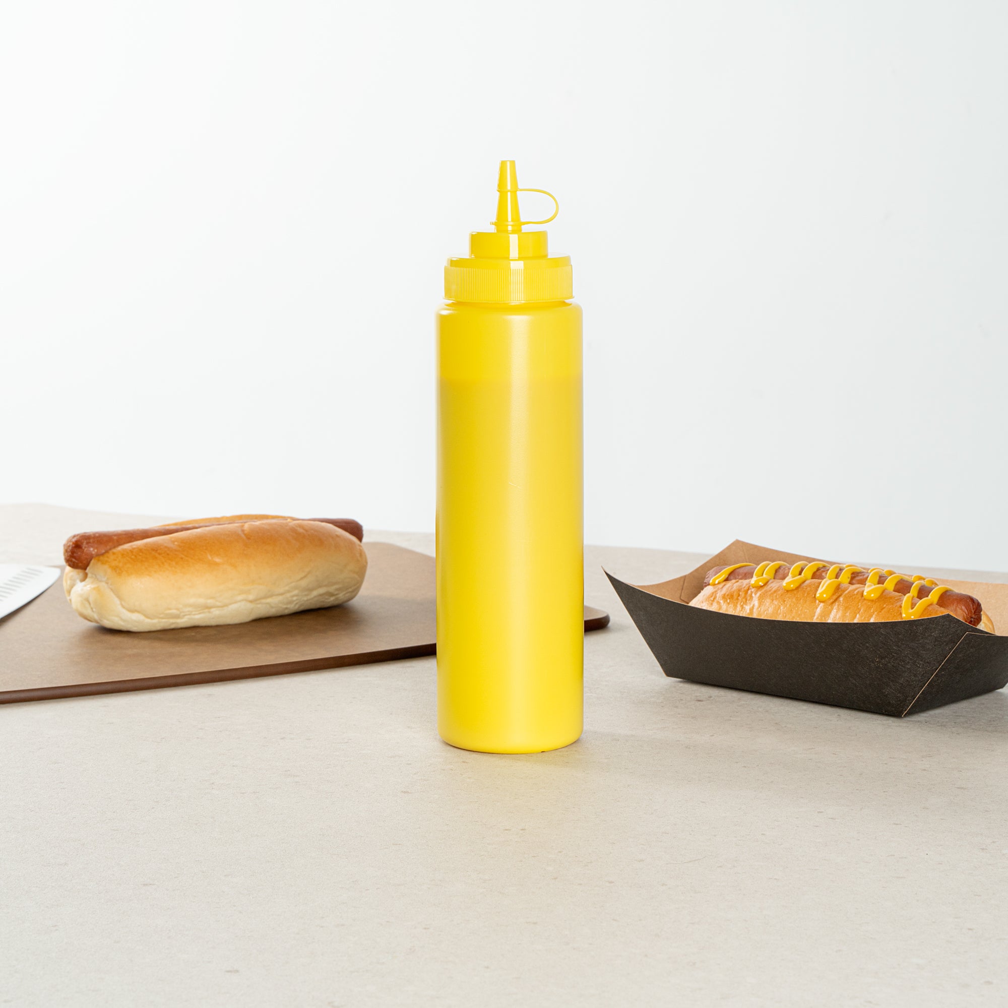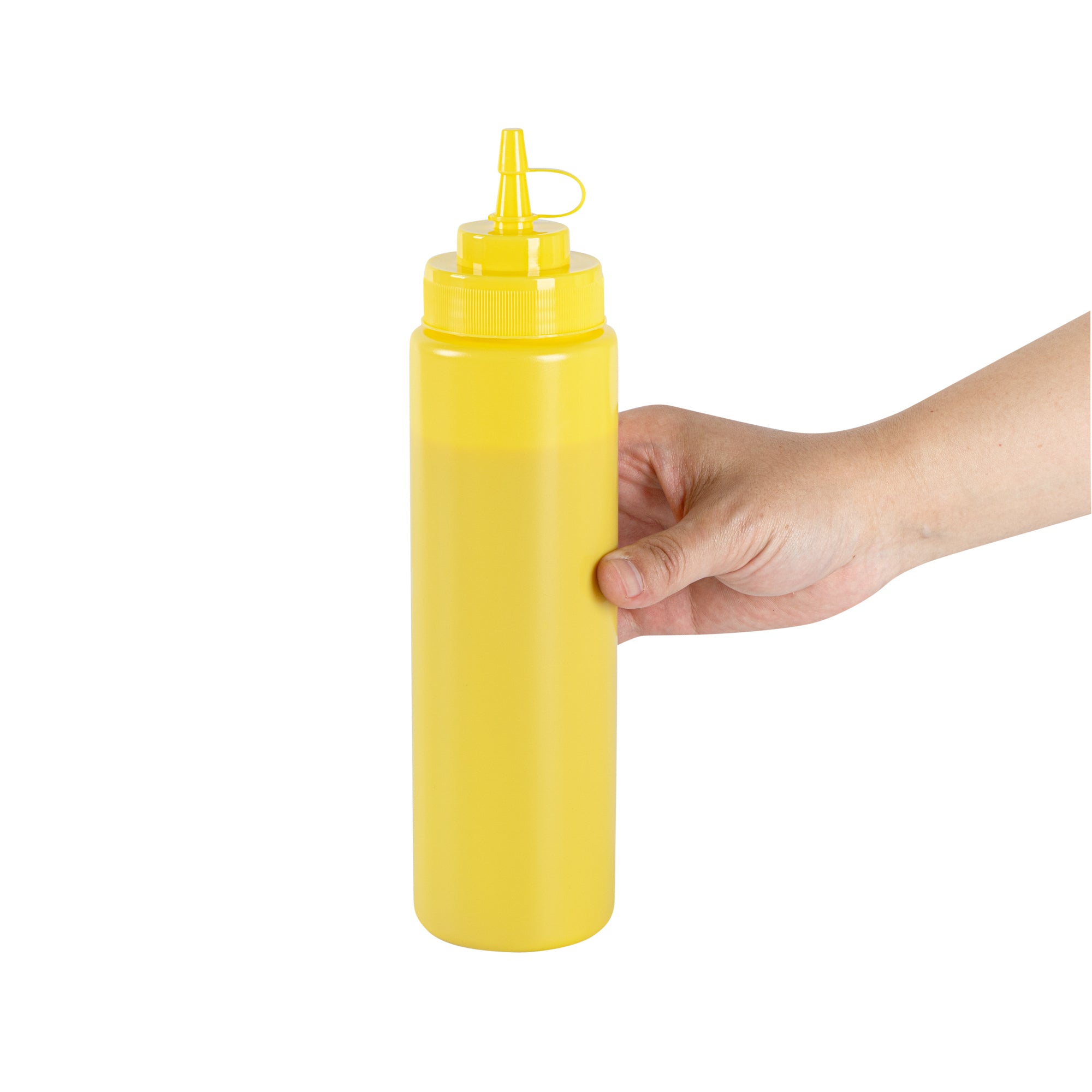 Keep your condiments fresh and easily accessible with our Sauce Tek 24-ounce Yellow Plastic Squeeze Bottle. This condiment dispenser is made from food-safe plastic, ensuring the safe storage of your favorite sauces. Designed with an included cap, this squeeze dispenser prevents leaks and keeps contents fresh. The wide mouth squeeze bottle facilitates easy refilling and cleaning after use. With its bright yellow finish, this refillable squeeze bottle stands out and is easily identified as a mustard bottle among other condiments. Measuring 2.6 inches in diameter by 10.24 inches in height, this sauce bottle has a generous capacity of 24 ounces, perfect for busy kitchens. Sold in a 1 count box.
