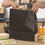The rectangular base of these paper bags with handles provides a flat surface that evenly distributes weight to reliably hold heavy items without tearing. Open-top design for easy access!