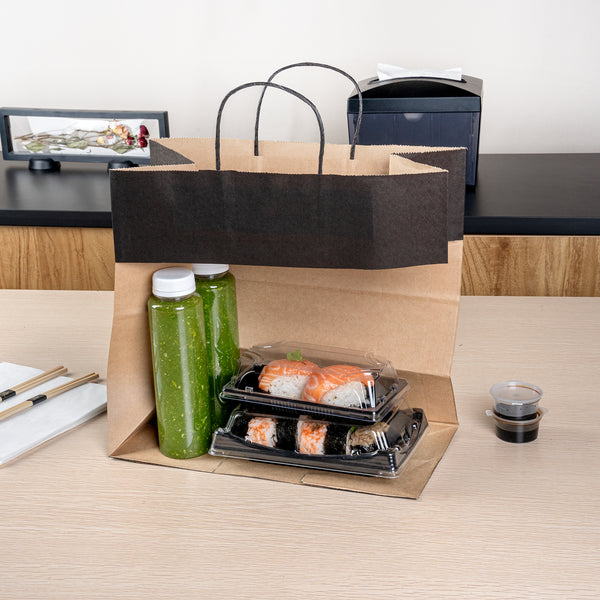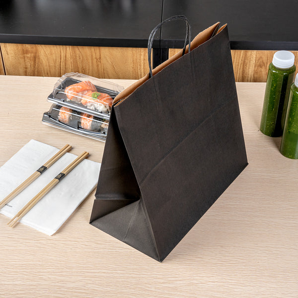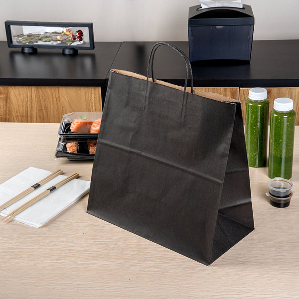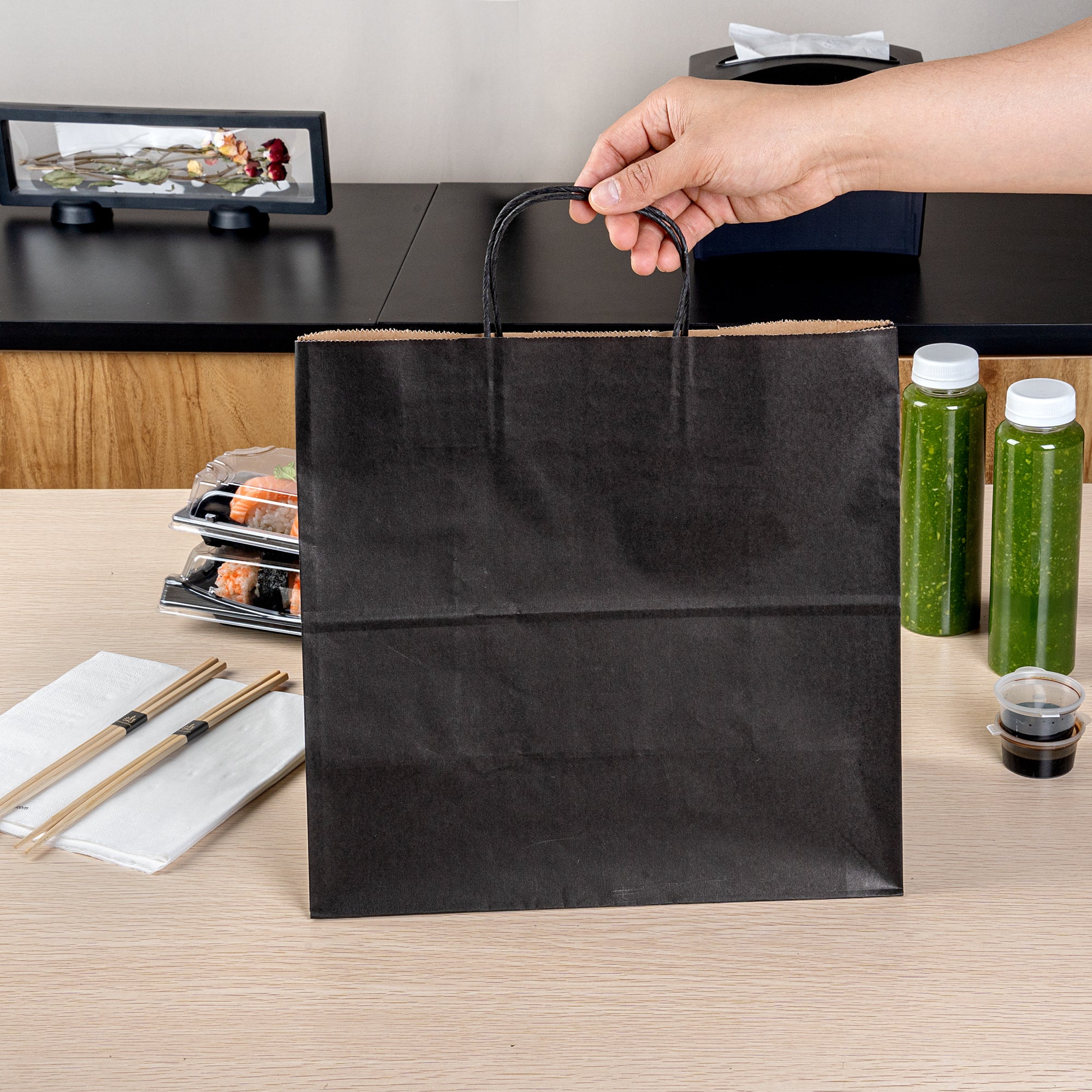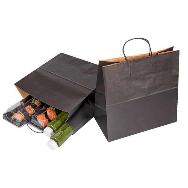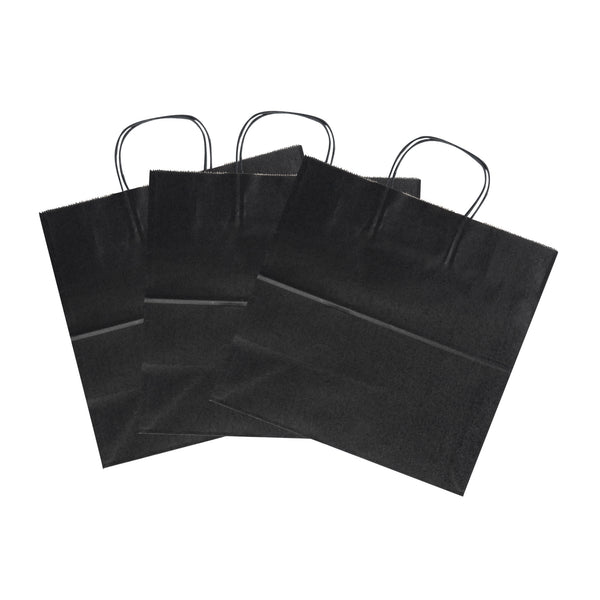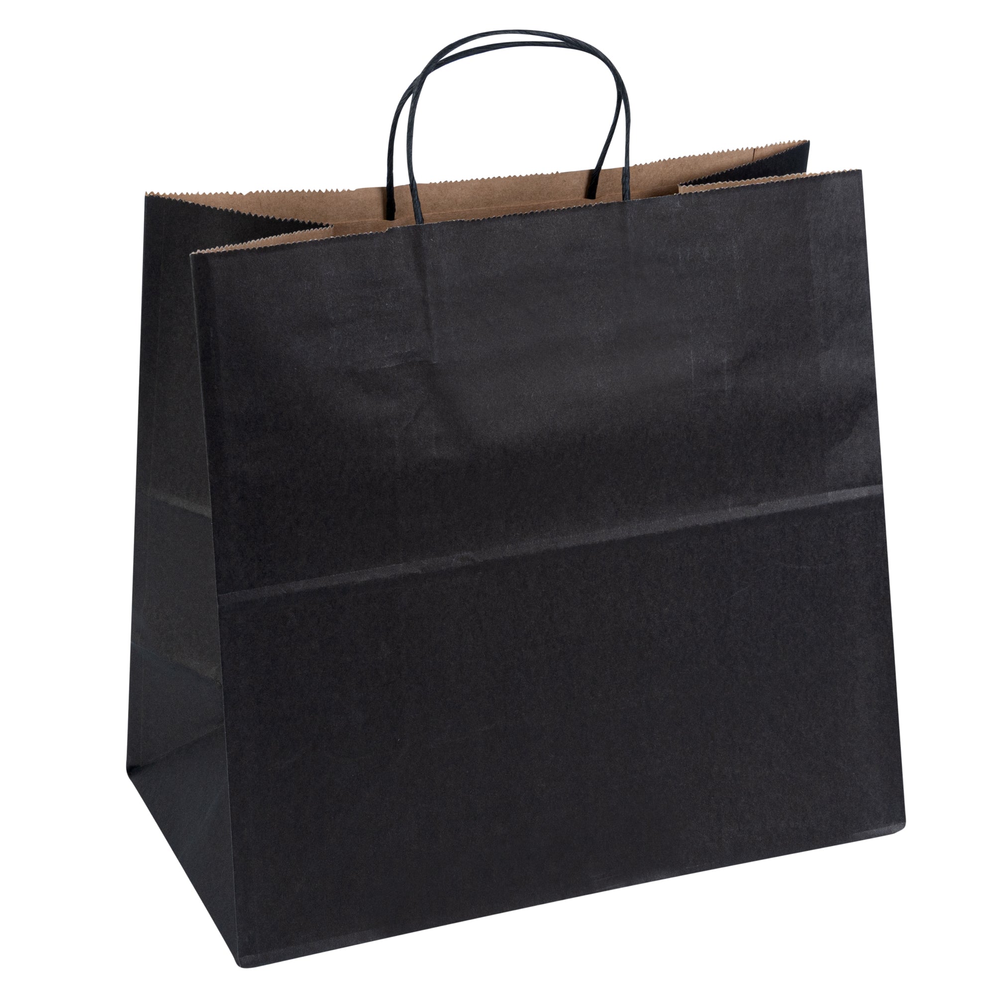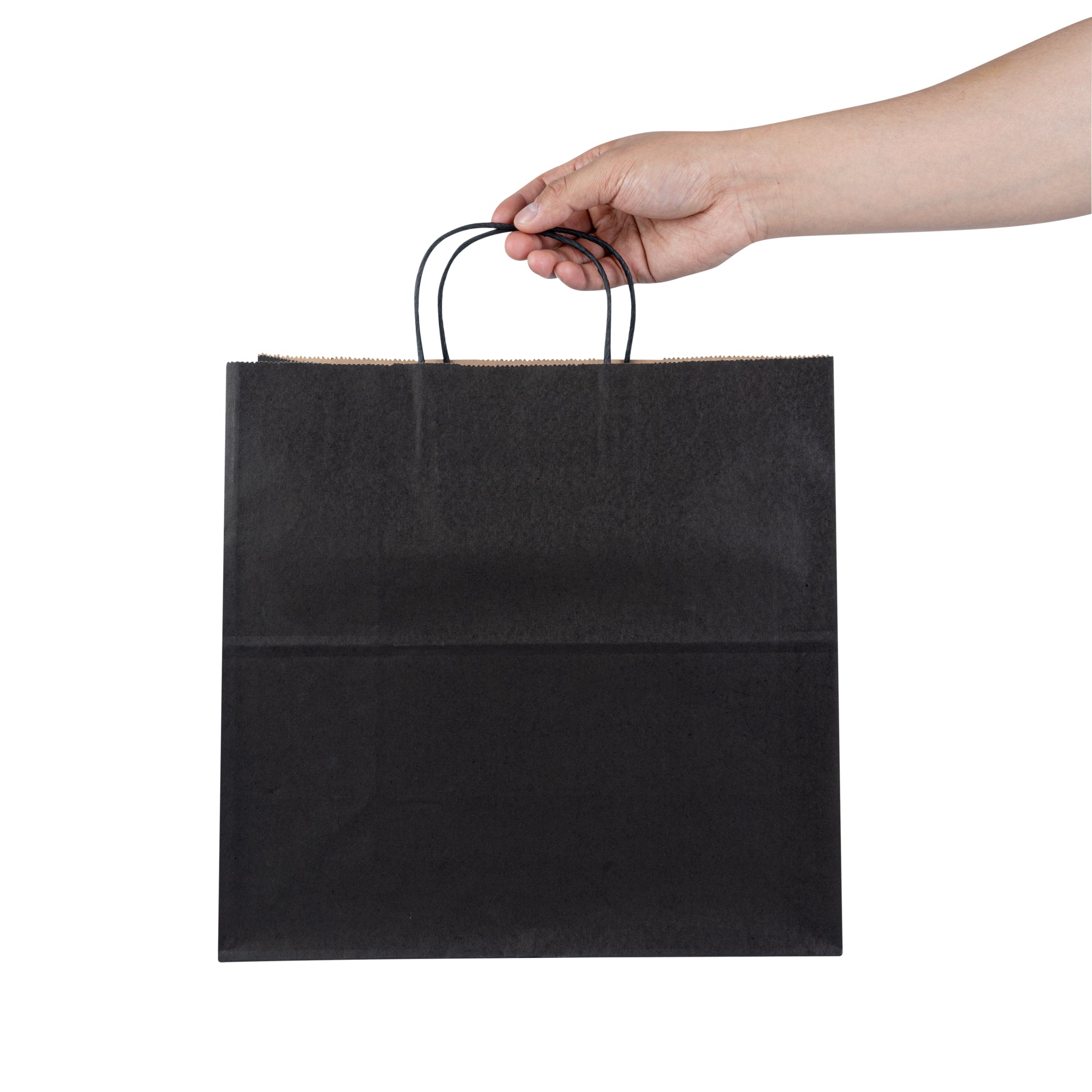Our Saving Nature Black Paper Retail Bags is the ideal solution for your sustainable shopping needs. Made with thick and durable paper, these commercially compostable shopping bags are designed to withstand heavy use and keep your items safe. Featuring easy-to-hold handles that offer a comfortable grip, these paper bags enhance the carrying experience for your customers. The unique stand-open structure ensures easy packing and access, making these recyclable paper bags ideal for shopping. These disposable paper grocery bags come with a flat bottom that provides stability, allowing them to stand upright for convenient packing and display. The black finish gives these grocery bags a sleek and elegant look, adding a touch of sophistication. With dimensions of 12.5 inches in length by 6.25 inches in width by 12.25 inches in height, these bags offer ample space for a variety of items, making them the perfect choice for your shopping needs. Sold in a 100 count box.