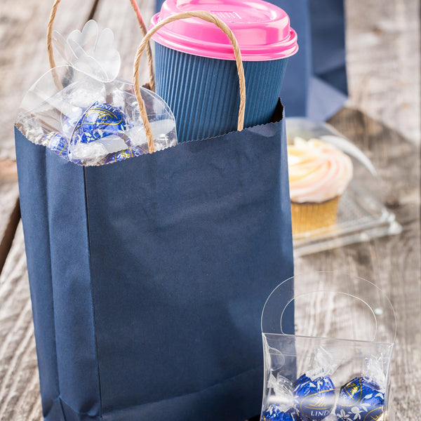 The rectangular base of these paper bags with handles provides a flat surface that evenly distributes weight to reliably hold heavy items without tearing. Open-top design for easy access!