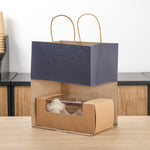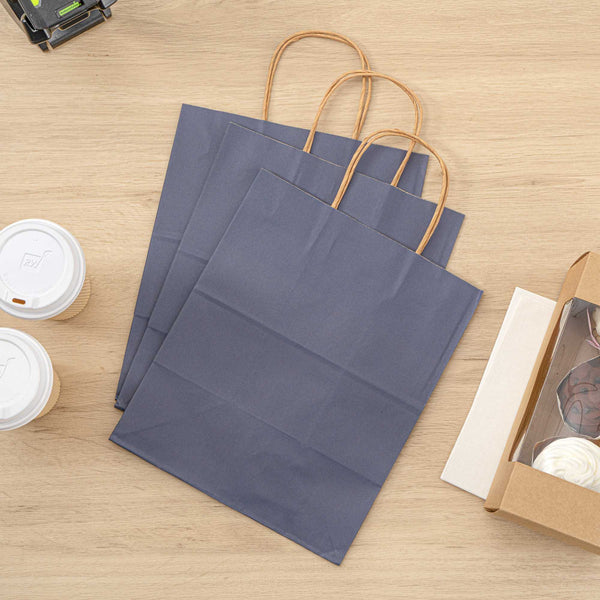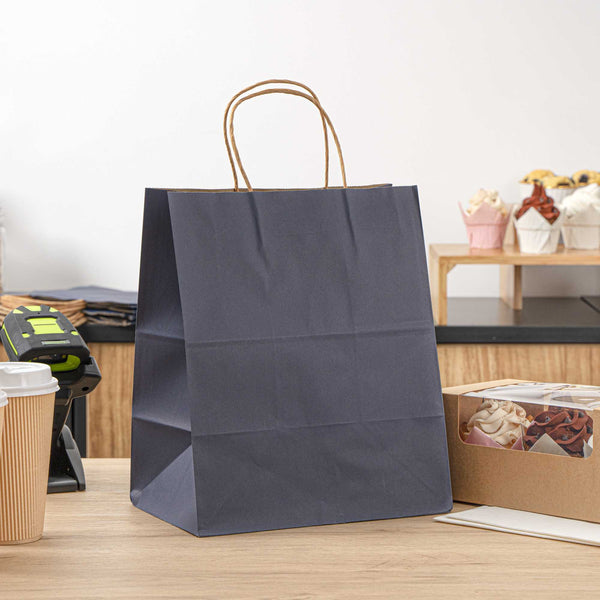 The rectangular base of these paper bags with handles provides a flat surface that evenly distributes weight to reliably hold heavy items without tearing. Open-top design for easy access!