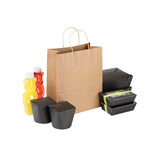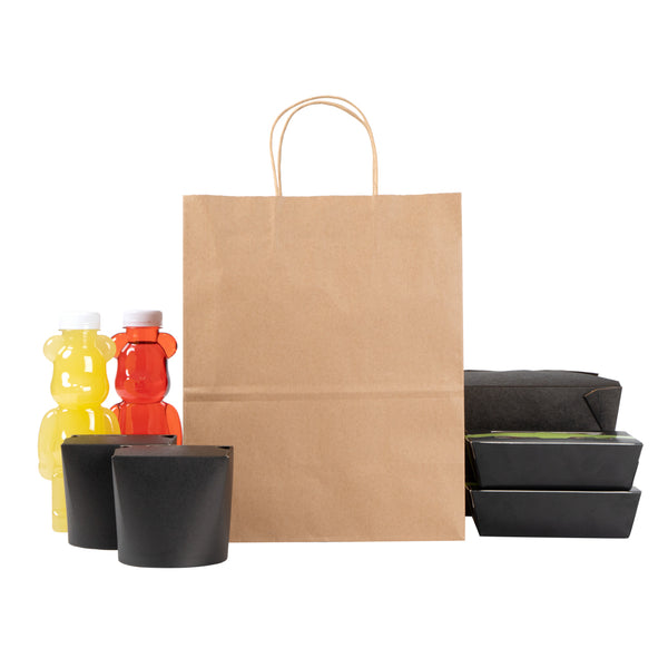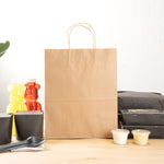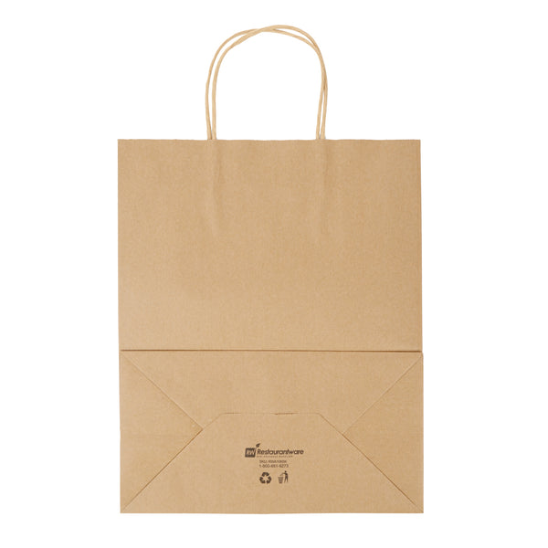 Pack up orders easily with our Saving Nature Kraft Paper Retail Bags. These paper gift bags have built-in handles so customers can effortlessly take their orders on the go. Constructed from 90 gsm kraft paper, these brown paper bags are strong and sturdy for holding items without having them fall through the bottom. Designed with a kraft finish, these grocery paper bags do not contain bleach. With a stand-open structure, these paper grocery bags can be opened upright to easily pack up merchandise in an efficient manner. For a sustainable cleanup at your foodservice establishment, these takeaway paper bags are recyclable and commercially compostable. These paper carry bags measure 10.25 inches long by 5.5 inches wide by 12.5 inches tall. Sold in a 100 count box.