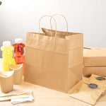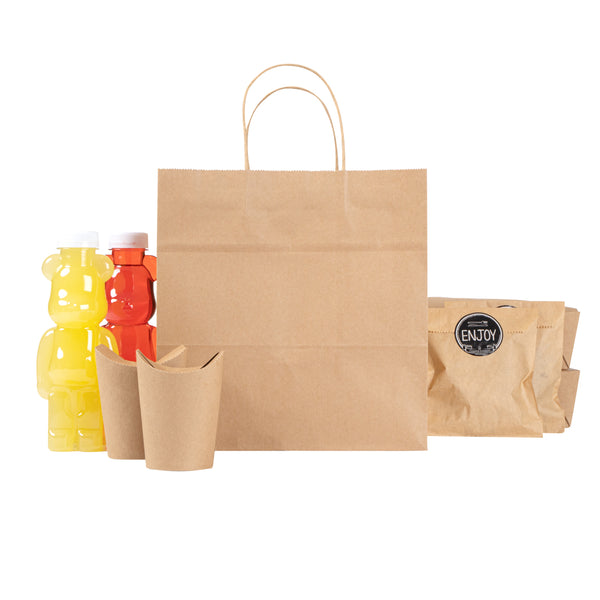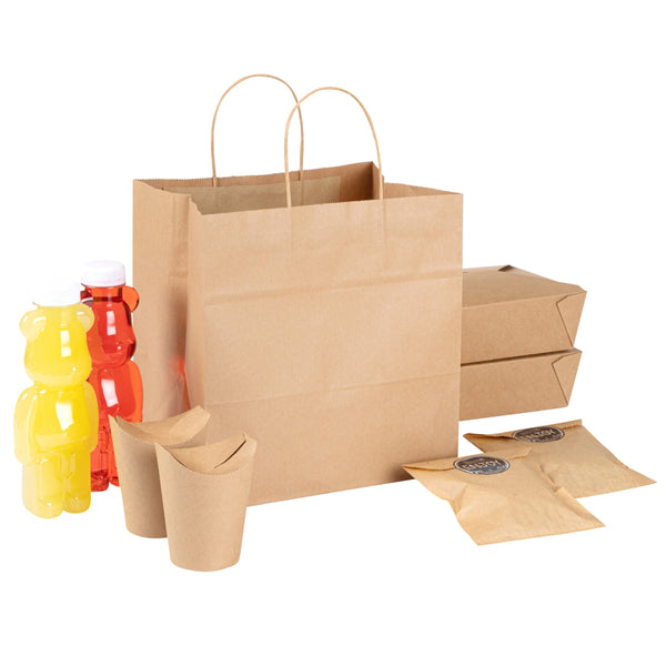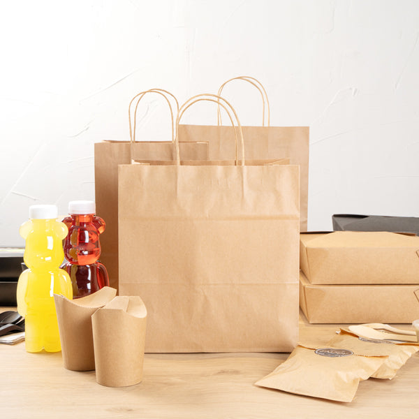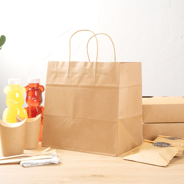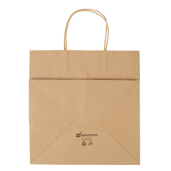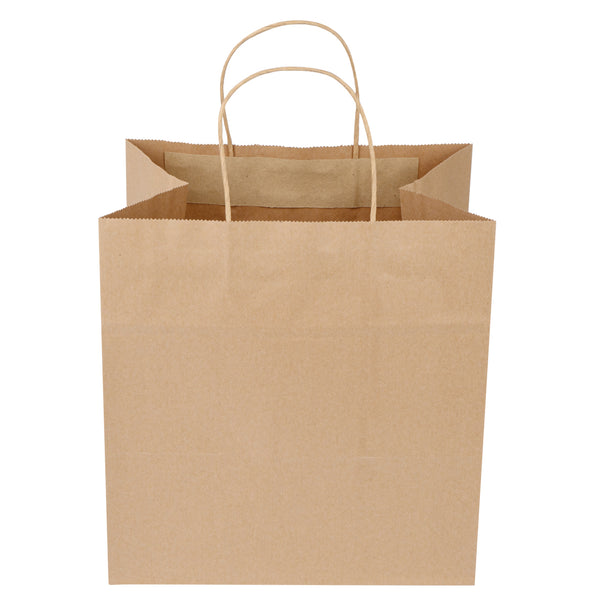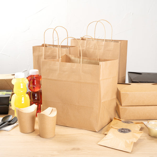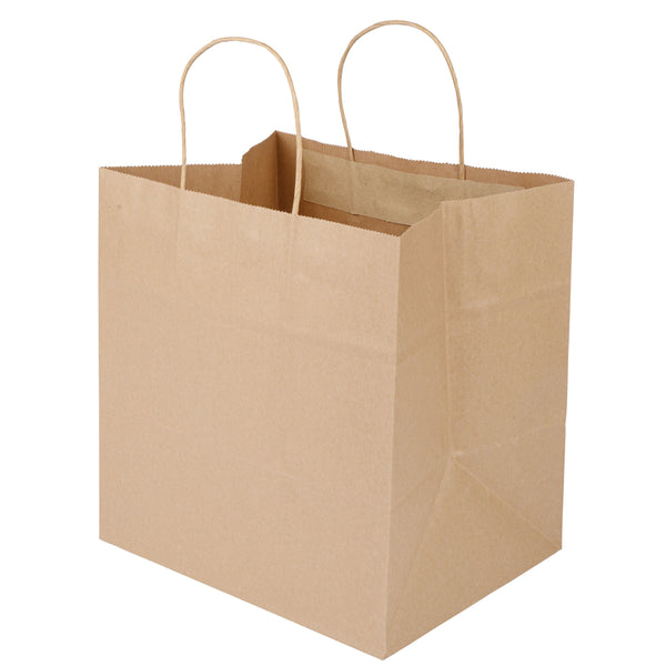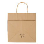 Pack up your take out with our Saving Nature Kraft Paper Retail Bags. Great for restaurants or bakeries, these paper bags have handles to easily take multiple items on the go. Made from 90 gsm kraft paper, these takeaway bags are strong and sturdy for carrying hefty meals. With a kraft finish, these grocery paper bags do not contain bleach, making them safe for food. Featuring a stand-open structure, these paper bags stand upright to make it easy to fill bags while wrapping up merchandise. These grocery paper bags are recyclable and commercially compostable for a sustainable cleaning process at your establishment. Measuring 10.25 inches long by 7.75 inches wide by 10.5 inches tall, these commercially compostable paper bags are perfect for stylishly packaging take out. Sold in a 100 count box.