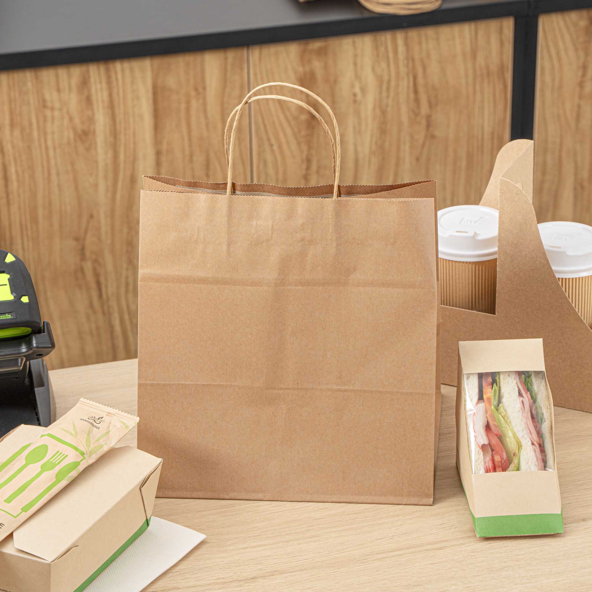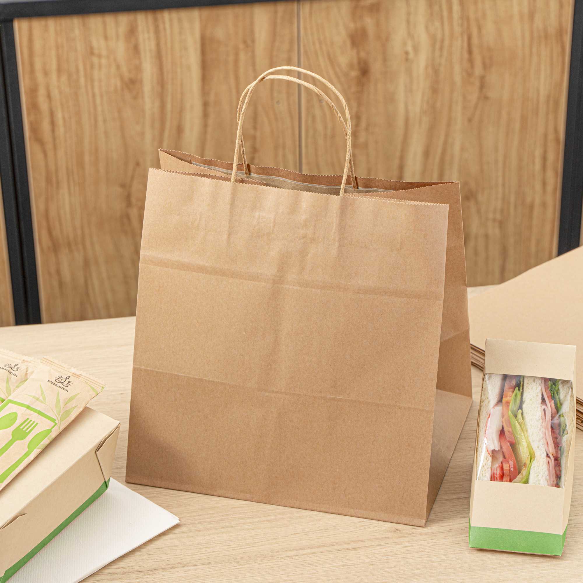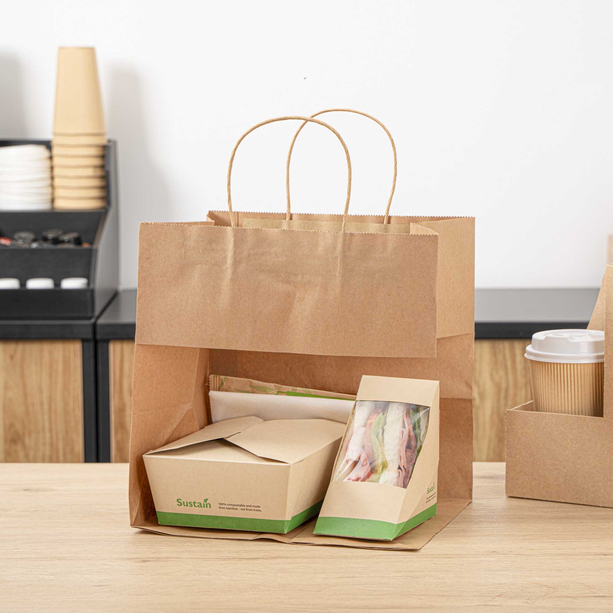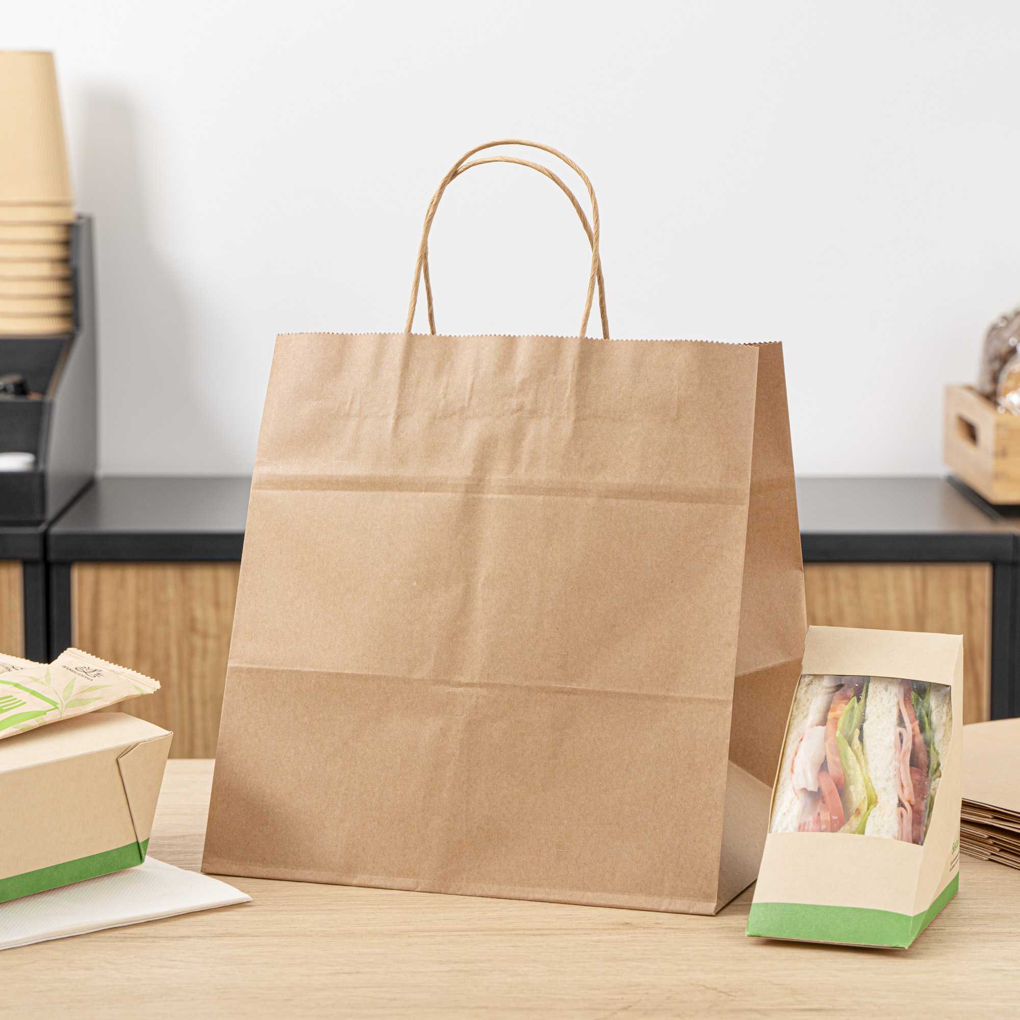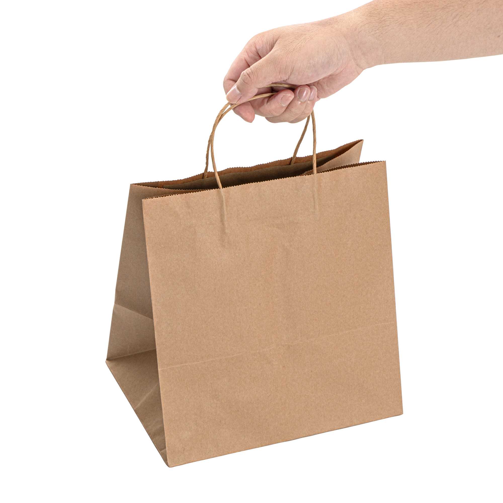 Pack up your take out with our Saving Nature Kraft Paper Retail Bags. Great for restaurants or bakeries, these paper bags have handles to easily take multiple items on the go. Made from 90 gsm kraft paper, these takeaway bags are strong and sturdy for carrying hefty meals. With a kraft finish, these grocery paper bags do not contain bleach, making them safe for food. Featuring a stand-open structure, these paper bags stand upright to make it easy to fill bags while wrapping up merchandise. These grocery paper bags are recyclable and commercially compostable for a sustainable cleaning process at your establishment. Measuring 10.25 inches long by 7.75 inches wide by 10.5 inches tall, these commercially compostable paper bags are perfect for stylishly packaging take out. Sold in a 100 count box.