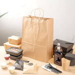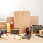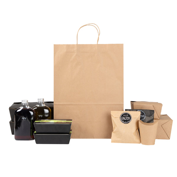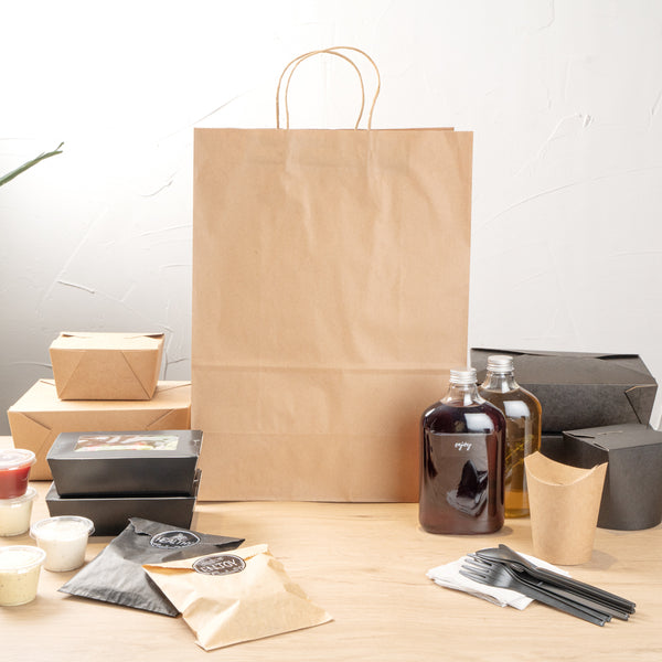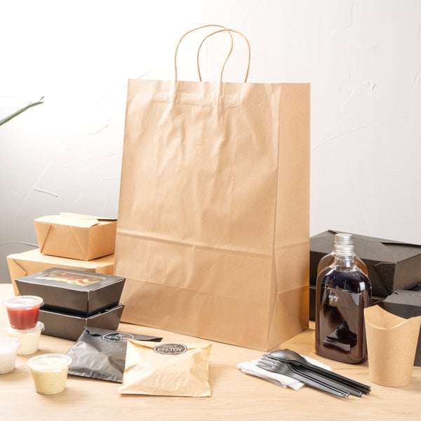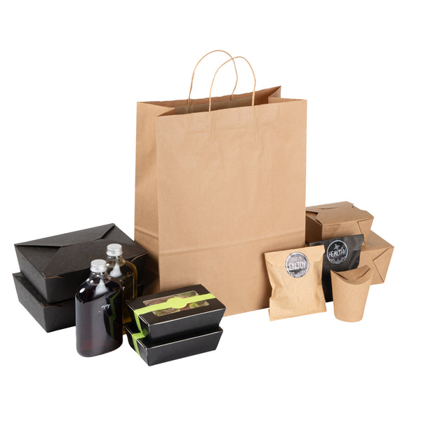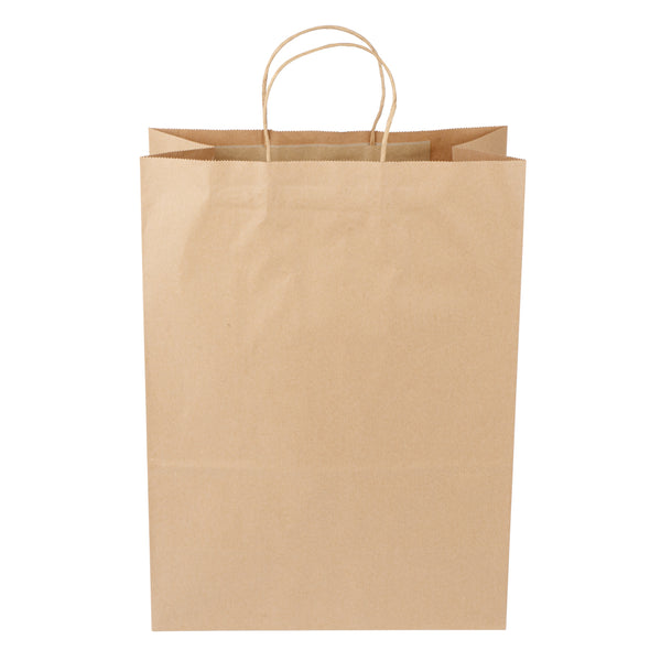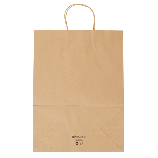 Pack your retail items the eco-friendly way with our Saving Nature Kraft Paper Retail Bags. Crafted from eco-friendly paper, these brown paper bags are commercially compostable to reduce the carbon footprint at your foodservice establishment. Designed with 90 GSM paper construction, these retail bags can hold multiple and hefty meals without having them fall through the bottom. Featuring loop-style handles, these kraft paper bags allow you to comfortably transport packaged meals with one hand. These paper bags arrive flat to save space in your storage area. With a flat bottom, these kraft paper bags can stand upright when opened to speed up your packaging process. These kraft shopping bags measure 12.5 inches in length by 17 inches in height and have an expandable width of 6.25 inches. Sold in a 100 count box.
