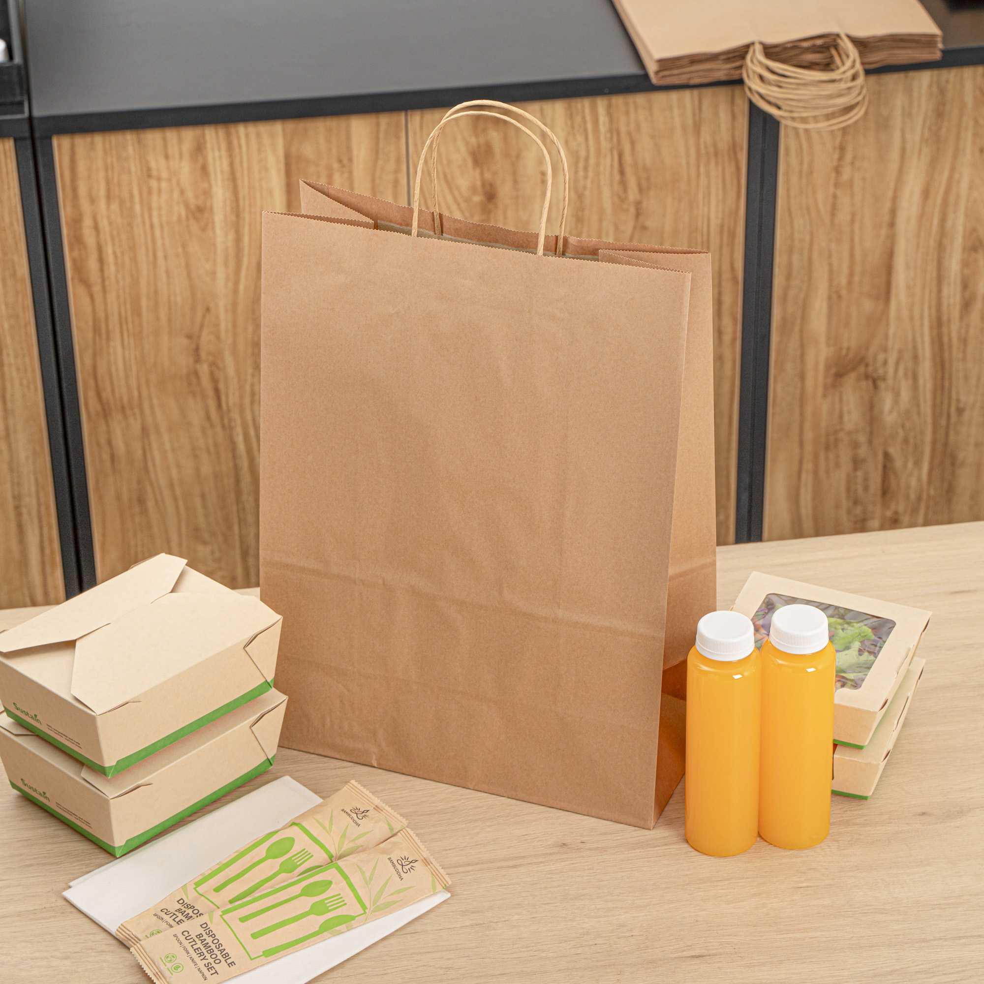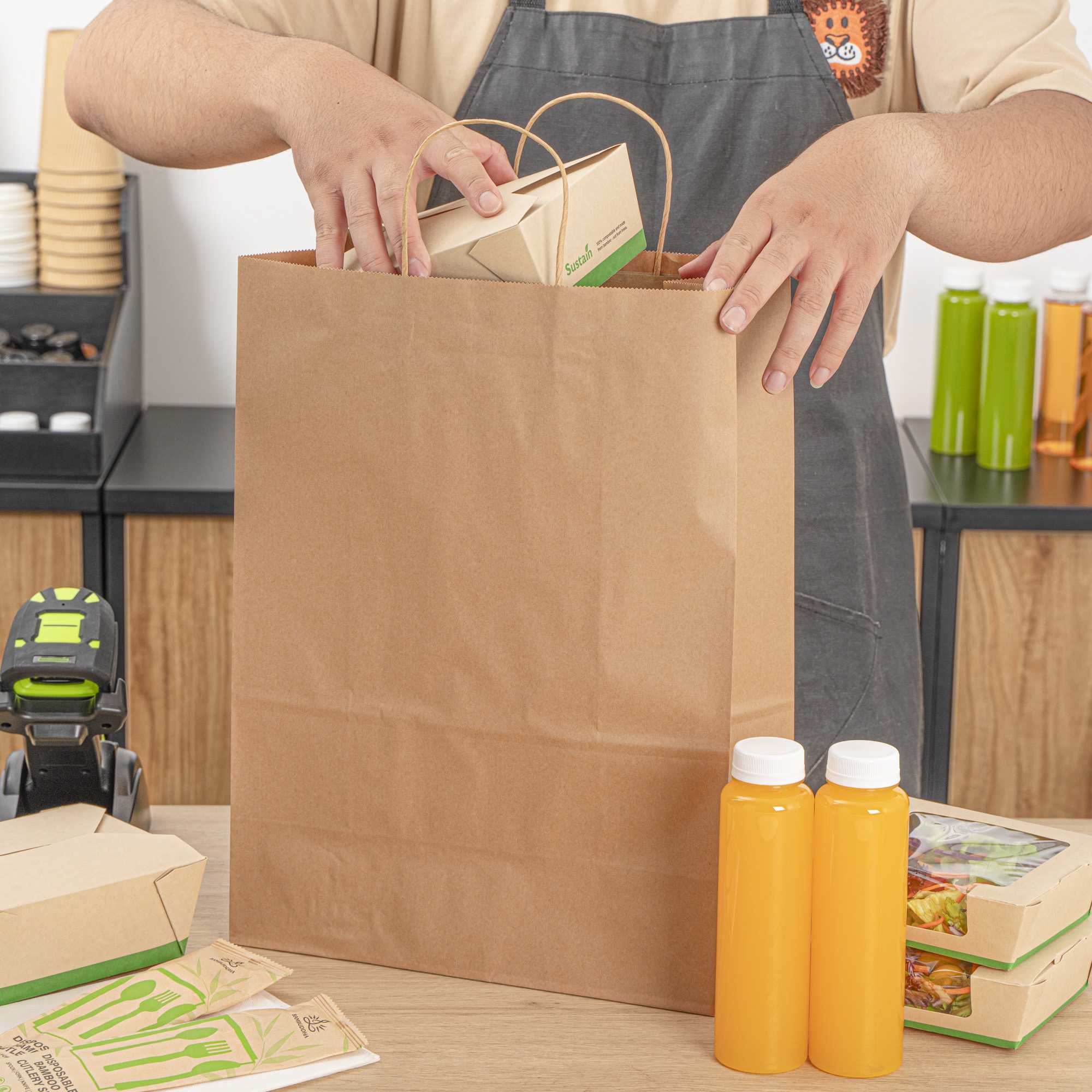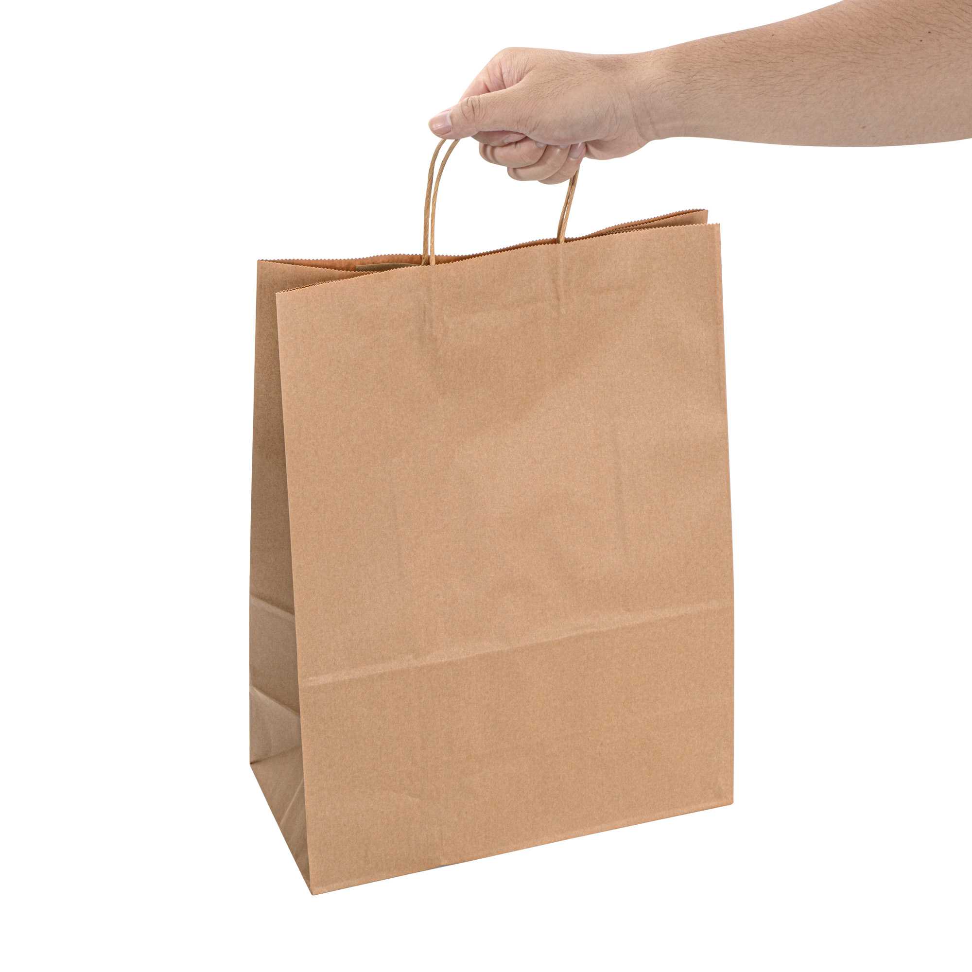 Pack your retail items the eco-friendly way with our Saving Nature Kraft Paper Retail Bags. Crafted from eco-friendly paper, these brown paper bags are commercially compostable to reduce the carbon footprint at your foodservice establishment. Designed with 90 GSM paper construction, these retail bags can hold multiple and hefty meals without having them fall through the bottom. Featuring loop-style handles, these kraft paper bags allow you to comfortably transport packaged meals with one hand. These paper bags arrive flat to save space in your storage area. With a flat bottom, these kraft paper bags can stand upright when opened to speed up your packaging process. These kraft shopping bags measure 12.5 inches in length by 17 inches in height and have an expandable width of 6.25 inches. Sold in a 100 count box.