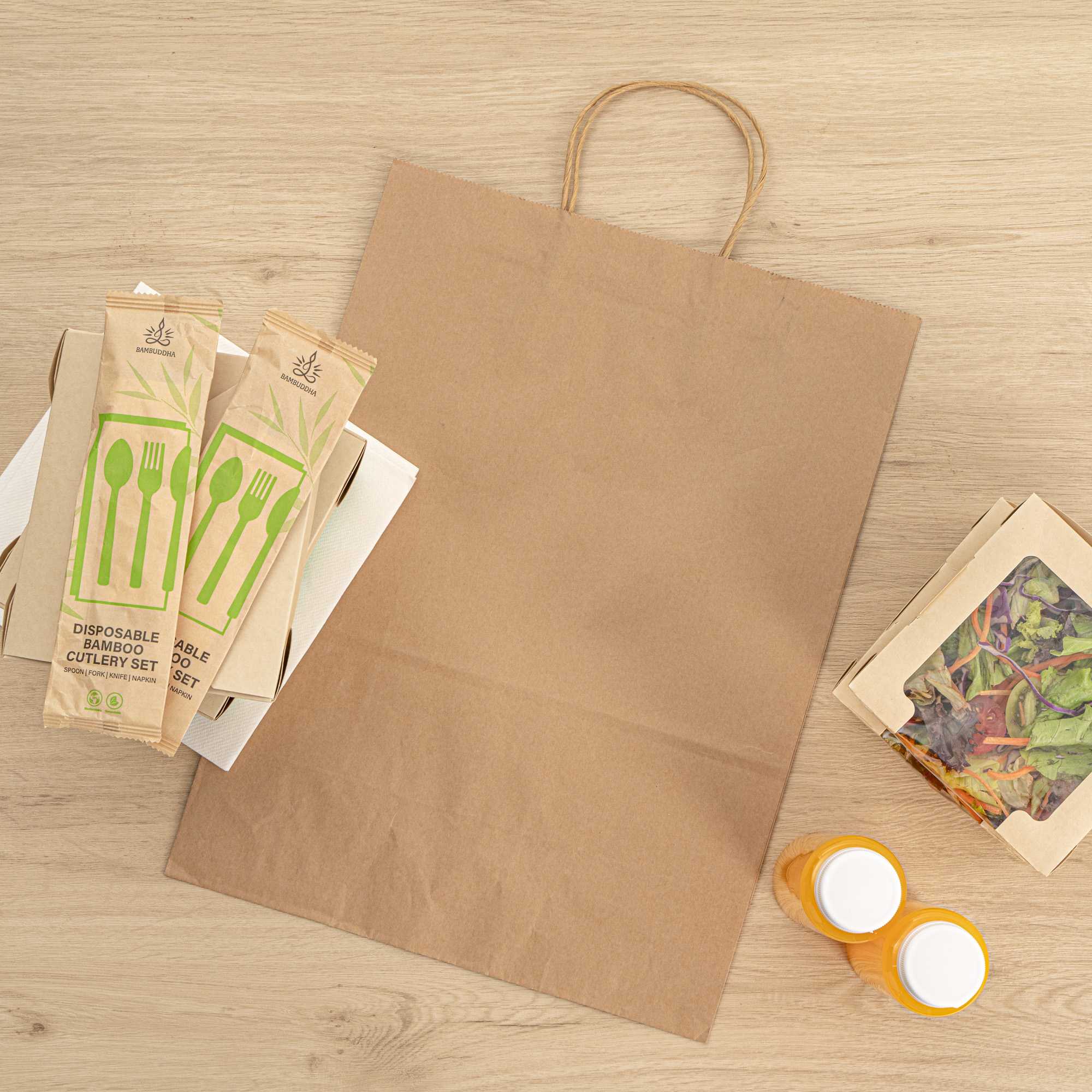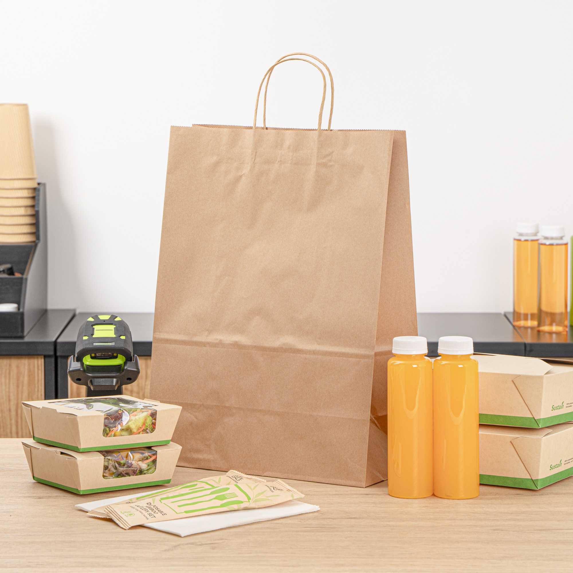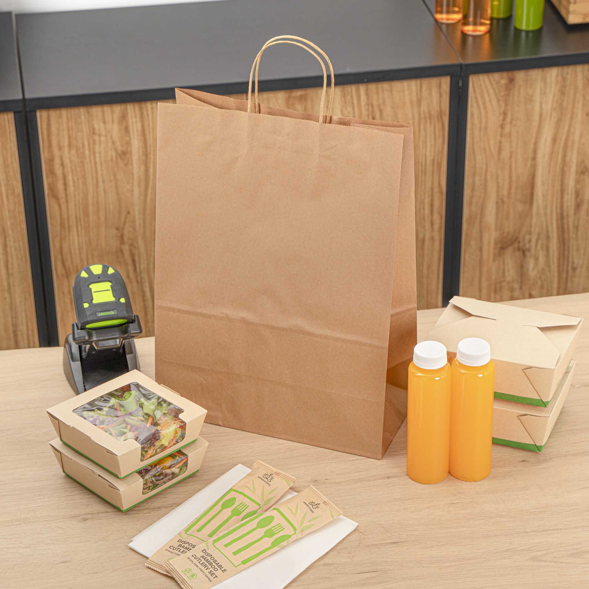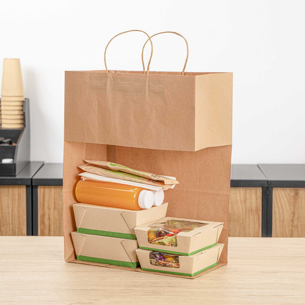 Pack your retail items the eco-friendly way with our Saving Nature Kraft Paper Retail Bags. Crafted from eco-friendly paper, these brown paper bags are commercially compostable to reduce the carbon footprint at your foodservice establishment. Designed with 90 GSM paper construction, these retail bags can hold multiple and hefty meals without having them fall through the bottom. Featuring loop-style handles, these kraft paper bags allow you to comfortably transport packaged meals with one hand. These paper bags arrive flat to save space in your storage area. With a flat bottom, these kraft paper bags can stand upright when opened to speed up your packaging process. These kraft shopping bags measure 12.5 inches in length by 17 inches in height and have an expandable width of 6.25 inches. Sold in a 100 count box.