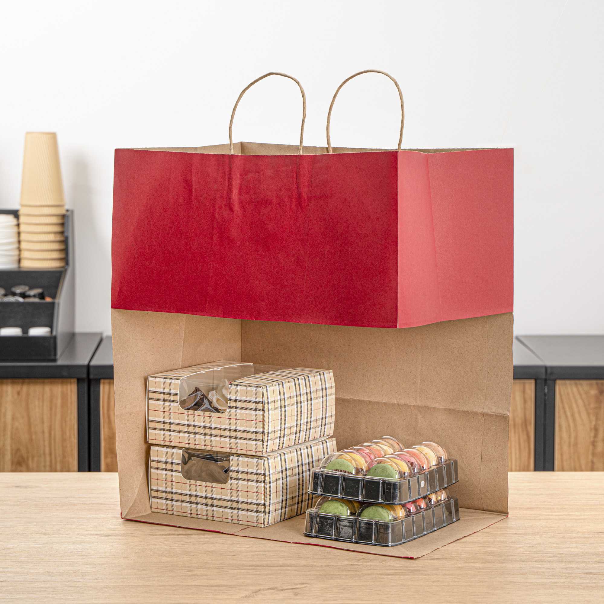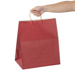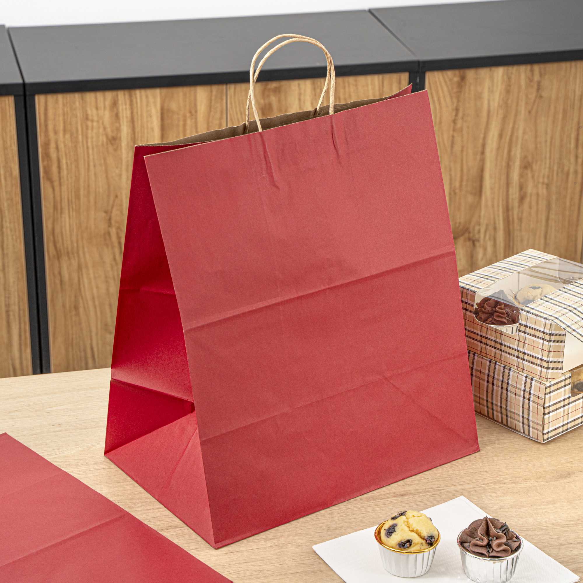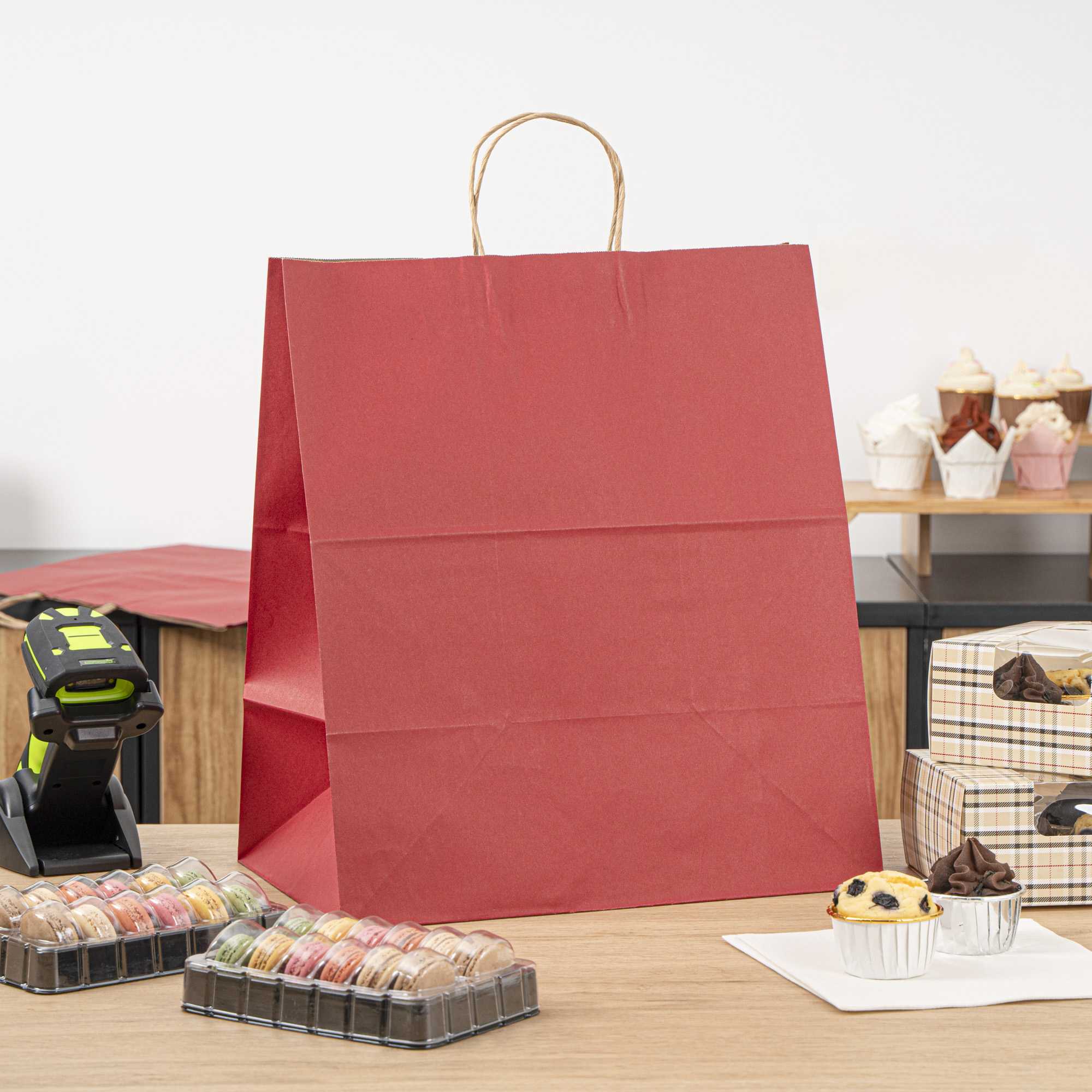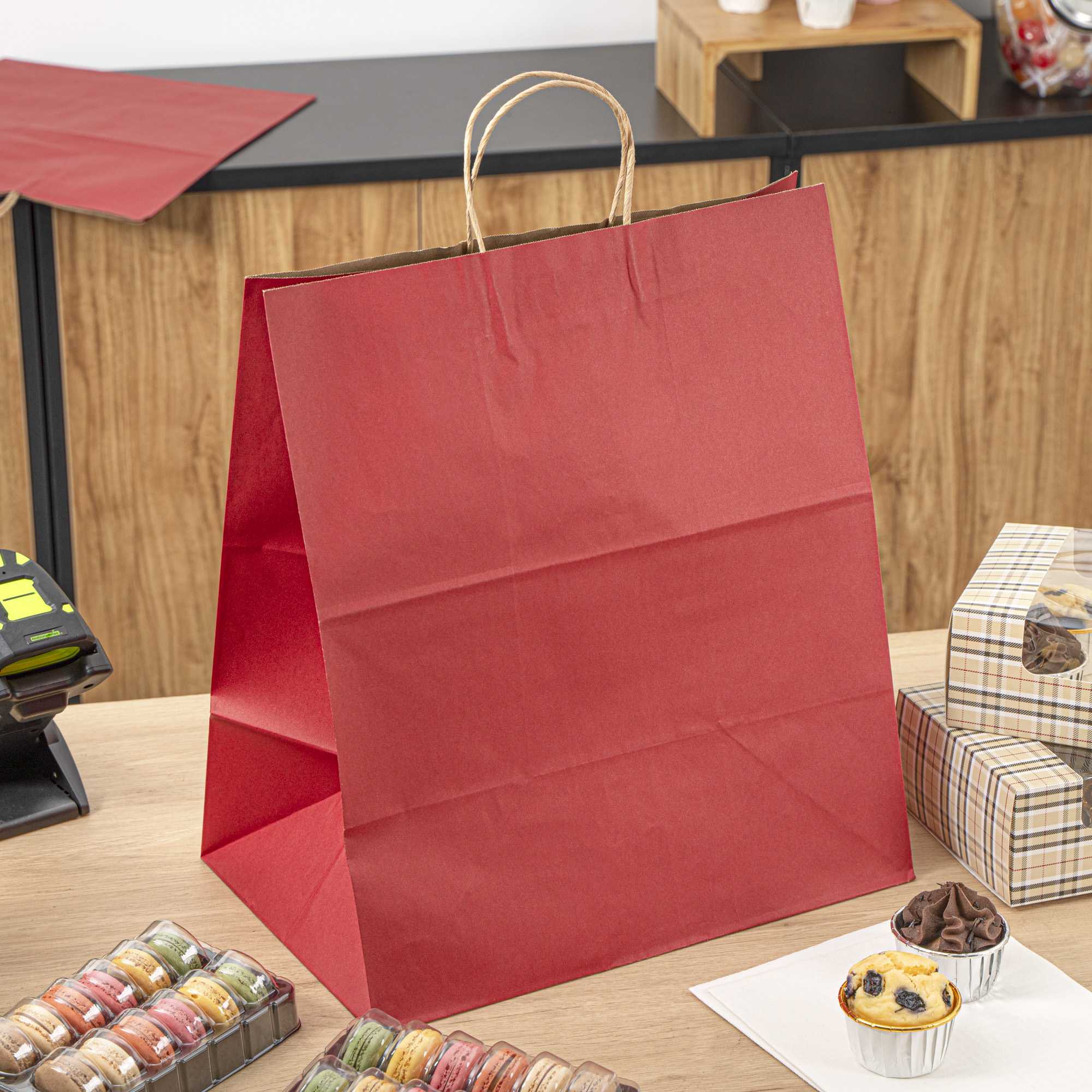 The rectangular base of these paper bags with handles provides a flat surface that evenly distributes weight to reliably hold heavy items without tearing. Open-top design for easy access!