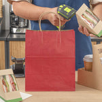 The rectangular base of these paper bags with handles provides a flat surface that evenly distributes weight to reliably hold heavy items without tearing. Open-top design for easy access!