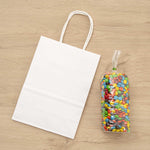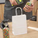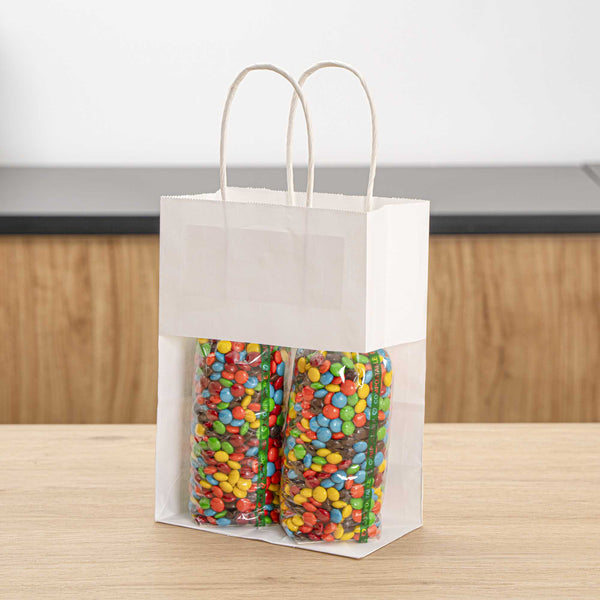 The rectangular base of these paper bags with handles provides a flat surface that evenly distributes weight to reliably hold heavy items without tearing. Open-top design for easy access!