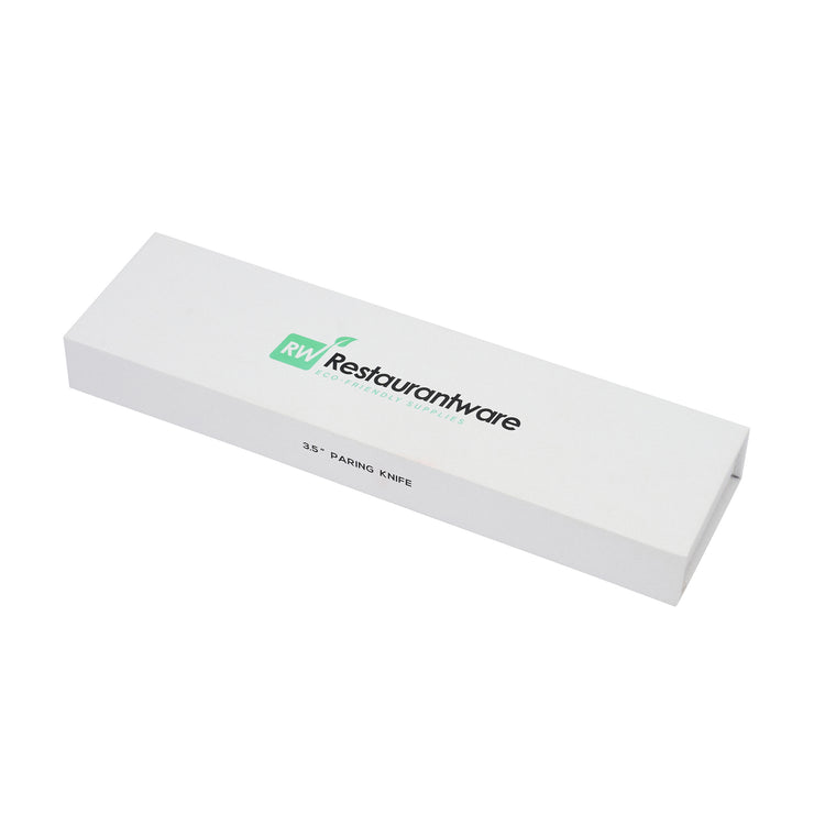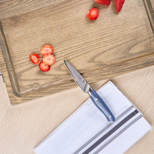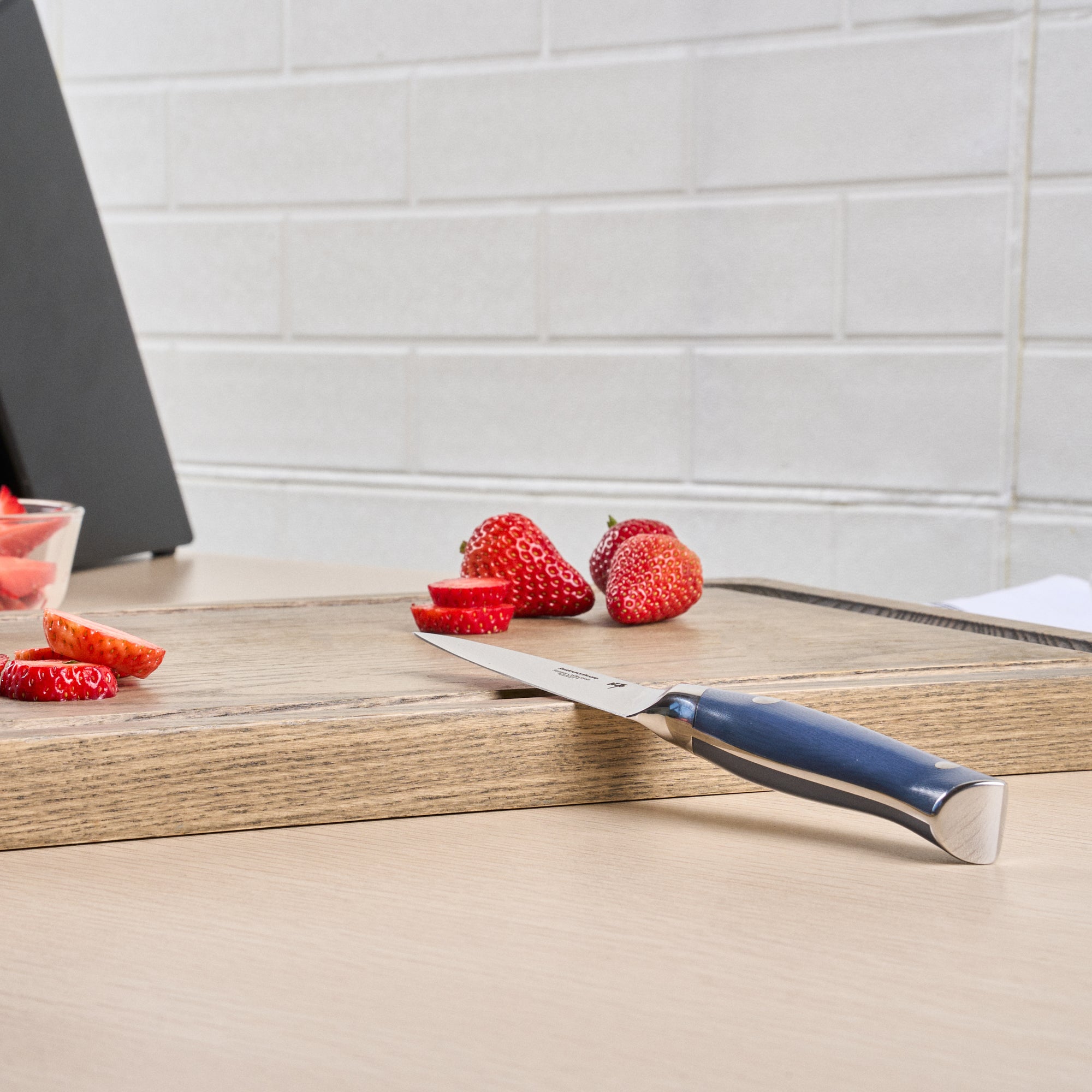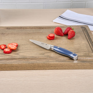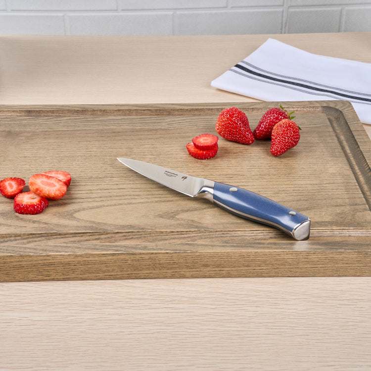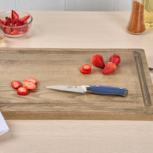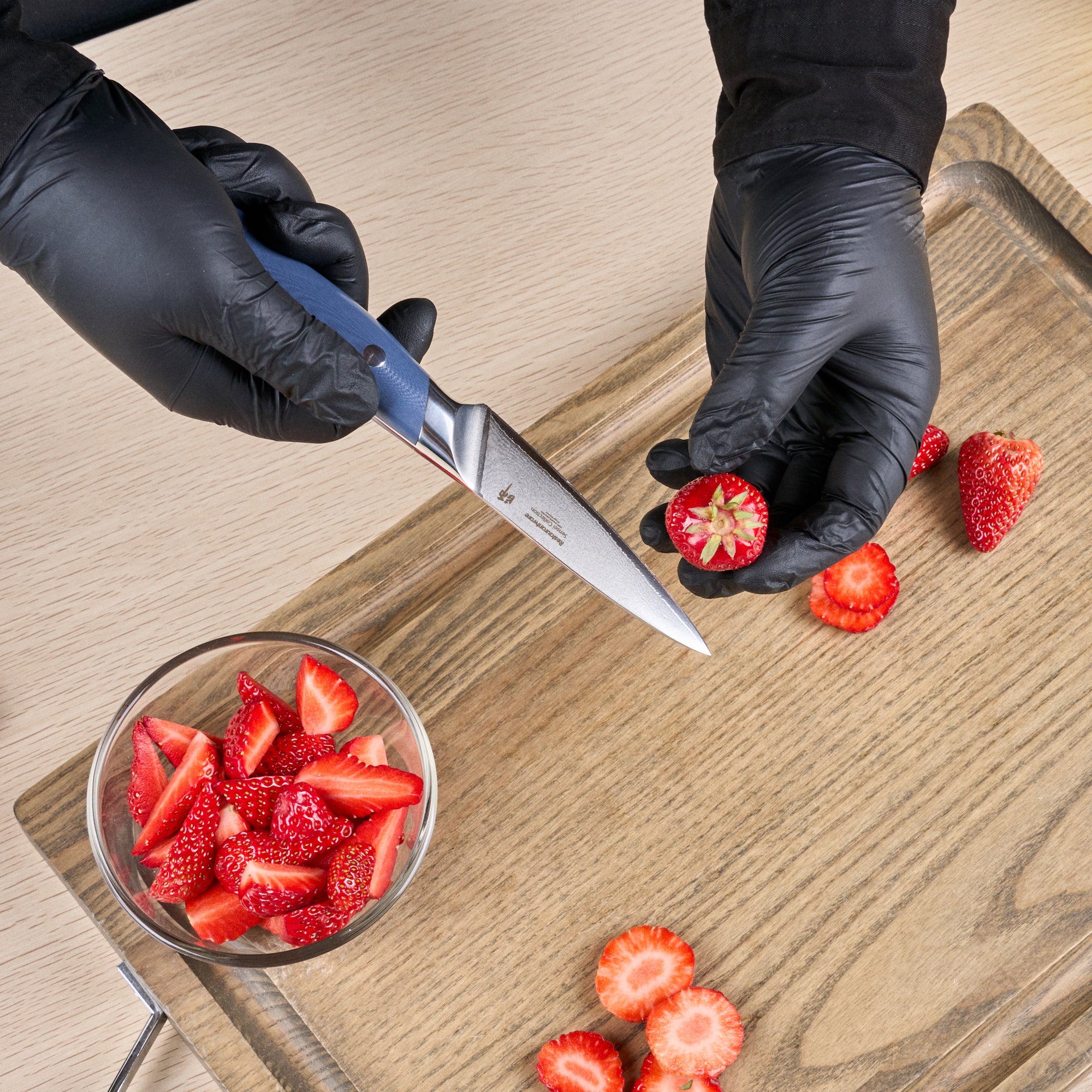 Skillfully peel, slice, and dice fruits and vegetables with our Sensei Blue Steel Paring Knife. This 3 inch professional kitchen paring knife is constructed from high-grade Japanese VG-10 steel, which is renowned for its extreme durability and superior cutting edge. Equipped with a weighted and triple-riveted handle, this Japanese peeling knife provides a well-balanced and ergonomic grip - promoting effortlessly comfortable use and preventing sore wrists. Its 67-layer Damascus steel blade, combined with its full tang construction, ensures that you are able to execute perfectly precise and clean cuts every time. In addition, each of these Japanese kitchen knives is equipped with an extremely durable G10 handle that is resistant to wetness - minimizing the risk of knife slippage and accidents. Our luxurious Sensei Blue Steel Collection is specifically designed for busy professional kitchens, where expert chefs demand the most of their equipment. Shipped in a 1 count box.