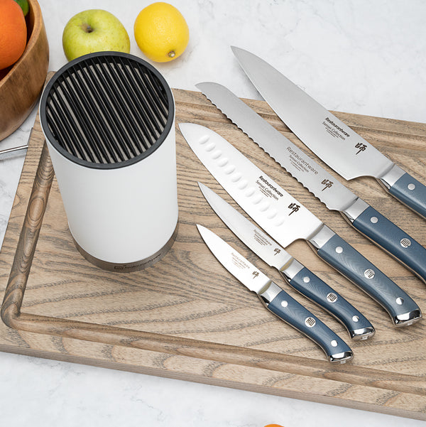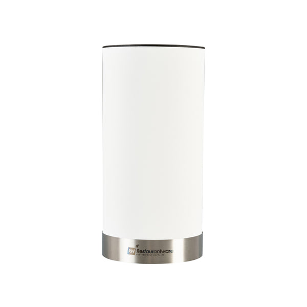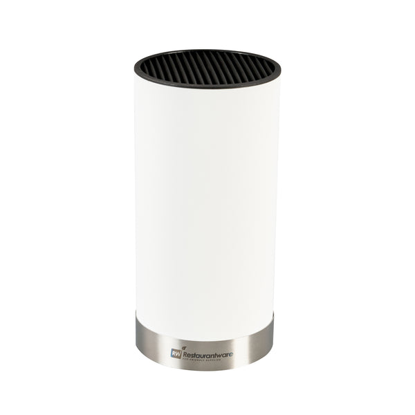 Store your chef's knife in our Sensei Round White Knife Block. This knife stand has rubbery slots which have a soft touch to maintain the sharpness of your blades. Plus, this knife holder can securely hold multiple knives and provides easy access to your kitchen tools. With a white finish and round shape, this universal knife block easily blends with the existing equipment in your restaurant's kitchen. Made with a plastic exterior, this universal knife holder is strong and sturdy for long-lasting use at your restaurant, bakery, or catering service. For a quick cleaning process, this knife block can be easily disassembled and cleaned with a wet cloth. This global knife block measures 4.5 inches in diameter and 9 inches in height. Sold in a 1 count box.