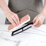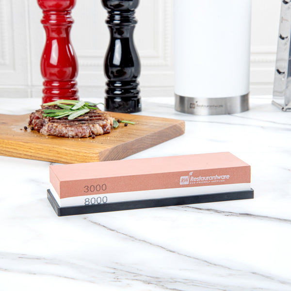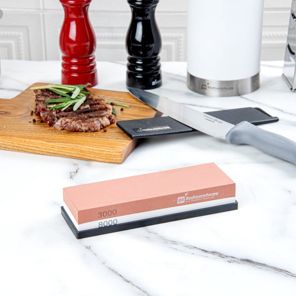 Keep knife blades sharp with our Sensei Whetstone Knife Sharpening Set. This whetstone knife sharpening set includes a knife sharpener and a silicone holder to skillfully sharpen dull knives. Featuring a non-slip silicone holder, this sharpening set stays securely in its place while sharpening knives to maintain a safe work environment. This knife whetstone set has a dual side grit; 3000 grit for sharpening knives and 8000 grit for a super fine finish. For multi-purpose use, this knife sharpening set allows you to achieve sharp blades on your chef knife, santoku knife, or vegetable knife. Made from heavy-duty corundum, the sharpening stone is durable and made to last. This knife sharpening stone set measures 7 inches long by 2.25 inches wide by 1 inch tall. Sold in a 1 count box.
