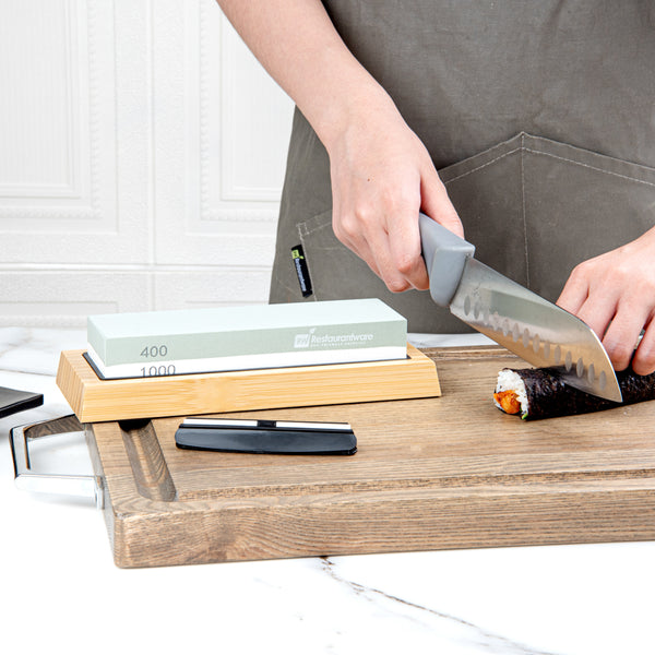Expertly sharpen dull kitchen knives with our Sensei Whetstone Knife Sharpening Set. With a whetstone knife sharpener, angle guide, and a bamboo base, this knife sharpening stone set is perfect for refining your knives' edges and keeping them in pristine condition. This sharpening set features a non-slip bamboo base that safely keeps the stone in place while in use to avoid accidents. The two-side grit of this whetstone knife sharpening set allows you to use the 400 grit side for any chipped edges and the 1000 grit side to sharpen your knife. This knife whetstone set includes an angle guide to expertly sharpen all kinds of knives, such as sushi knives, steak knives, or santoku knives. The sharpening stone of this whetstone set is made from strong corundum for durability. Measuring 8.25 inches in length by 3.5 inches in width by 2.25 inches in height, this knife sharpening set is sold in a 1 count box.