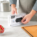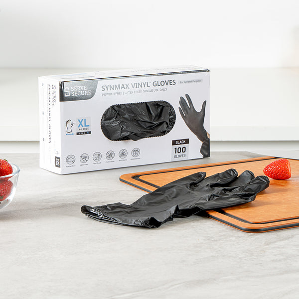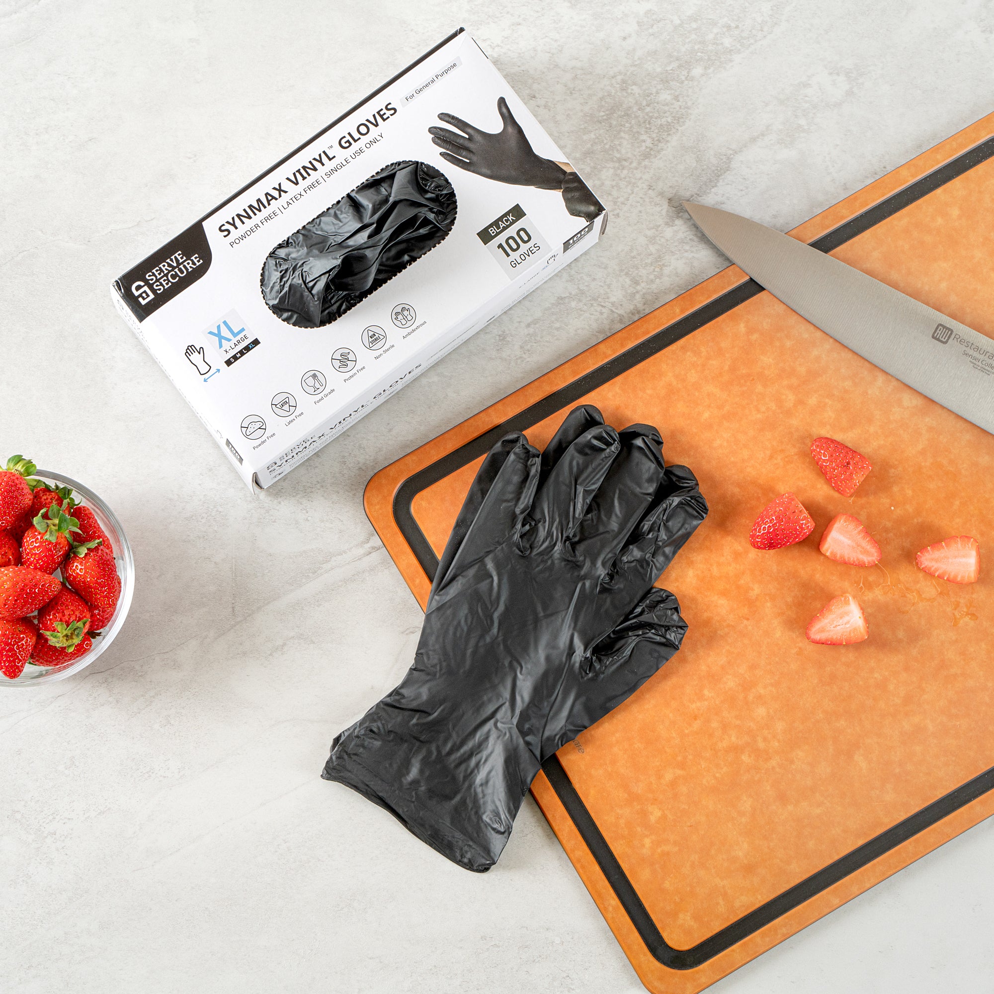 Maintain safety and hygiene with reliable disposable gloves. Serve Secure Latex-Free Disposable Gloves feature a powder-free design that minimizes contamination risks, ensuring compliance with food safety standards. Made from Synmax Vinyl, these gloves offer a latex-free composition that significantly reduces the chance of allergic reactions among staff, making them essential food prep gloves. With a higher tensile strength, they ensure durability during demanding tasks, providing a seamless fit for extra-large hands and enhancing dexterity. The sleek black color presents a professional look while easily identifying glove usage in various settings, making them ideal black vinyl gloves for commercial kitchens and catering events. Constructed with recyclable materials, these gloves support sustainable operations while maintaining a high level of protection and comfort. Each order includes 1000 Serve Secure Latex-Free Disposable Gloves.