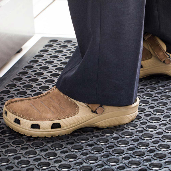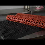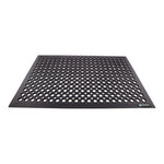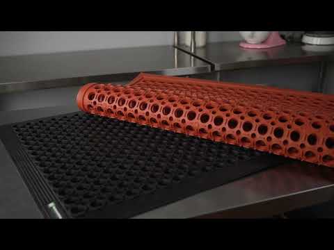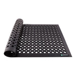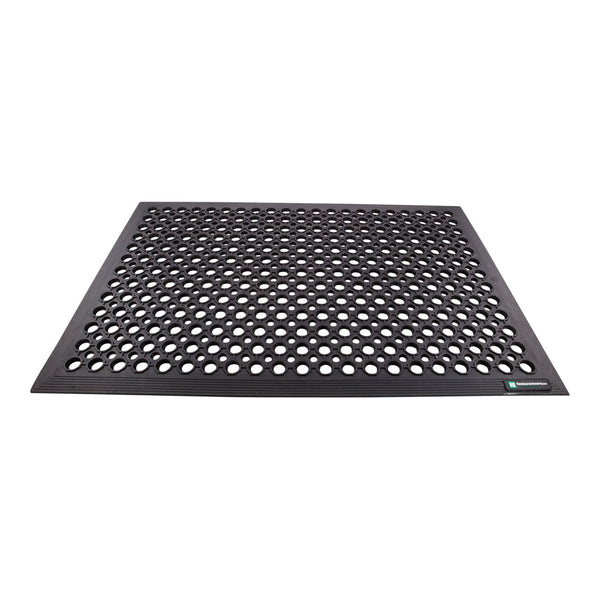 Avoid slip and falls with our Serve Secure Rectangle Black Rubber Floor Mat. Crafted from high-quality rubber, this black floor mat is anti-fatigue and maintains a firm grip on the floor, staying in place under high foot-traffic areas. The durable construction of this rubber floor mat makes it withstand the use of industrial work settings. With beveled edges, this rubber mat reduces workplace hazards by minimizing the risk of tripping and falling over. This rubber mat has honeycomb holes that easily drain liquids to create an even, stable footing. Perfect for various foodservice establishments, this floor mat is easy to roll and clean. This doormat measures 60 inches in length by 36 inches in width. Shipped in a 1 count box.