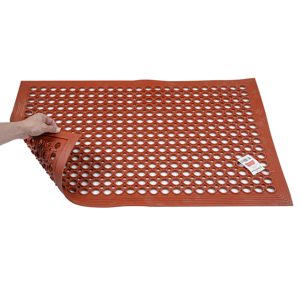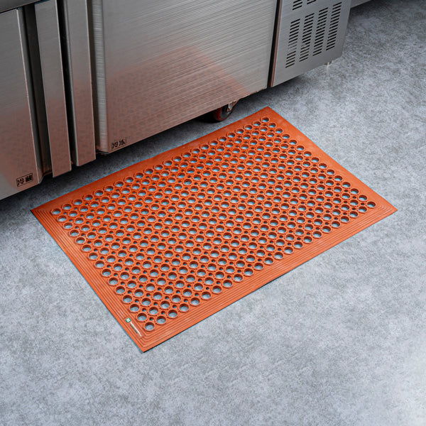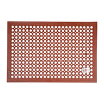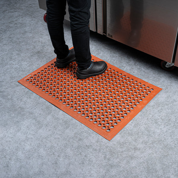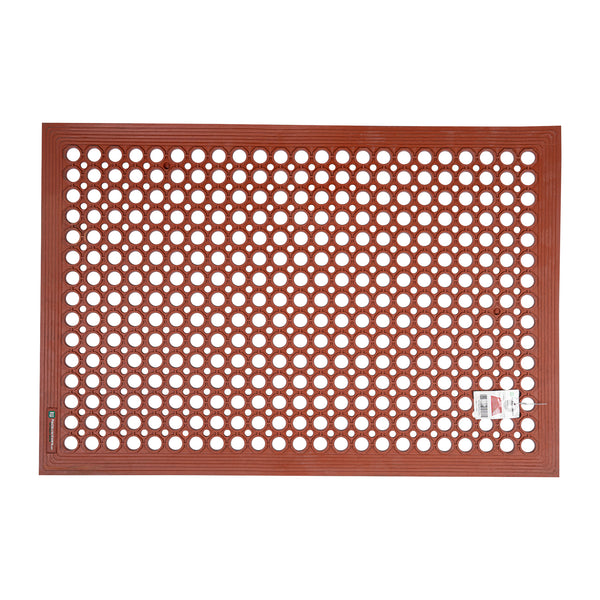 Eliminate slippery floors with our Serve Secure Red Rubber Floor Mat. Crafted from high-quality rubber, this red floor mat has an anti-fatigue construction that is designed to combat muscle fatigue while standing on hard surfaces. This rubber mat is grease-resistant and perfect for various business establishments making slick or wet floors less slippery. With beveled edges, this floor mat eliminates the risk of tripping or falling over. The holes of this rubber floor mat easily drain liquids to create a stable surface for balanced footing. This doormat measures 36 inches long by 24 inches wide. Shipped in a 1 count box.