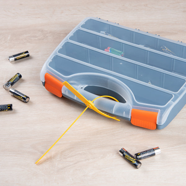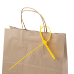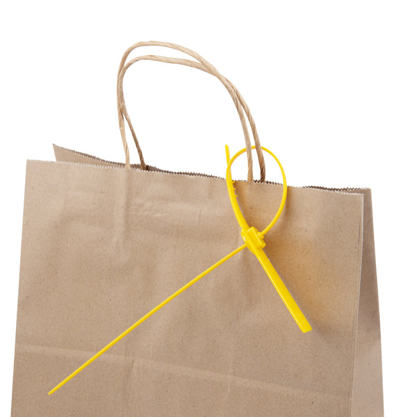 Ensure your take out bags stay closed with our Serve Secure Yellow Security Seal / Zip Ties. With a tamper-evident design, these tie wrap can only be taken off of products with a pair of scissors. The self-locking feature of these zip ties securely locks or seals items to protect from tampering or theft. To securely seal merchandise, these cord ties have an attached tail that can be pulled through the keyhole. These zip ties are equipped with a handle that can be written on to keep track of inventory or organize products. Featuring a yellow finish, these heavy-duty zip allow you to easily spot items in your storage area or on the shelf. Crafted from premium plastic, these plastic cable ties are disposable for easy cleanup after use. These heavy-duty zip ties measure 15.75 inches in length. Sold in a 100 count box.