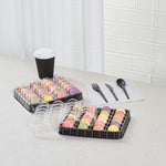 Protect your delicate confections with our Shock Safe Rectangle Black Plastic Macaron Take Out Boxes. The molded macaron-shaped slots of these macaron boxes securely fit 24 macarons. Constructed from high-quality plastic, these rectangular macaron gift boxes are recyclable. Included with a shockproof lid built with triple-layer protection, these plastic macaron boxes ensure that your sweet delights remain untouched during delivery. To showcase your treats, these macaron boxes come with a formfitting cover with a clear finish. Decked with an elegant black finish, these plastic macaron boxes accentuate the bright macarons in the box. Measuring 11 inches in length by 9 inches in width by 2 inches in height, these macaron take out boxes are ideal for bakeries and pastry shops. Shipped in a 100 count box.
