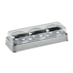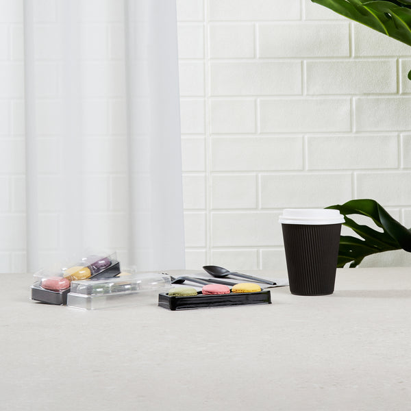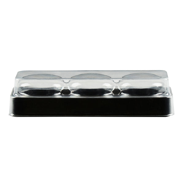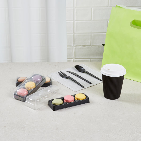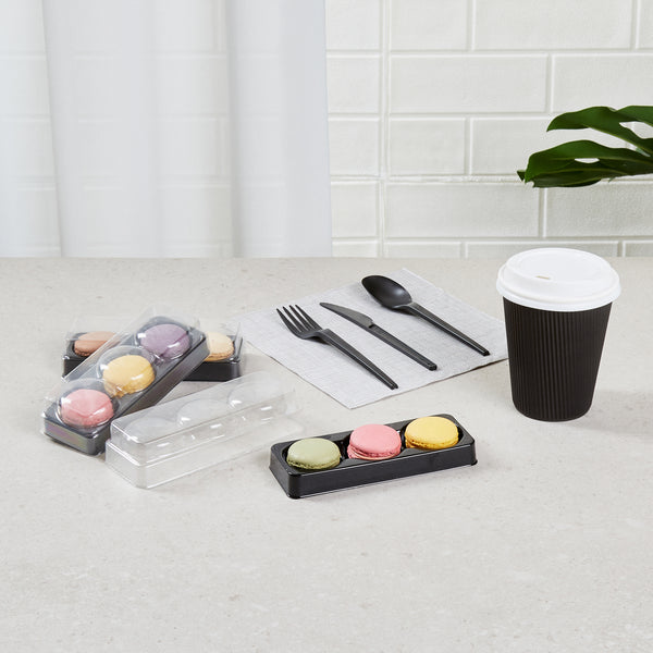 Securely pack your decadent macarons in our Shock Safe Rectangle Black Plastic Macaron Take Out Boxes. These durable macaron boxes are made of recyclable PET plastic, to safely dispose of after consuming the contents inside. Perfect for packaging all macaron flavors, the sleek black tray of each macaron box fits 3 macarons at a time. Designed with three layers of shockproof technology, these macaron-to-go boxes ensure that your pastries remain undamaged during delivery. These French macaron boxes come with a formfitting cover that securely holds macarons of all sizes in place. Equipped with a tight, clear lid, these macaron cases shield your delicate treats from breaking or spilling out while being transported. Measuring 5.75 inches long by 2.25 inches wide by 1.5 inches tall, these rectangle macaron containers are perfect for bakeries or pastry shops. Shipped in a 100 count box.