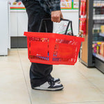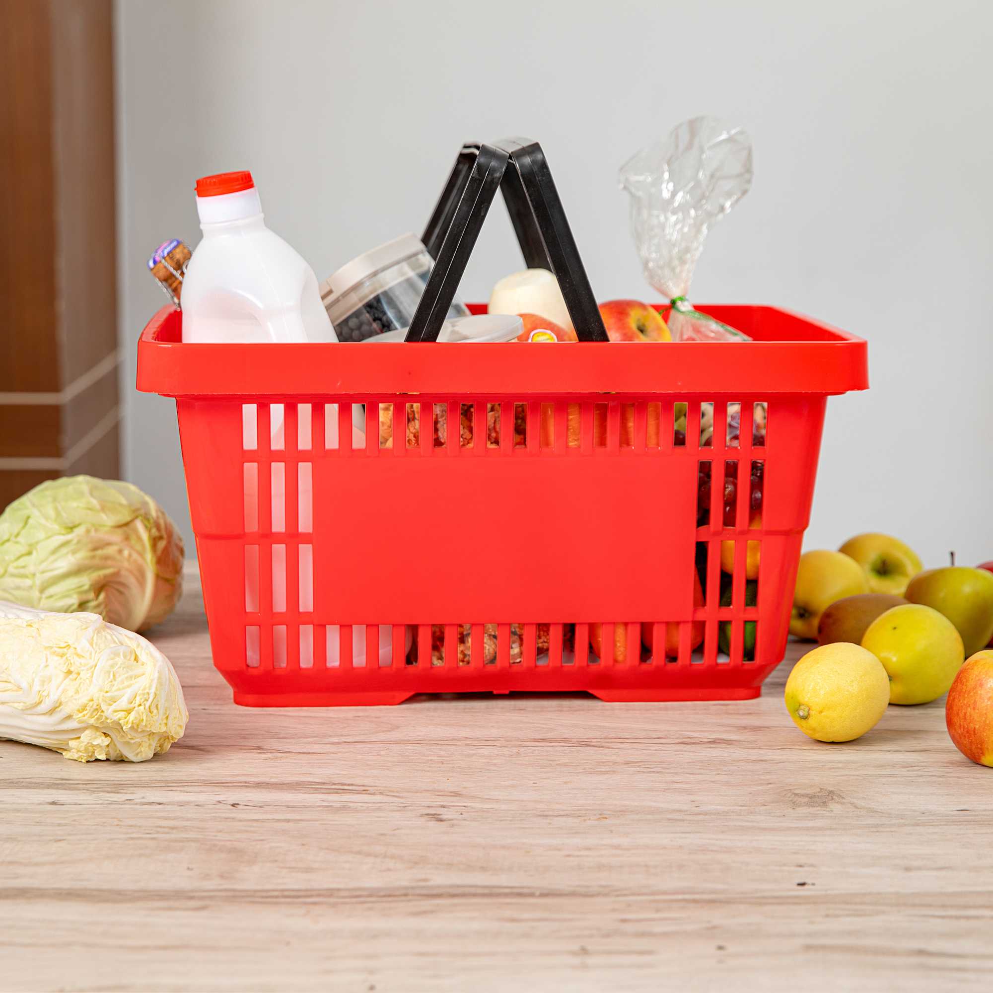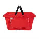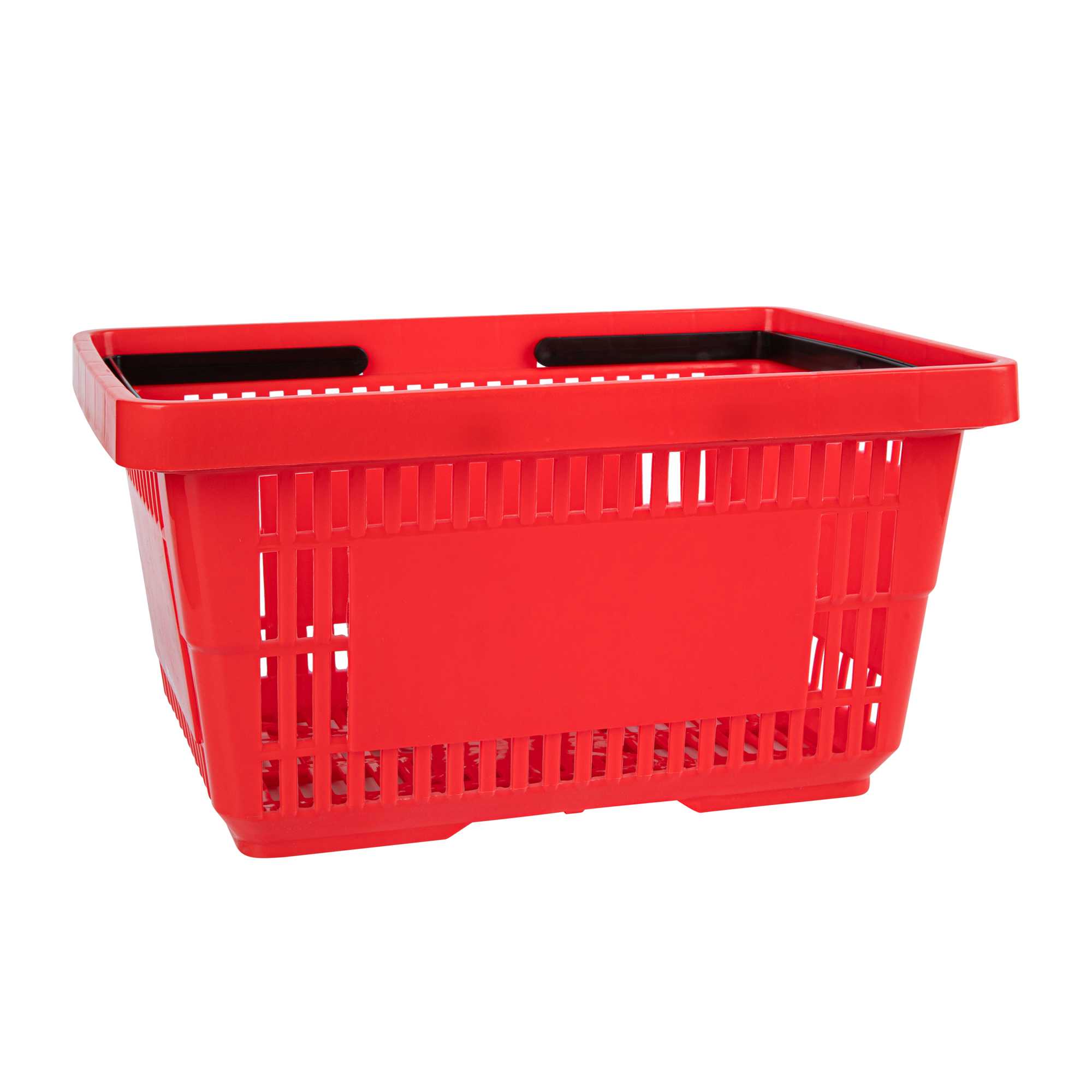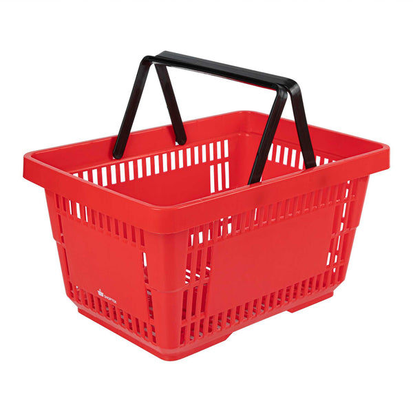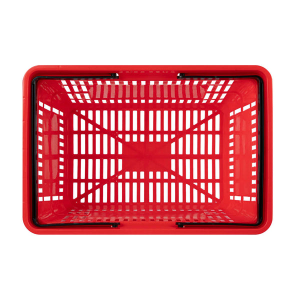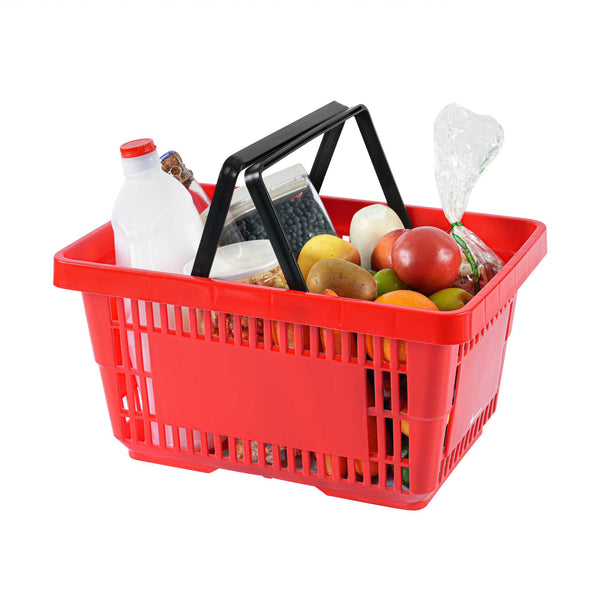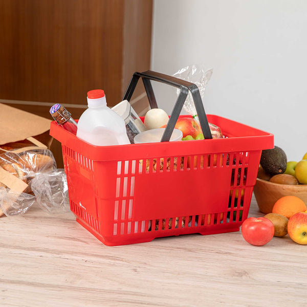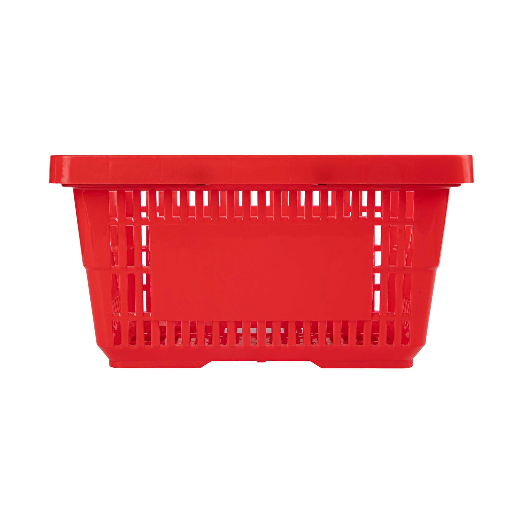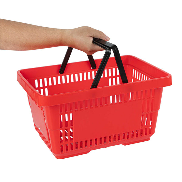 Simplify store operations with stackable, easy-to-clean baskets. The Shop Tek Plastic Shopping Basket combines durable plastic construction with a practical, space-saving design, perfect for high-traffic environments. Its sturdy plastic build withstands everyday use at grocery stores, markets, and retail shops, while the stackable design ensures efficient storage between uses. Its inner dimensions of 16.93 inches by 11.61 inches by 9.05 inches efficiently hold various groceries, ensuring smooth workflow and customer satisfaction in retail settings. Equipped with strong black handles, this grocery shopping basket offers a comfortable grip, making it easy to carry even when filled with items. The vibrant red color scheme enhances visibility. Streamline your market basket needs with this lightweight and resilient choice. Each order includes 10 Shop Tek Plastic Shopping Baskets.