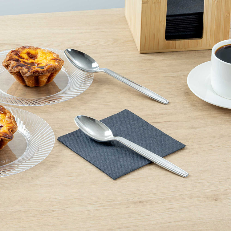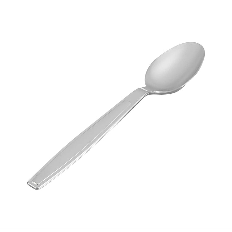 Our Argento Silver Plastic Spoons are great for enjoying delicious entrees and desserts. Made from high-quality plastic, these silver plastic spoons are recyclable, break-resistant, and guarantee quick and easy cleanup. Featuring a sleek silver finish, these disposable spoons instantly upgrade the look of dishes served at your restaurant, bistro, catered event, and more. Use this disposable silverware to pair with savory soups served at your restaurant, or to serve sweet desserts at your bakery. Complete this plastic cutlery set with our coordinating forks and knives (SKU: RWP0098S & RWP0099S). Each of these plastic spoons measures 7 inches long by 1.3 inches wide and will ship in a 250-count box.