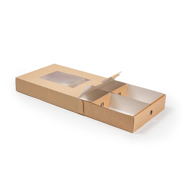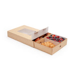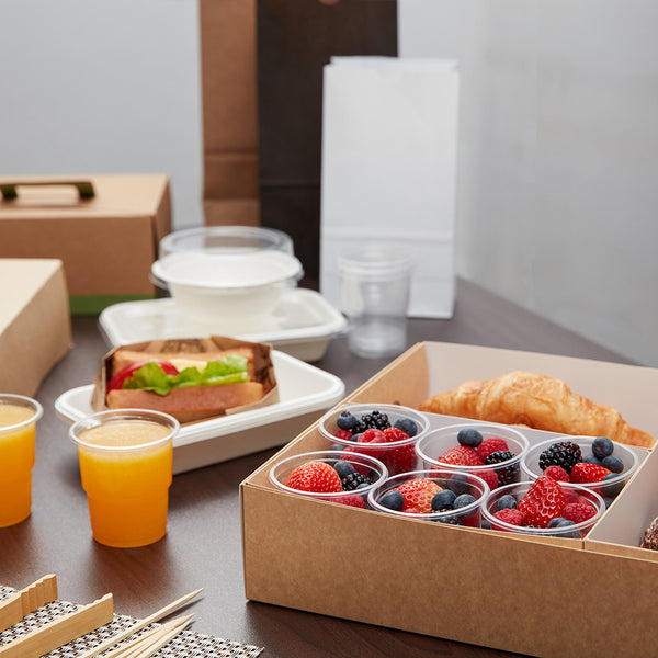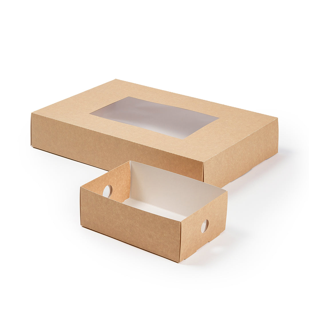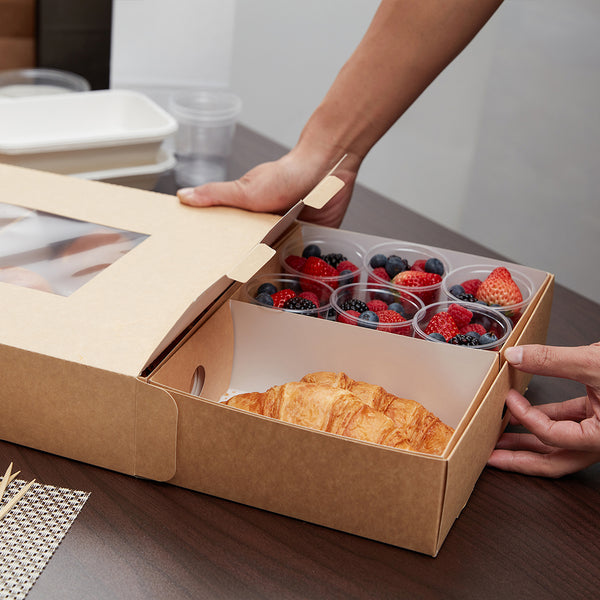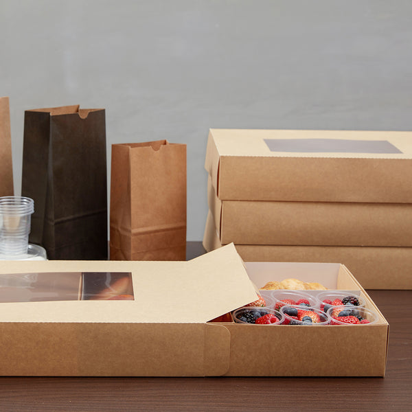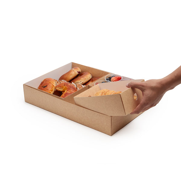 Prevent appetizers and baked goods from mixing together during transport with our Slide Tek Rectangle Kraft Paper Small Inserts. These catering tray inserts have high, sturdy walls that are designed to keep meals securely stored in our coordinating catering boxes (SKU: RWA0866K). With a grease-resistant lining, these small catering tray inserts allow you to package saucy sandwiches or oily pastries without food wraps. These rectangle catering tray inserts are made from durable kraft paper that is designed to contain hefty meals without folding or breaking. Each kraft catering box insert can be conveniently recycled for easy and eco-friendly cleanup after your client's catered event. These tray inserts measure 8.75 inches long by 6 inches wide by 3.25 inches tall and are shipped flat for space-efficient storage in your catering van, storage shelf, or kitchen. Up to 4 of these small catering tray inserts can fit inside of our compatible catering tray. Solid in a 10 count box. Catering trays are available and sold separately.