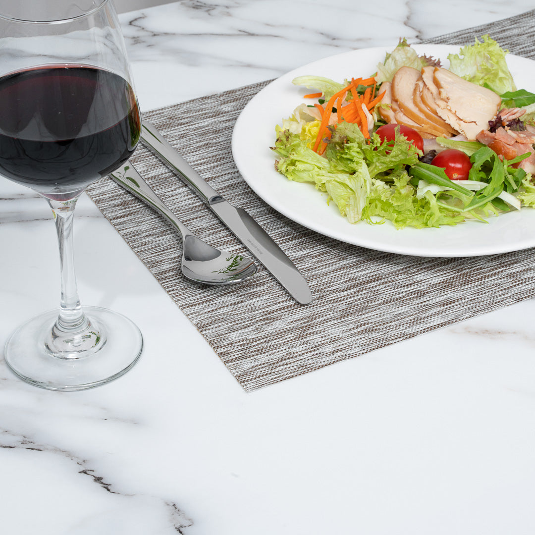 Add an elegant touch to table settings using our Sovereign Rectangle Light Brown Vinyl Woven Placemats. Made with high-quality vinyl, these large table mats are designed to be conveniently re-used or disposed of after use for easy cleanup. These dining mats have an intricately woven design that cushions plates to lower noise levels while bringing a modern look to tables. Great for protecting surfaces against messy spills, these brown placemats are stain-resistant. These large table mats have a light brown finish to complement the decor found at your restaurant or catered event. To conveniently reuse these brown placemats and maintain their premium appearance, simply wipe and handwash them. These dining mats measure 16 inches in length by 12 inches in width. Sold in a 6 count box. Due to the woven design of these placemats, there may be slight color variations.