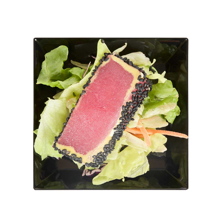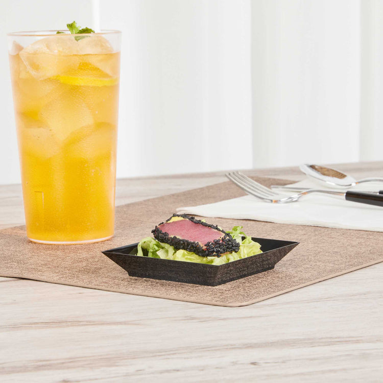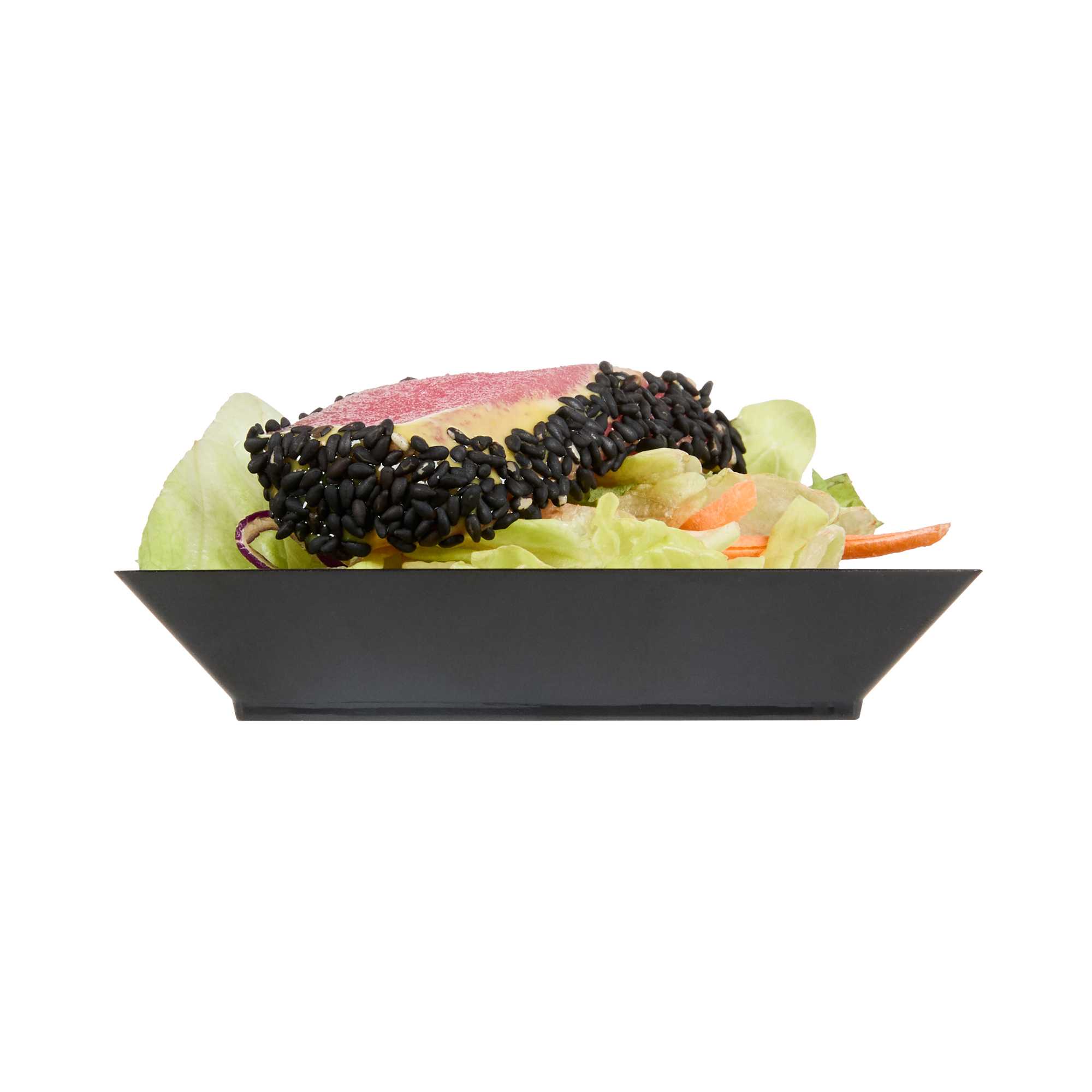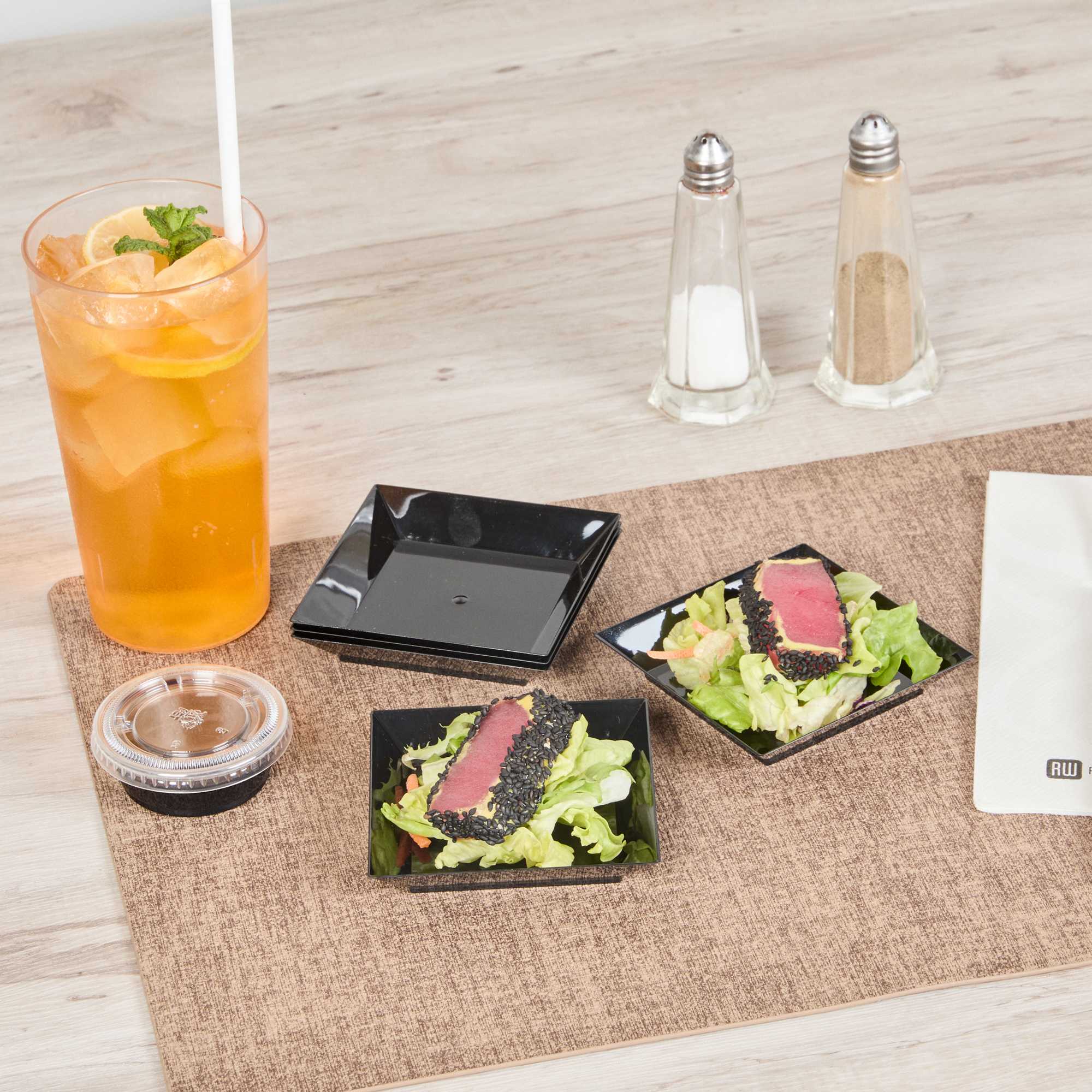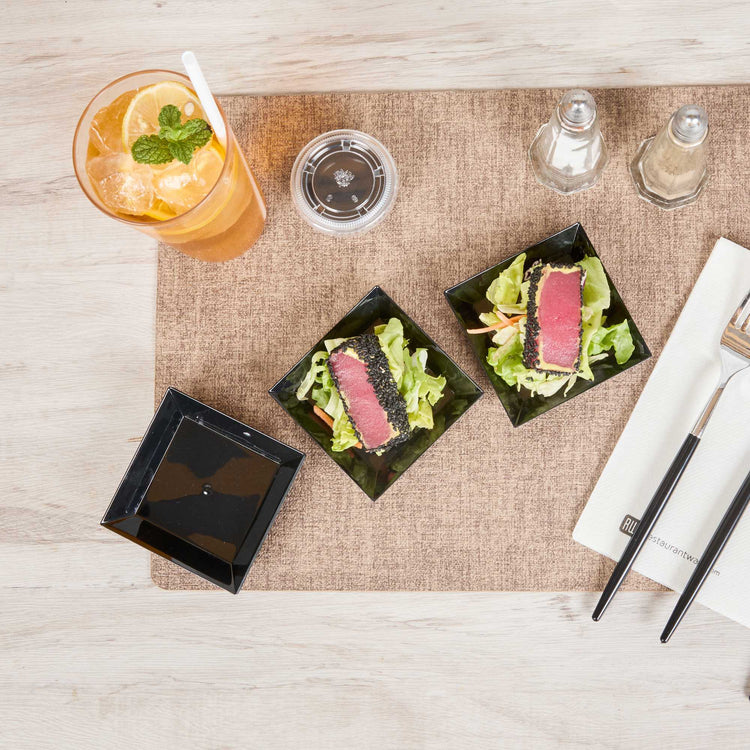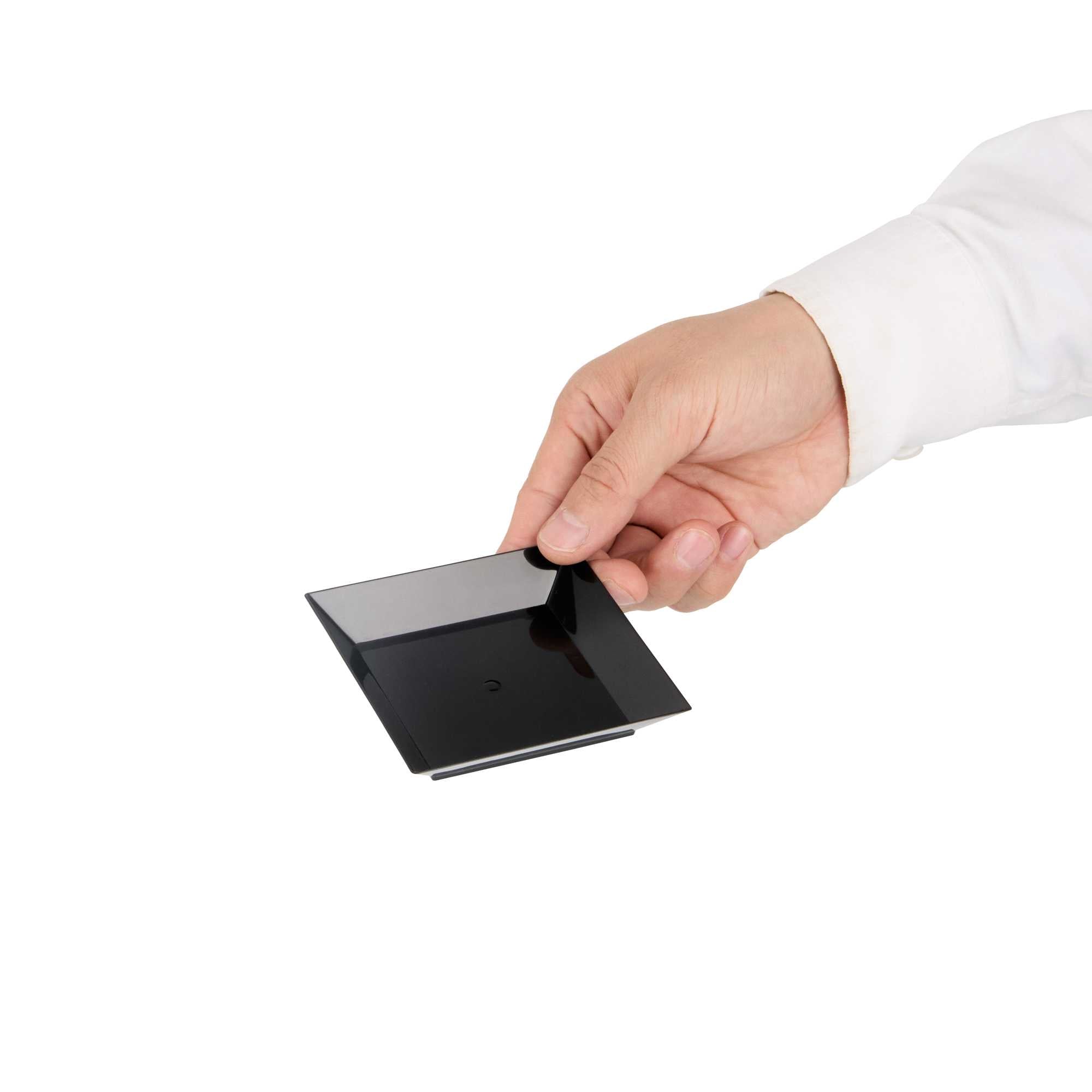 Artfully plate unique appetizers using our Mini Serve Square Black Plastic Small Modern Plates. Perfect for catering events, banquets, or restaurants, these sturdy disposable plates are made from high-quality plastic and are recyclable for an easy and eco-friendly cleanup. Featuring a squared design and glossy black finish, these square appetizer plates add a high-end look to small servings of stuffed dates, canapes, and tarts. The raised edges of these black plastic plates are ideal for mess-free serving. To keep dishes intact and stop spills, these disposable plates are crack-resistant and leak-resistant. These square appetizer plates can be stacked together for easy space-saving storage. Measuring 3.9 inches in length by 3.9 inches in width, these black plastic plates are sold in a 100 count box.