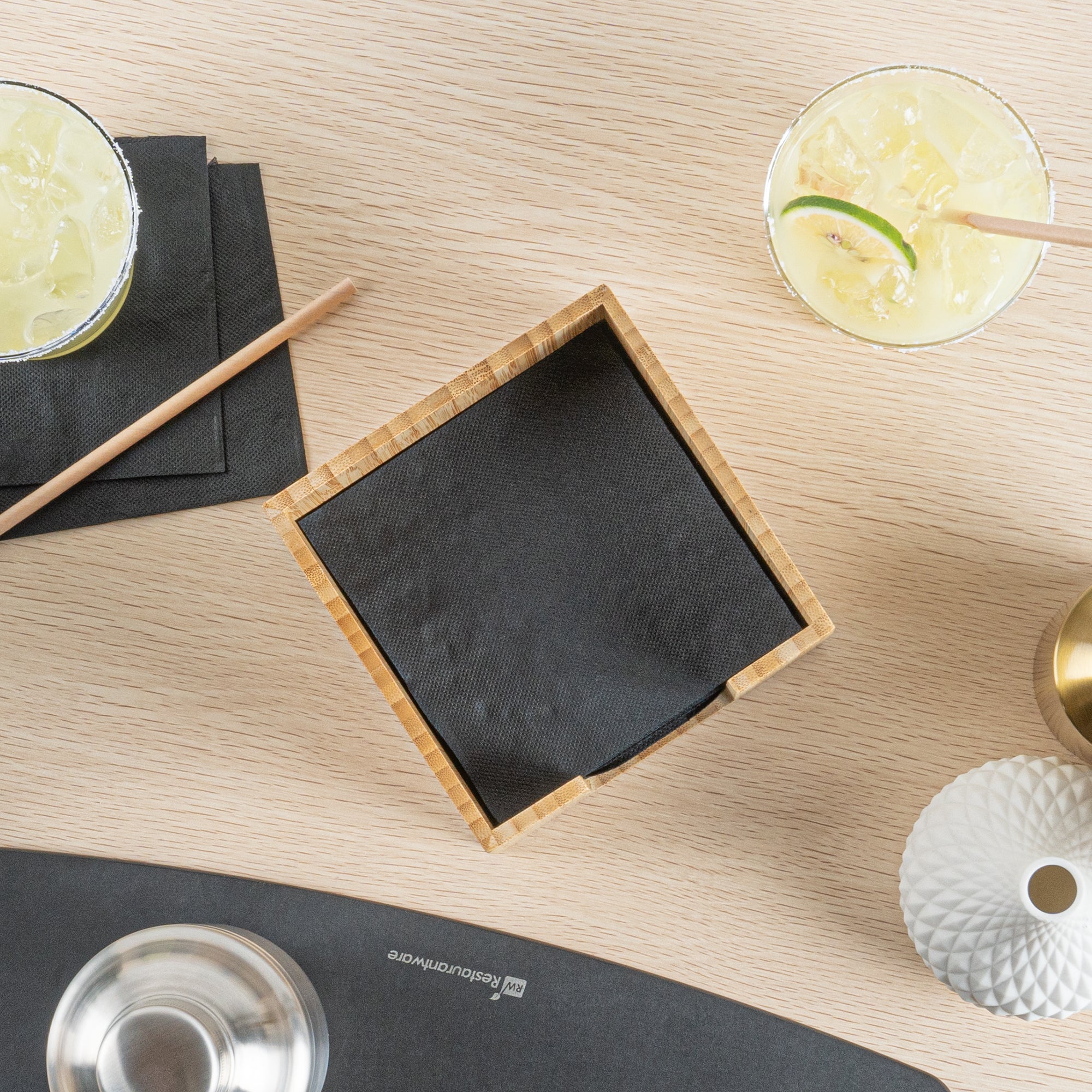 - Square shape fits cocktail napkins for efficient service