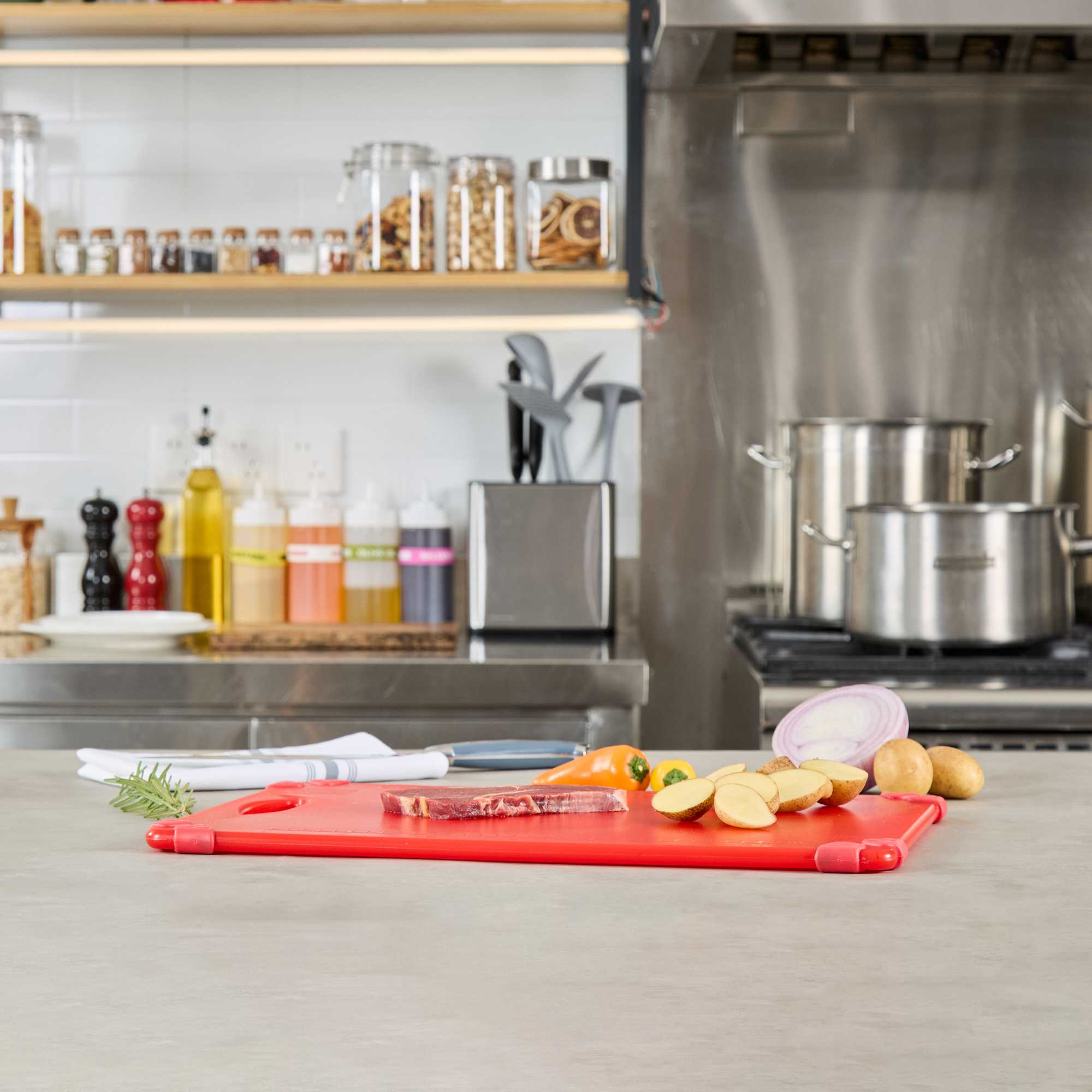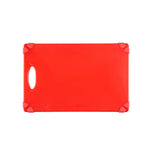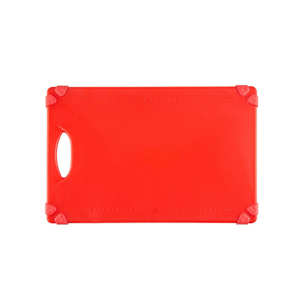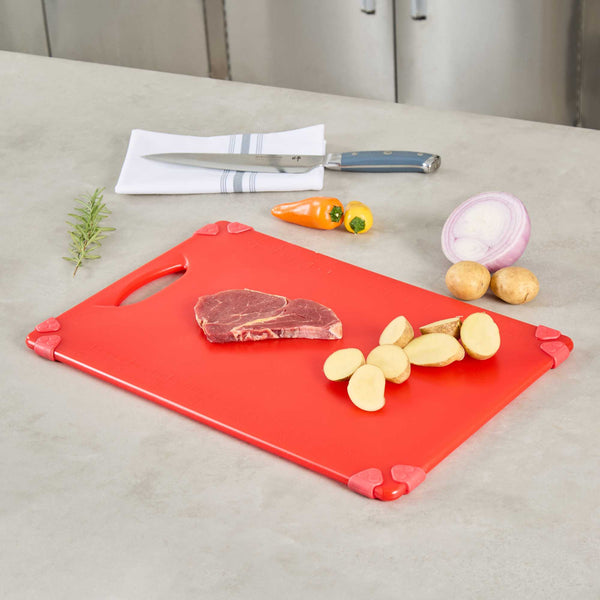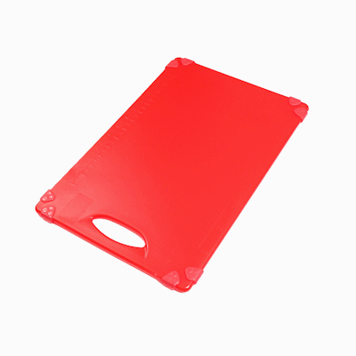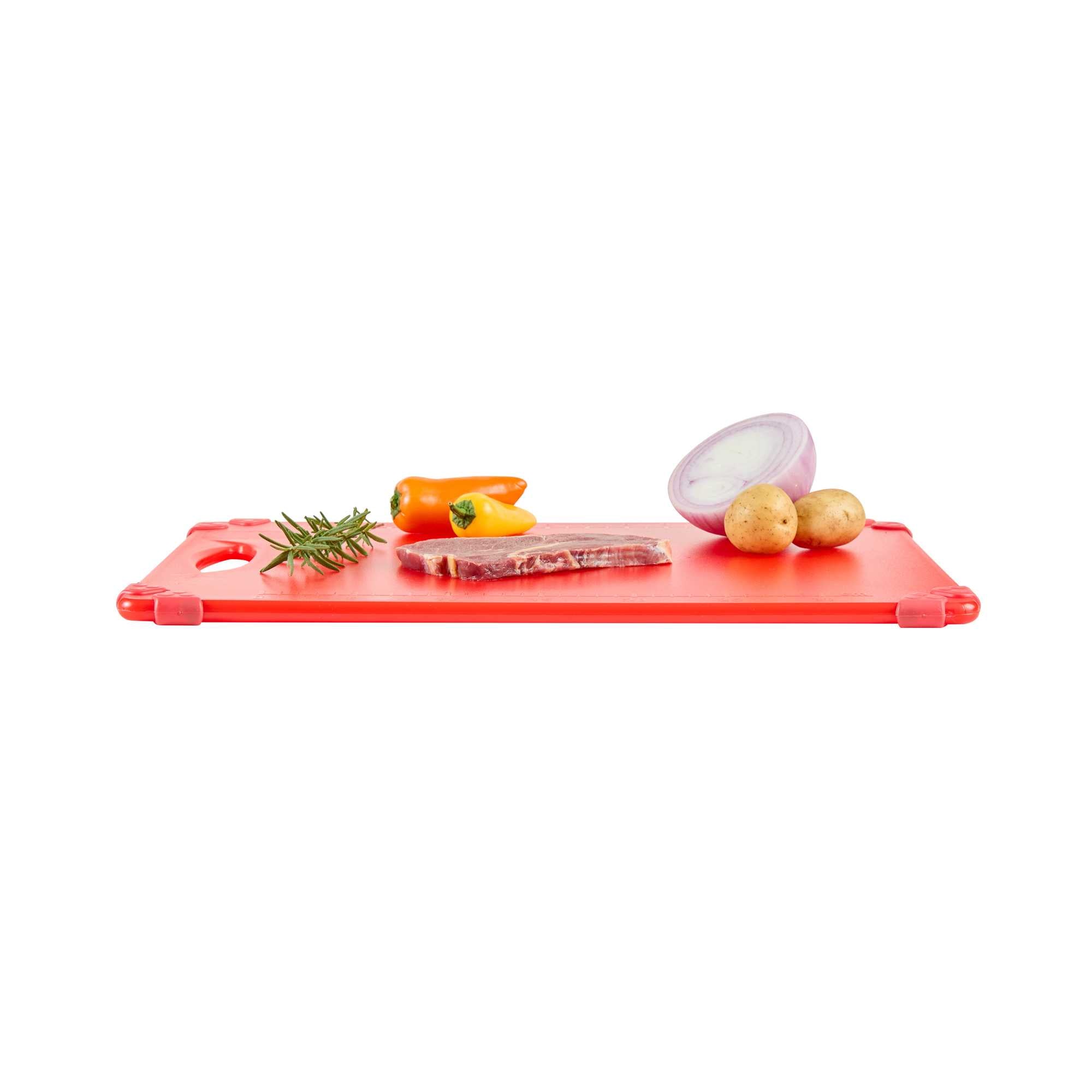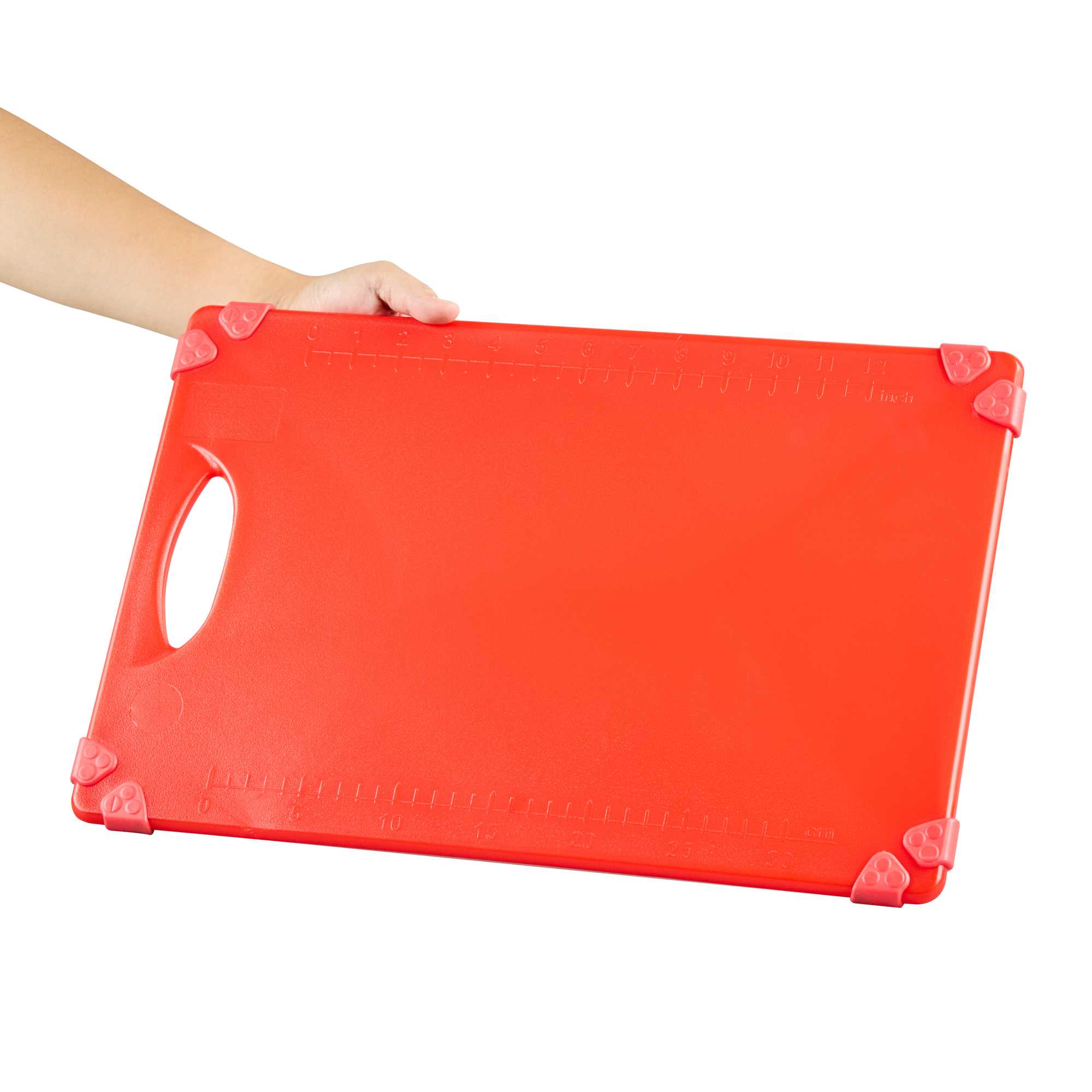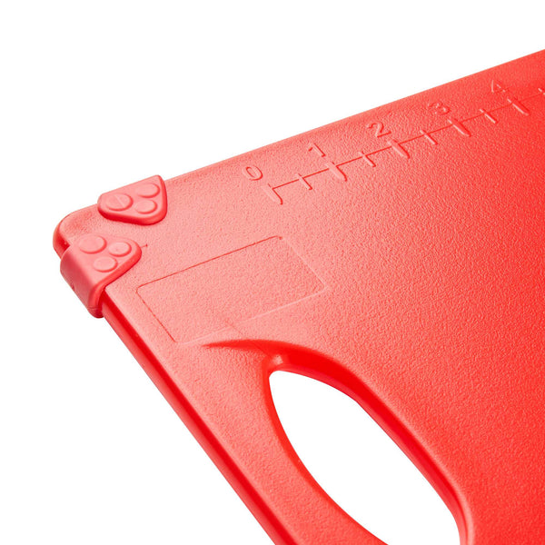 Our Red Sure Grip Commercial Grade Non-Slip Cutting Board has all the features you've been looking for. This 12-inch long red cutting board is equipped with embossed inch and centimeter measurement markers on either side for quick and easy portion control. Featuring 4 non-slip grips on each corner, this 18-inch wide plastic cutting board provides slip-resistant control on wet and greasy countertops. With a convenient handle, this kitchen cutting board is easy to transport and store in your restaurant, hotel bar, catering event, and more. Made from durable plastic, this handy cutting board protects your countertops and keeps your knives nice and sharp. This red chopping board is intended for raw meats and is color-coded to ensure your staff knows which cutting board to use for which ingredients. Take a look at our line of Sure Grip Cutting Boards to fulfill your kitchen's cutting board needs. This 12-inch by 18-inch cutting board is available in a 1 count box.