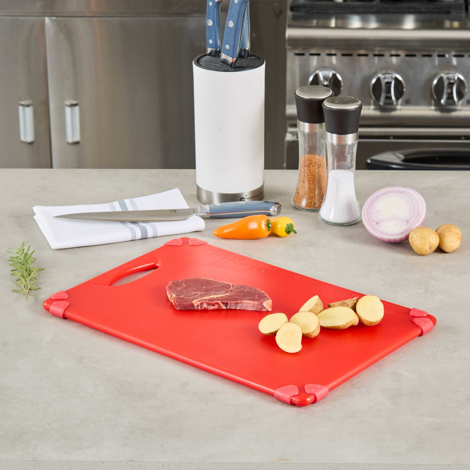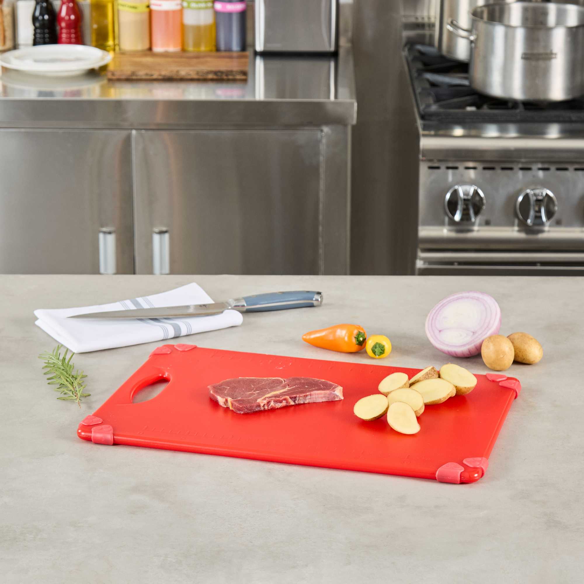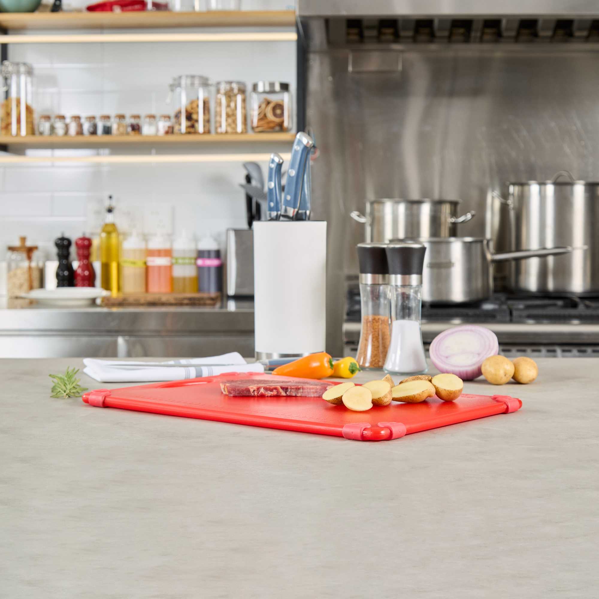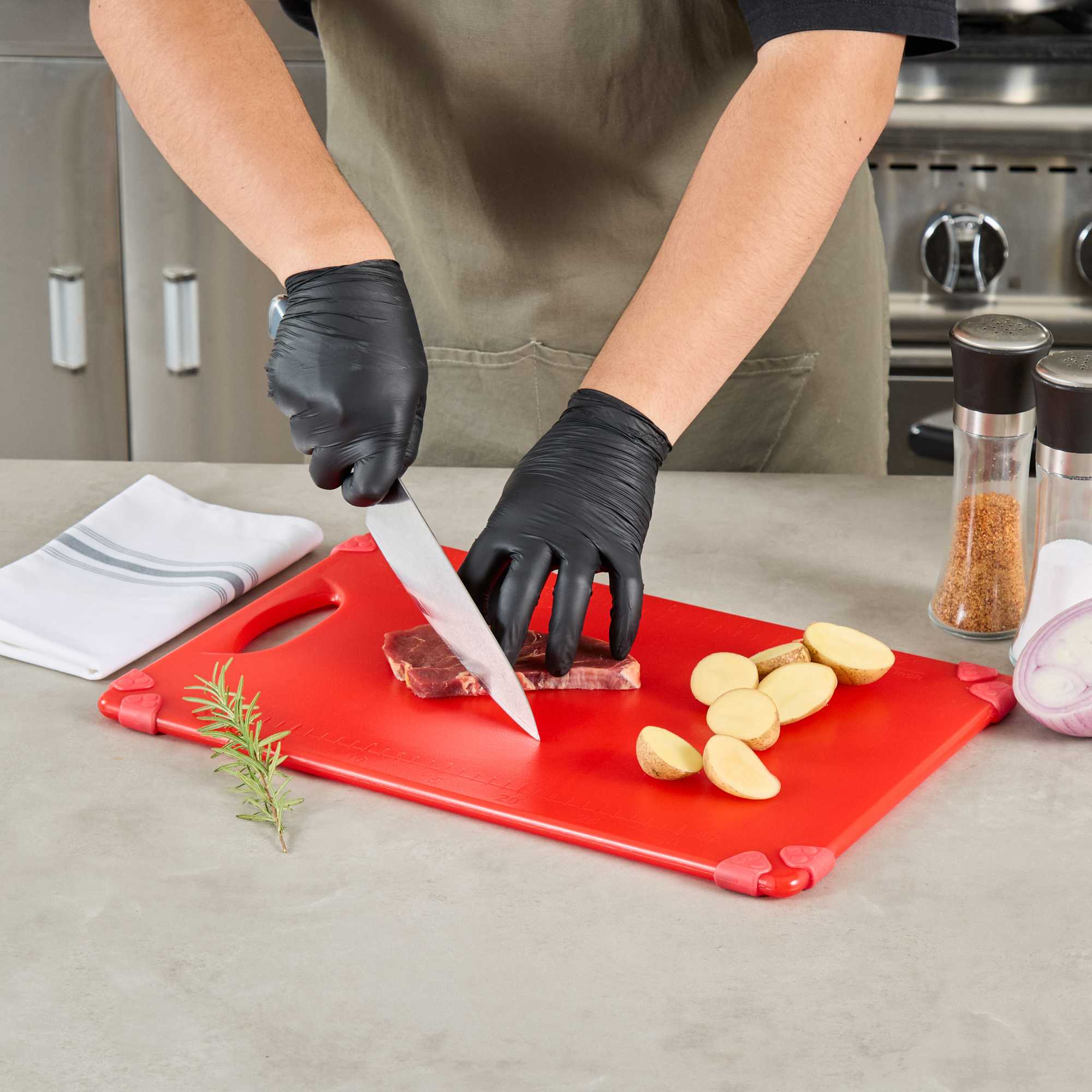 Our Red Sure Grip Commercial Grade Non-Slip Cutting Board has all the features you've been looking for. This 12-inch long red cutting board is equipped with embossed inch and centimeter measurement markers on either side for quick and easy portion control. Featuring 4 non-slip grips on each corner, this 18-inch wide plastic cutting board provides slip-resistant control on wet and greasy countertops. With a convenient handle, this kitchen cutting board is easy to transport and store in your restaurant, hotel bar, catering event, and more. Made from durable plastic, this handy cutting board protects your countertops and keeps your knives nice and sharp. This red chopping board is intended for raw meats and is color-coded to ensure your staff knows which cutting board to use for which ingredients. Take a look at our line of Sure Grip Cutting Boards to fulfill your kitchen's cutting board needs. This 12-inch by 18-inch cutting board is available in a 1 count box.