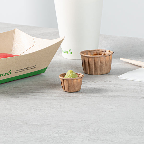 Upgrade your foodservice with our Sustain 0.5-ounce Kraft Paper Portion Cups. These paper condiment cups are commercially compostable and biodegradable, providing an eco-friendly alternative to traditional plastic. Made from premium paper, these condiment cups are durable and ideal for holding ketchup, mustard, mayonnaise, honey, and more. Perfect for serving samples, these versatile paper ketchup cups make an excellent choice for events, tastings, and food promotions. The kraft finish of these ketchup cups complements your food presentation, adding a rustic and appealing touch. For straightforward cleanup, these disposable sauce cups can be tossed after use. With a capacity of 0.5 ounces, these paper sauce cups measure 1.26 inches in diameter by 0.87 inches in height. Sold in a 2,000 count box. These items will only degrade outside of the traditional solid waste stream.