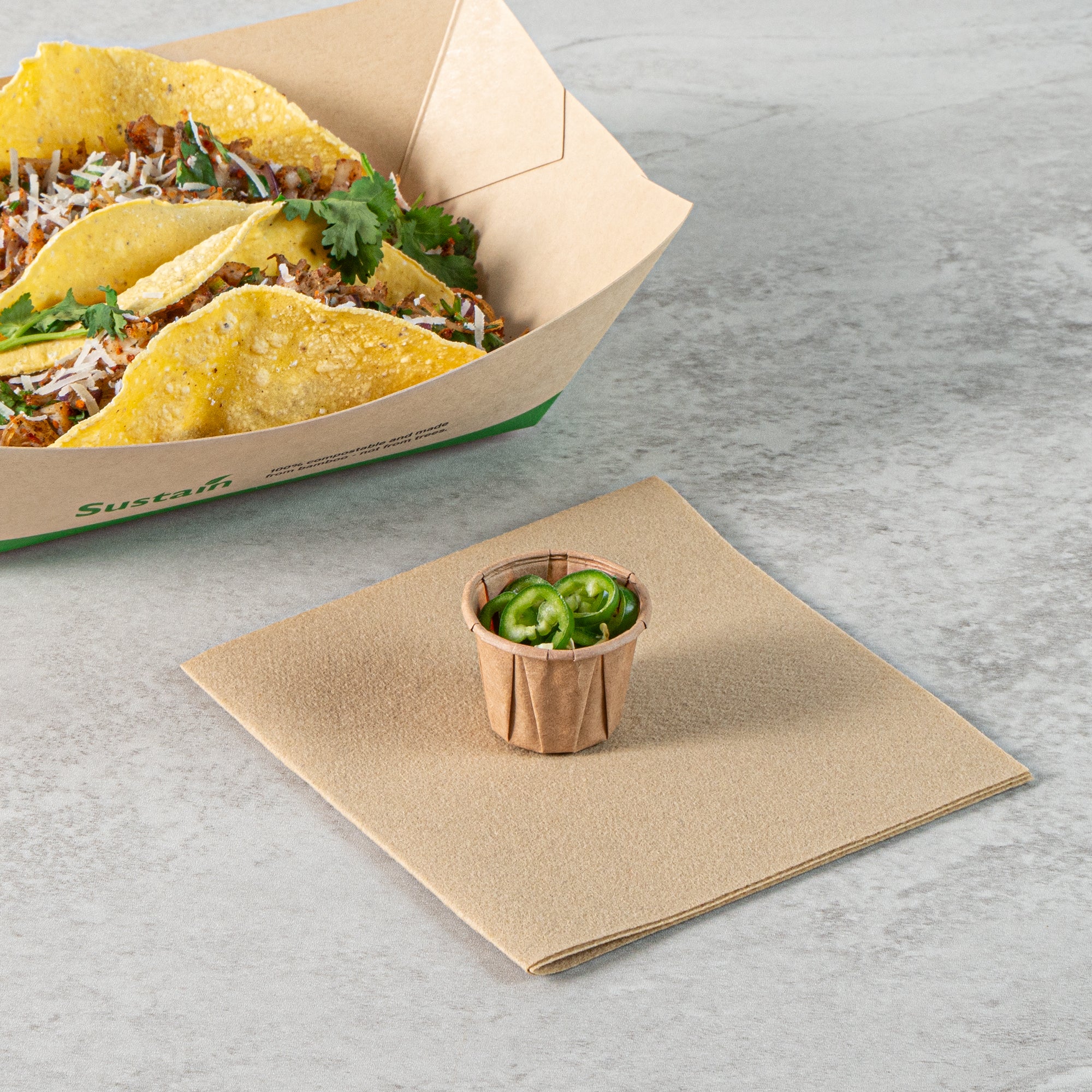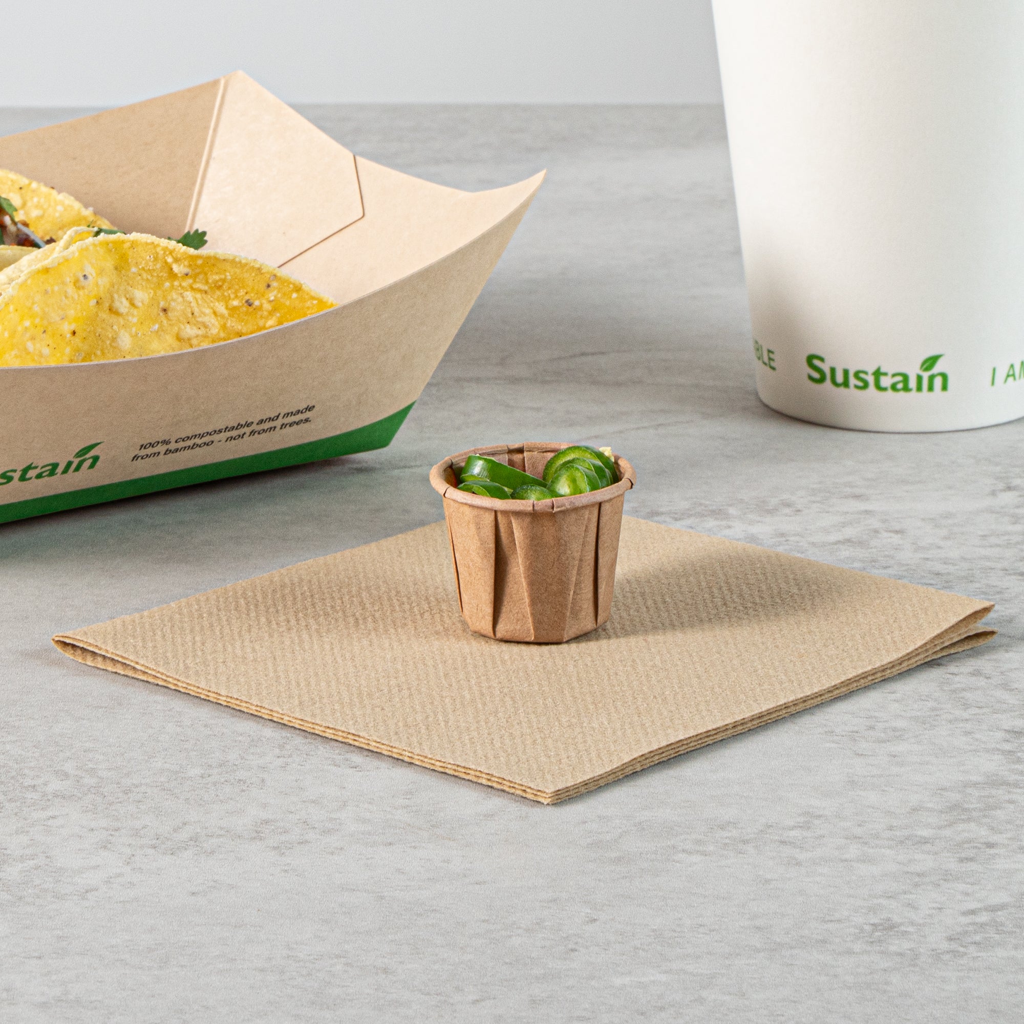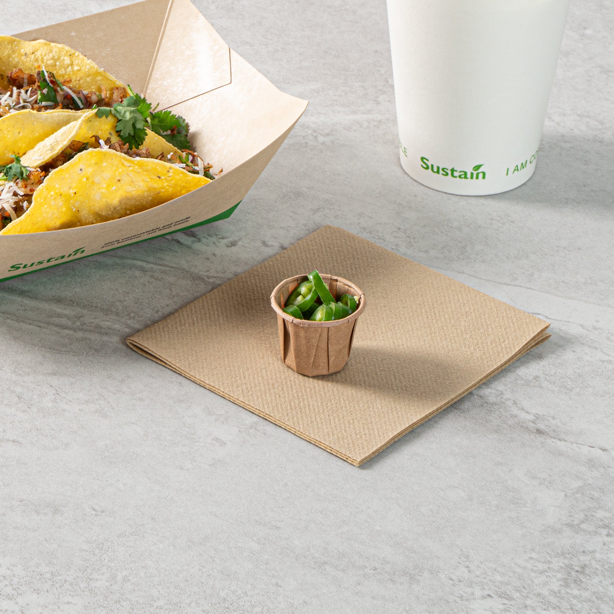 Elevate your food presentation with our Sustain 0.75-ounce Kraft Paper Portion Cups. These paper condiment cups are commercially compostable and biodegradable, offering an eco-friendly alternative to traditional plastic options. Crafted from premium paper, these durable condiment cups are perfect for holding ketchup, mustard, mayonnaise, honey, and more. These paper sauce cups are versatile and ideal for serving samples at events, tasting, and food promotions, providing a neat food display. The kraft finish of these sauce cups enhances the appearance of your food presentation. For easy cleanup, these paper ketchup cups are disposable and can be tossed after use. Each ketchup cup has a capacity of 0.75 ounces and measures 1.34 inches in diameter by 1.1 inches in height. Sold in a 100 count box. These items will only degrade outside of the traditional solid waste stream.