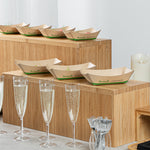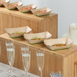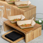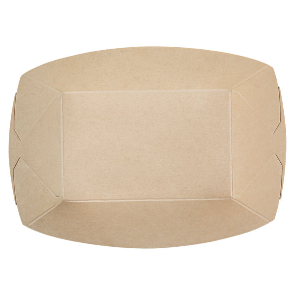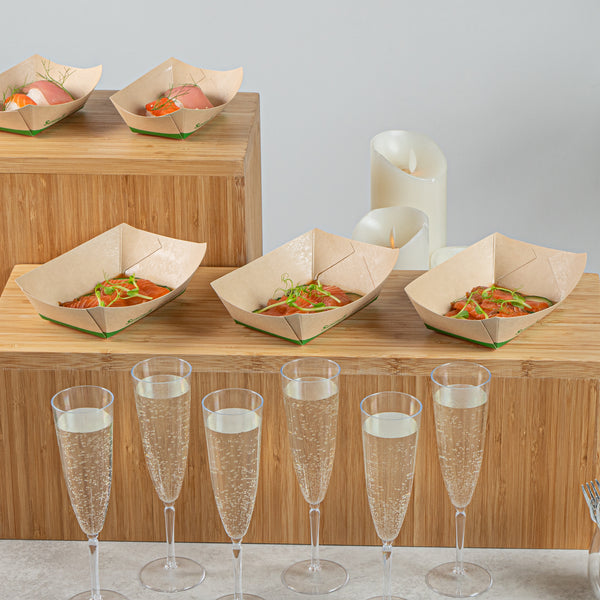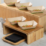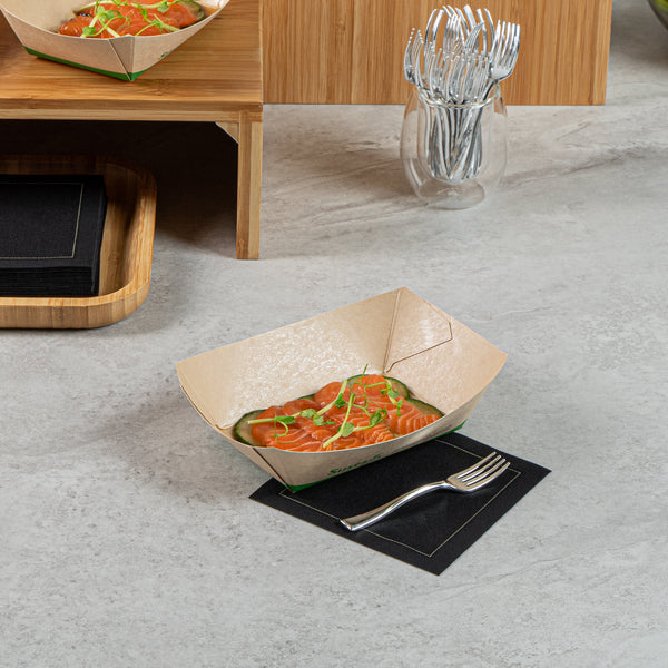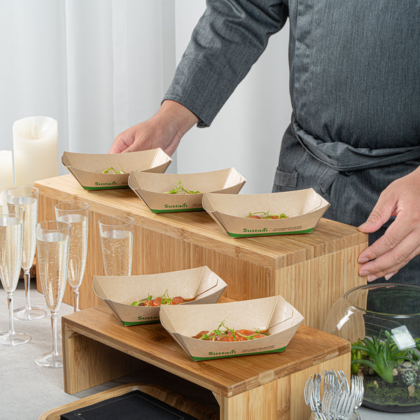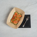 Effortlessly serve and showcase your culinary creations with our Sustain Leak-Resistant Kraft Disposable Food Boat. Designed with a PLA lining, this disposable food boat prevents leaks, ensuring clean and efficient foodservice operations. Crafted from durable paper, it resists bending, maintaining the integrity of sampler presentations in any setting, whether at a bustling food truck or a catered event. Emphasizing sustainability, the boat's commercially compostable design aids in eco-friendly waste management, making it an ideal choice for businesses committed to reducing their environmental footprint. Measuring 4.2 inches in length, 2.7 inches in width, and 1.6 inches in height, this kraft-colored bamboo paper boat combines practicality with an attractive presentation. Upgrade your serving trays with these compostable serving trays and enjoy seamless service. Each order includes 400 Sustain Leak-Resistant Kraft Disposable Food Boats.